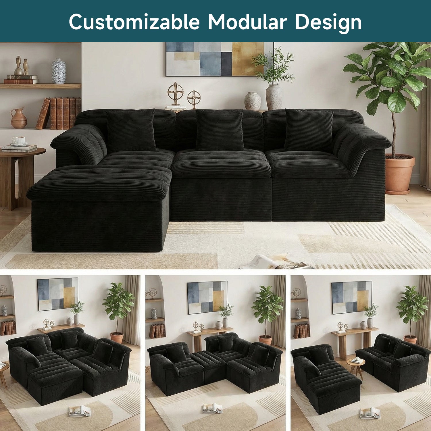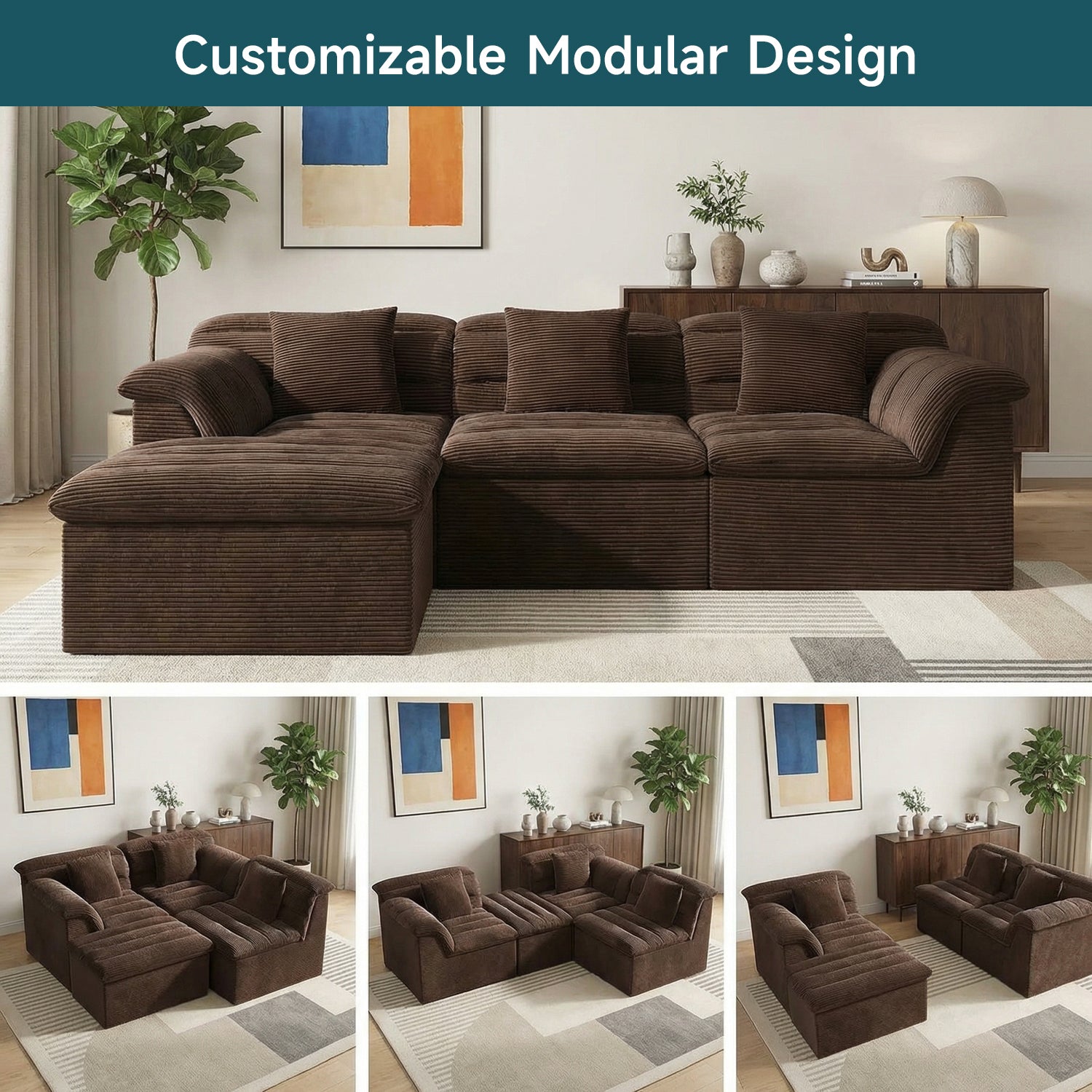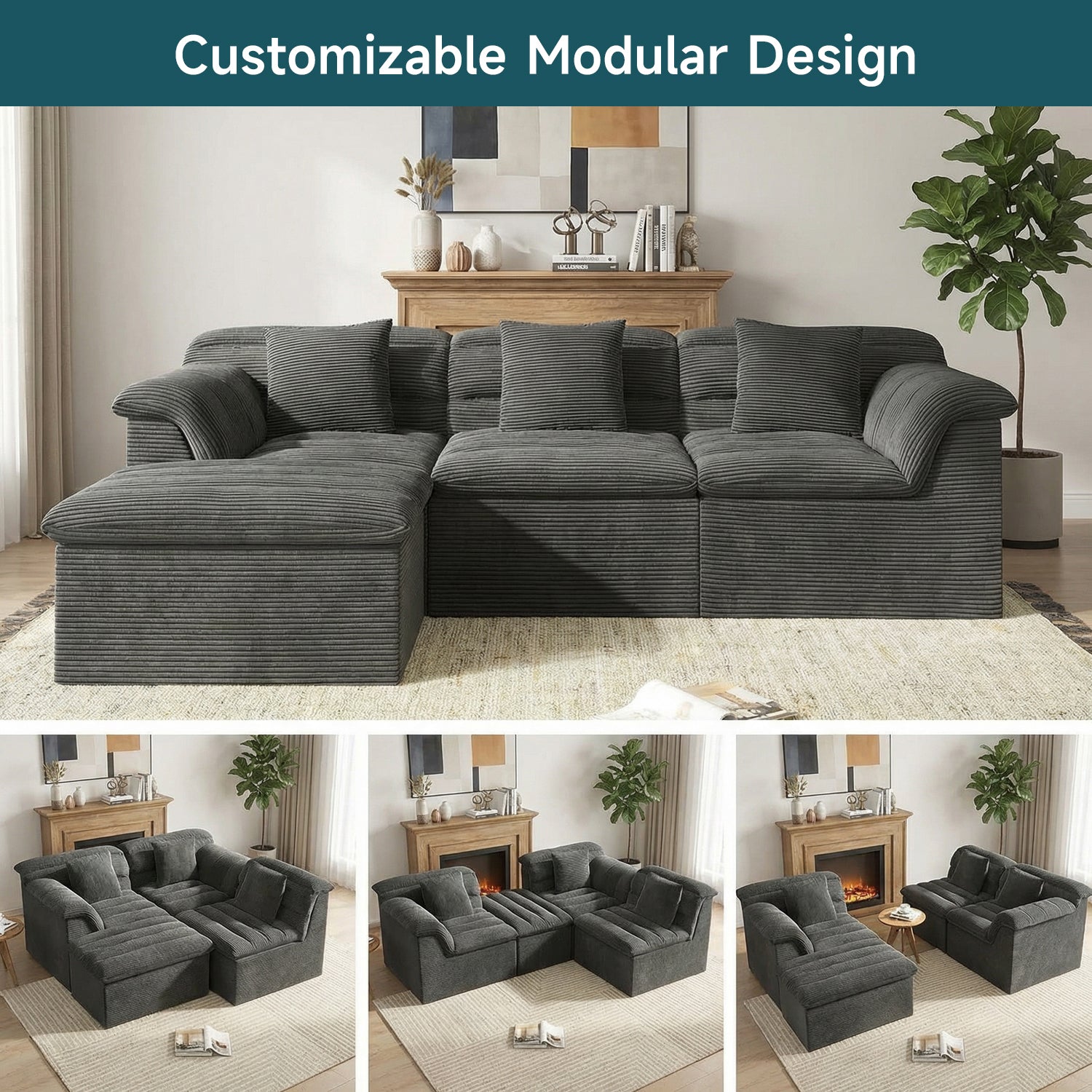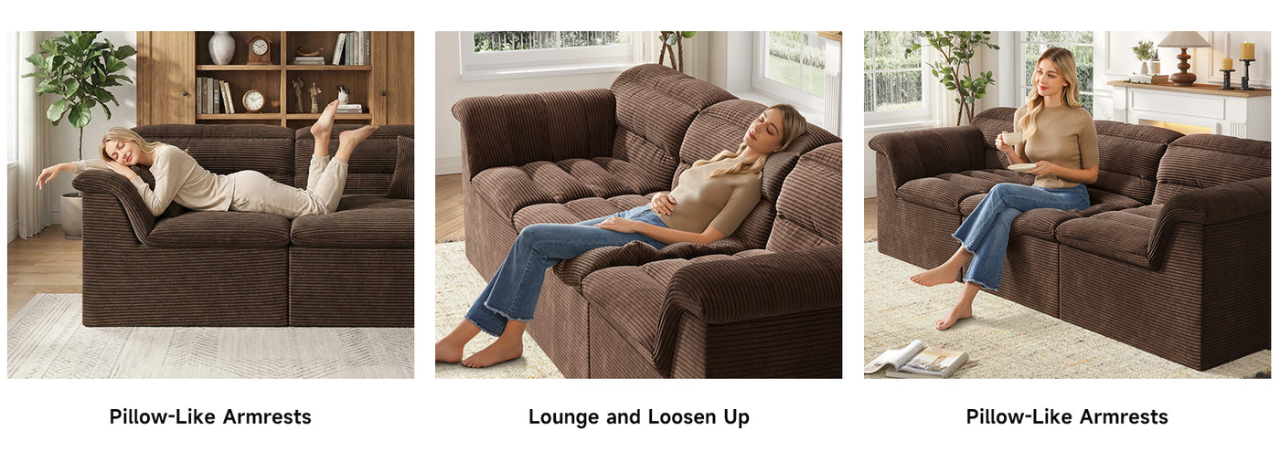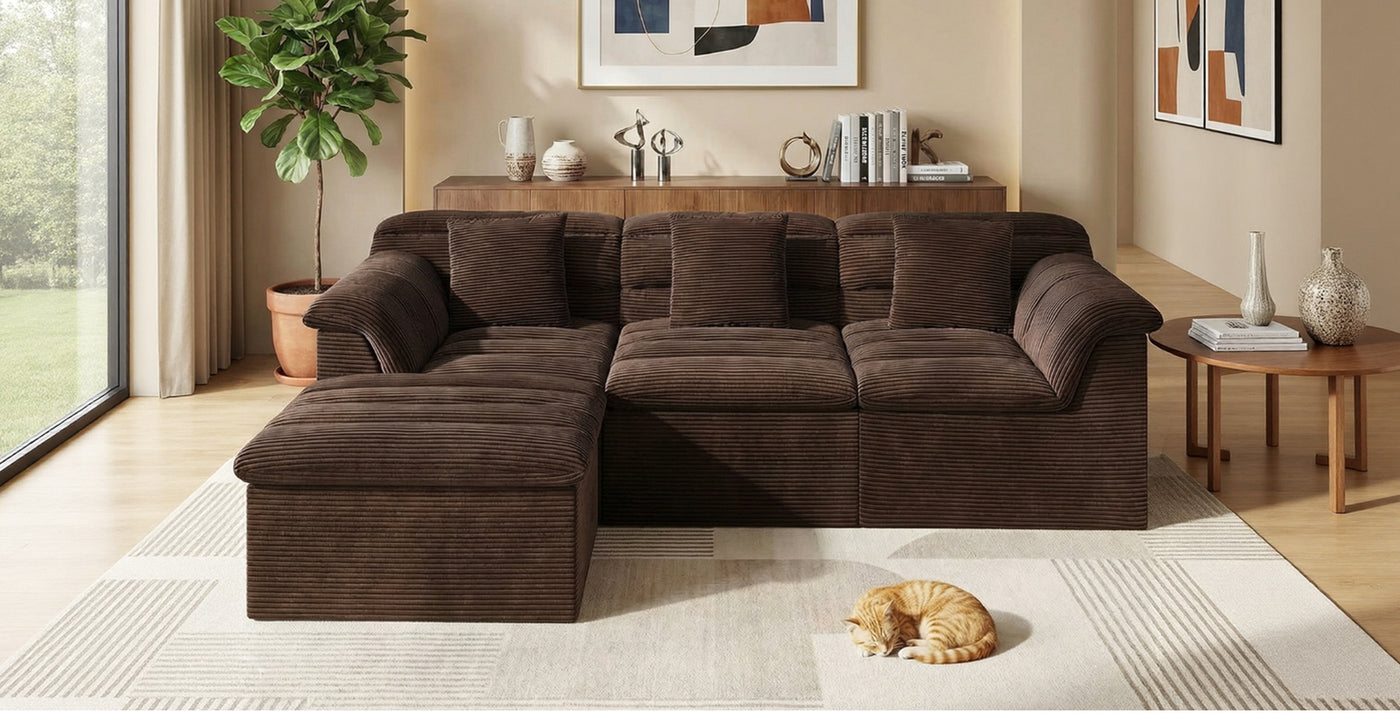 It features a flexible modular, boneless design that adapts easily to your lifestyle. With four individual sections, you can rearrange the sofa to create a cozy L-shape for movie nights, a relaxed chaise for stretching out, or an inviting setup for afternoon naps—giving you the freedom to change your space whenever you like.