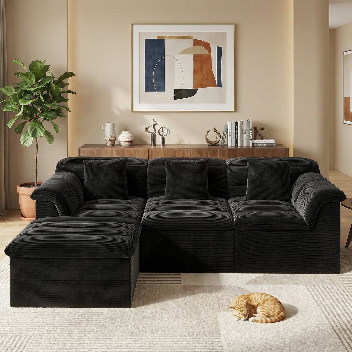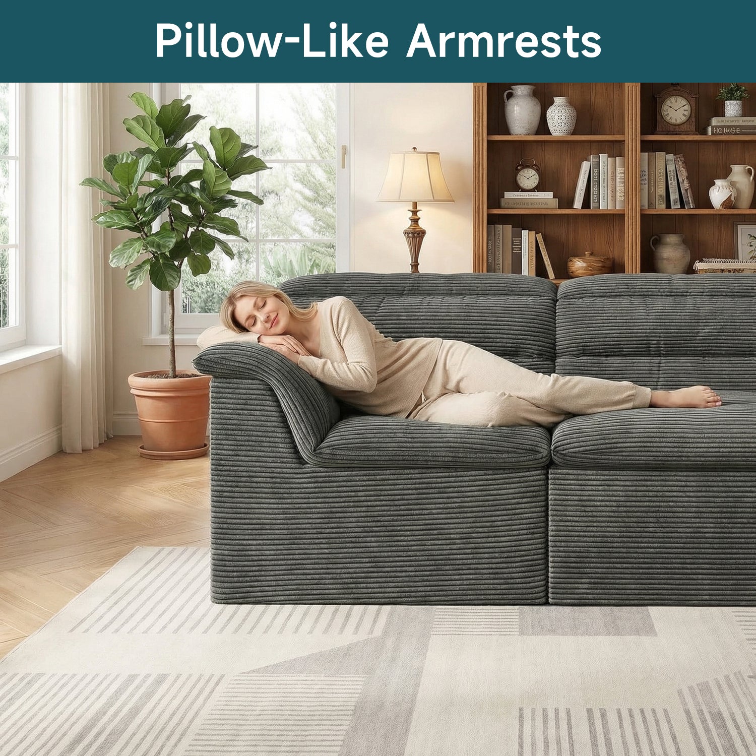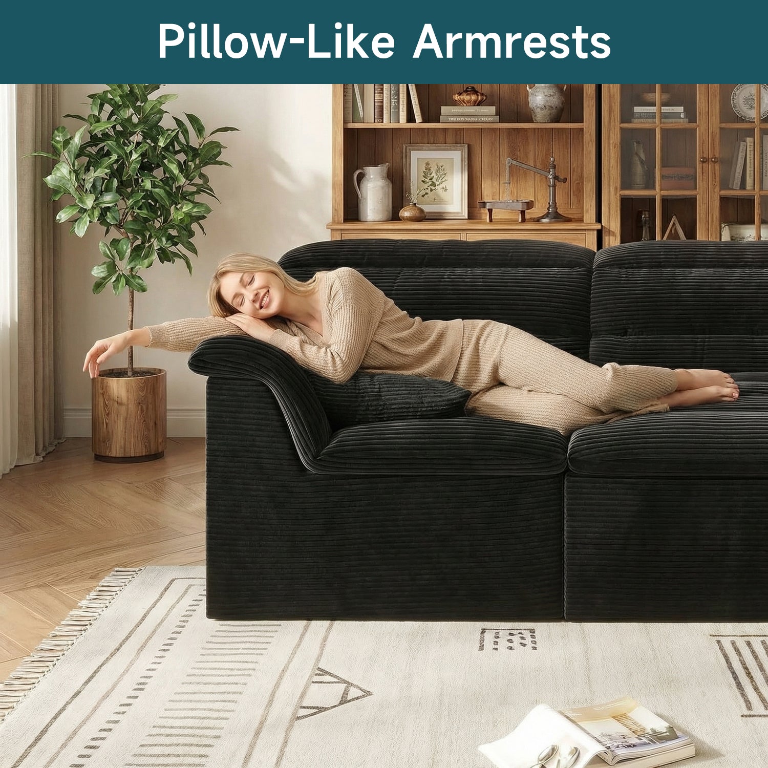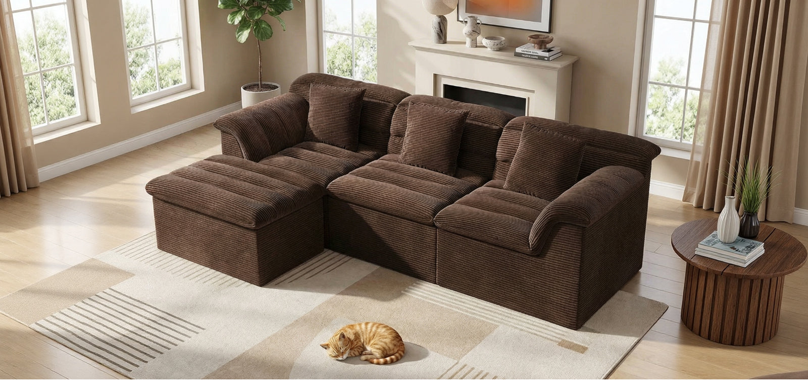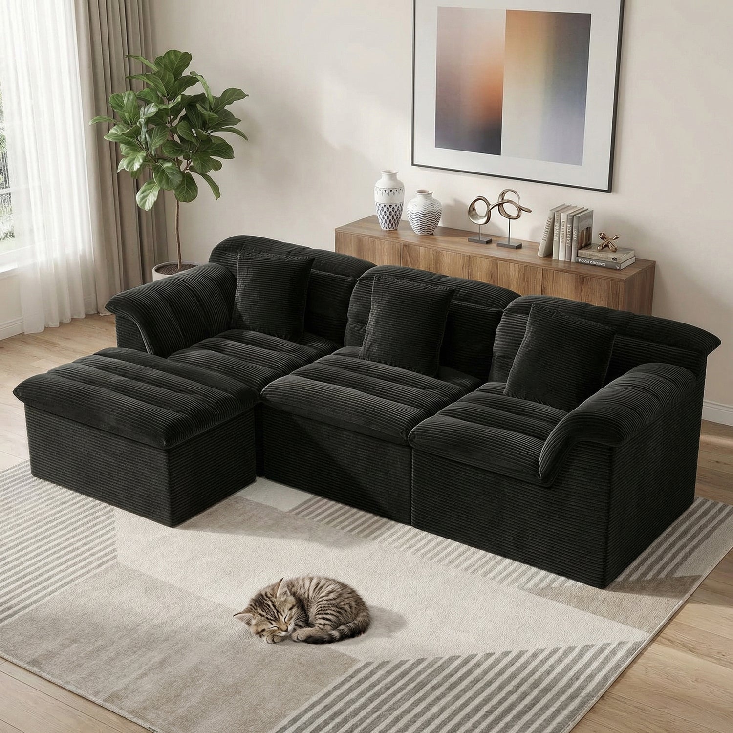 It features a flexible modular, boneless design that adapts easily to your lifestyle. With four individual sections, you can rearrange the sofa to create a cozy L-shape for movie nights, a relaxed chaise for stretching out, or an inviting setup for afternoon naps—giving you the freedom to change your space whenever you like.