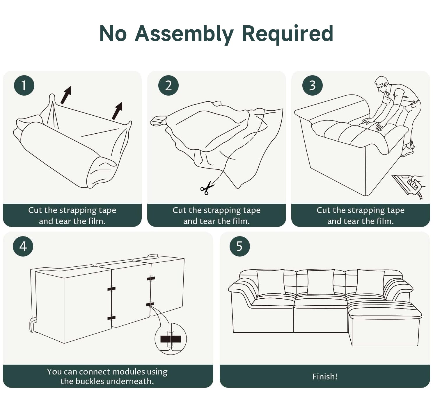 This modular cloud sectional sofa is designed for effortless comfort with absolutely no assembly required. Simply unbox it and let the sofa expand on its own—no tools, no complicated steps. It quickly regains about 80% of its shape and fully restores within 3–7 days, while a gentle pat on the cushions helps speed up the process.