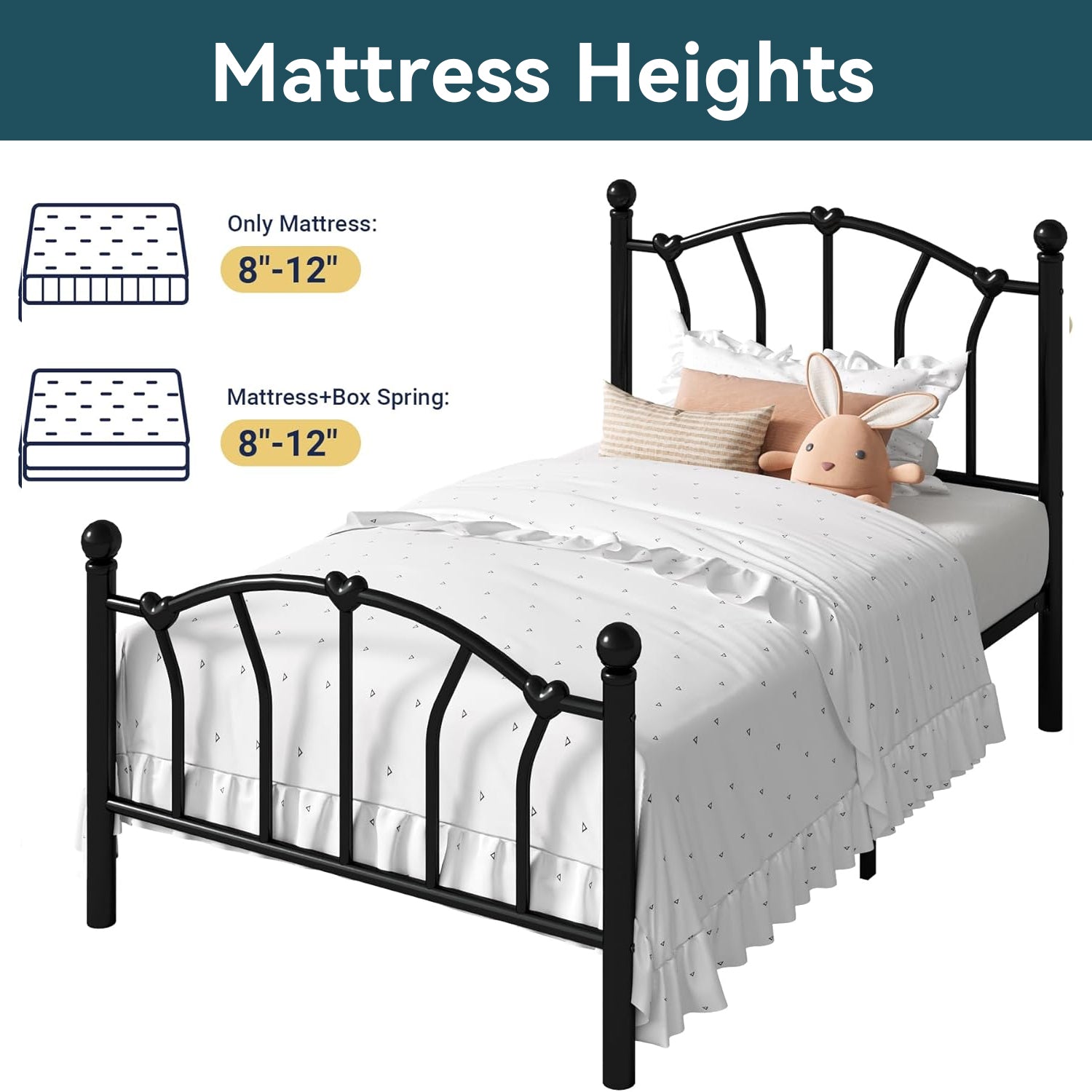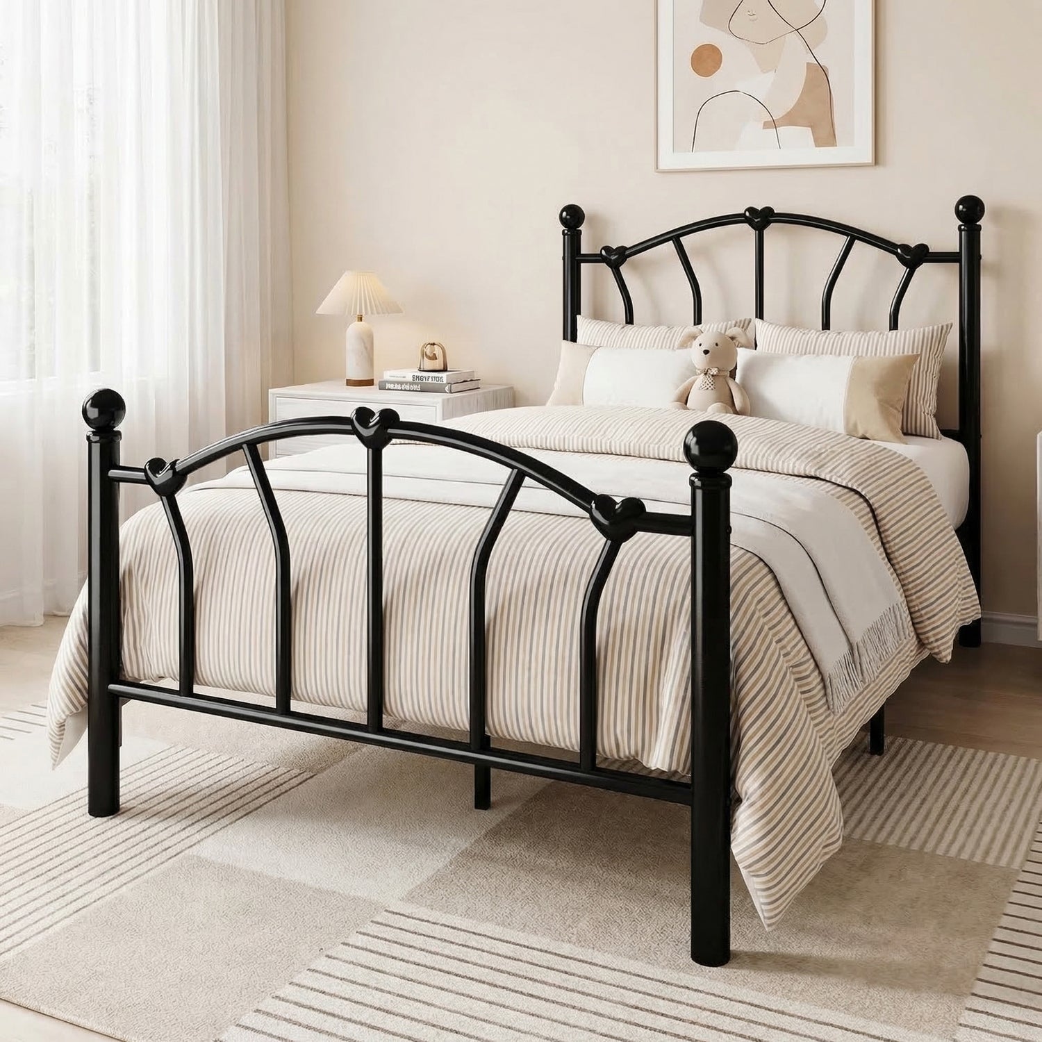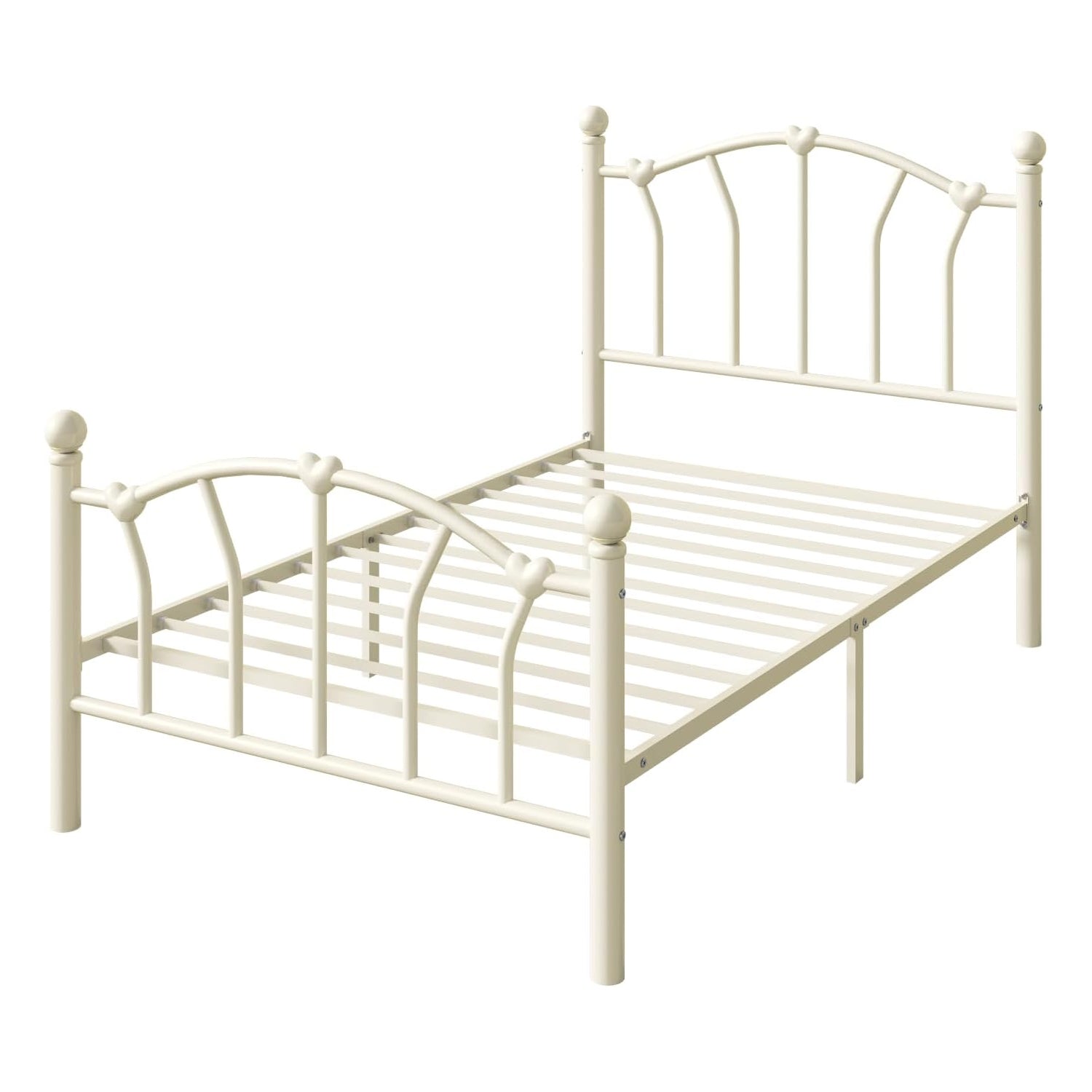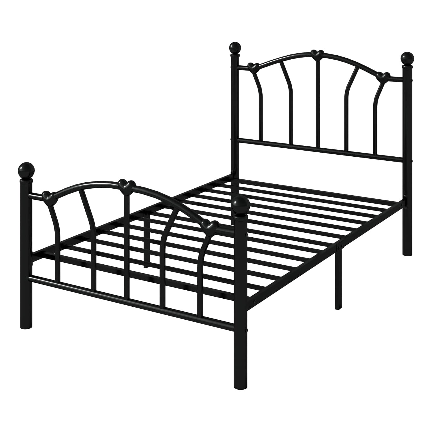 This twin size metal platform bed frame adds a romantic and charming touch to any bedroom with its unique heart-shaped headboard and footboard. The elegant design creates a sweet and stylish atmosphere, making it a great choice for kids, teens, or anyone who loves decorative bedroom furniture.