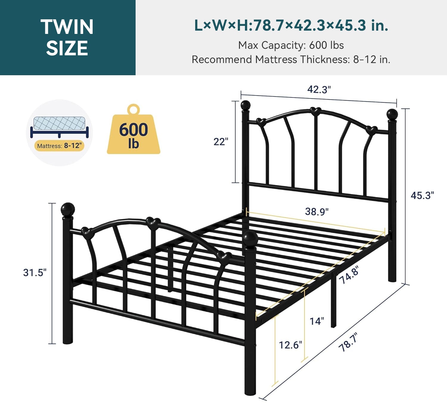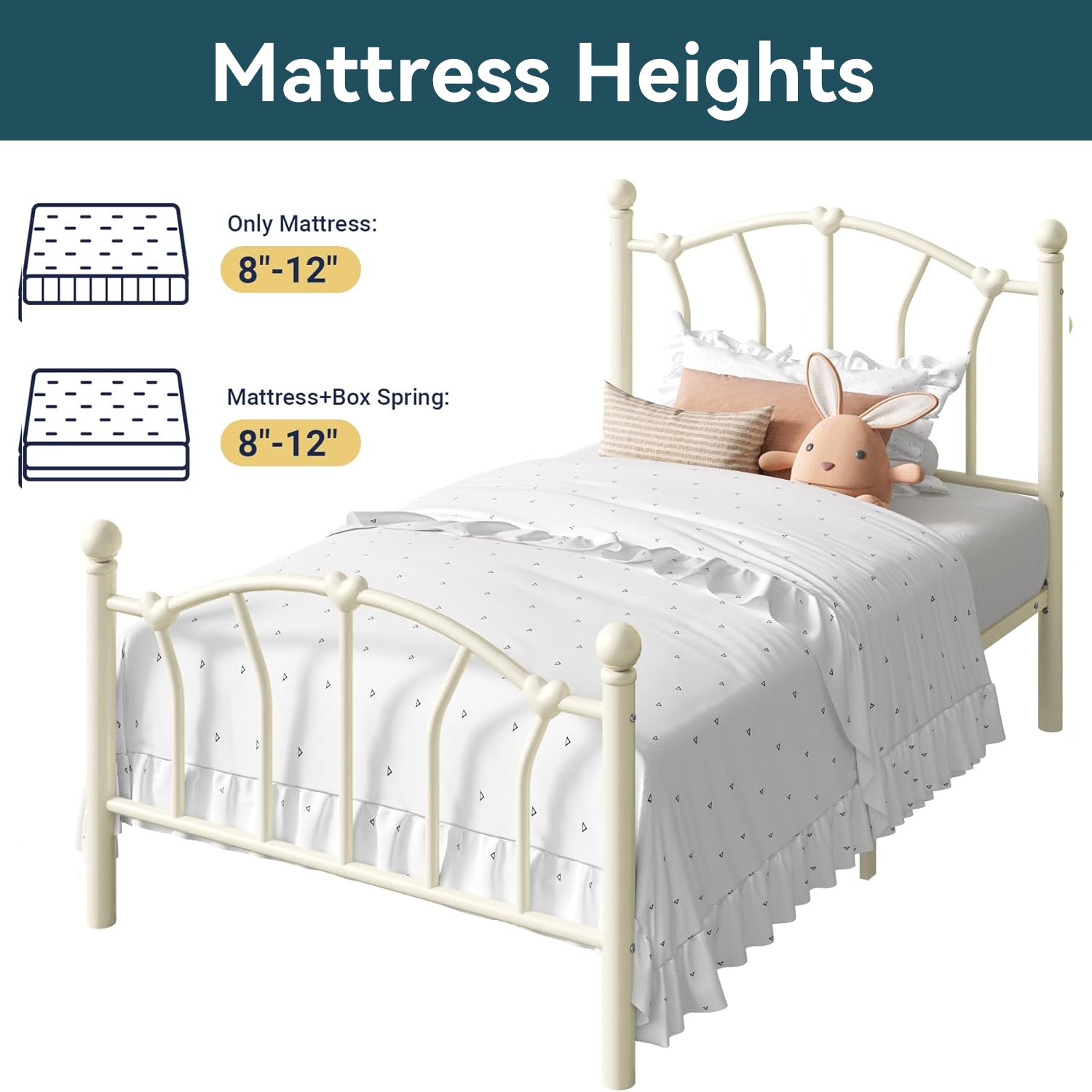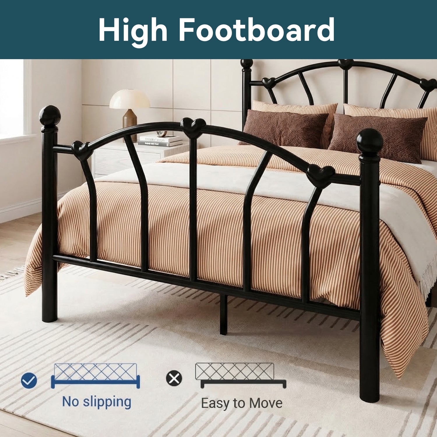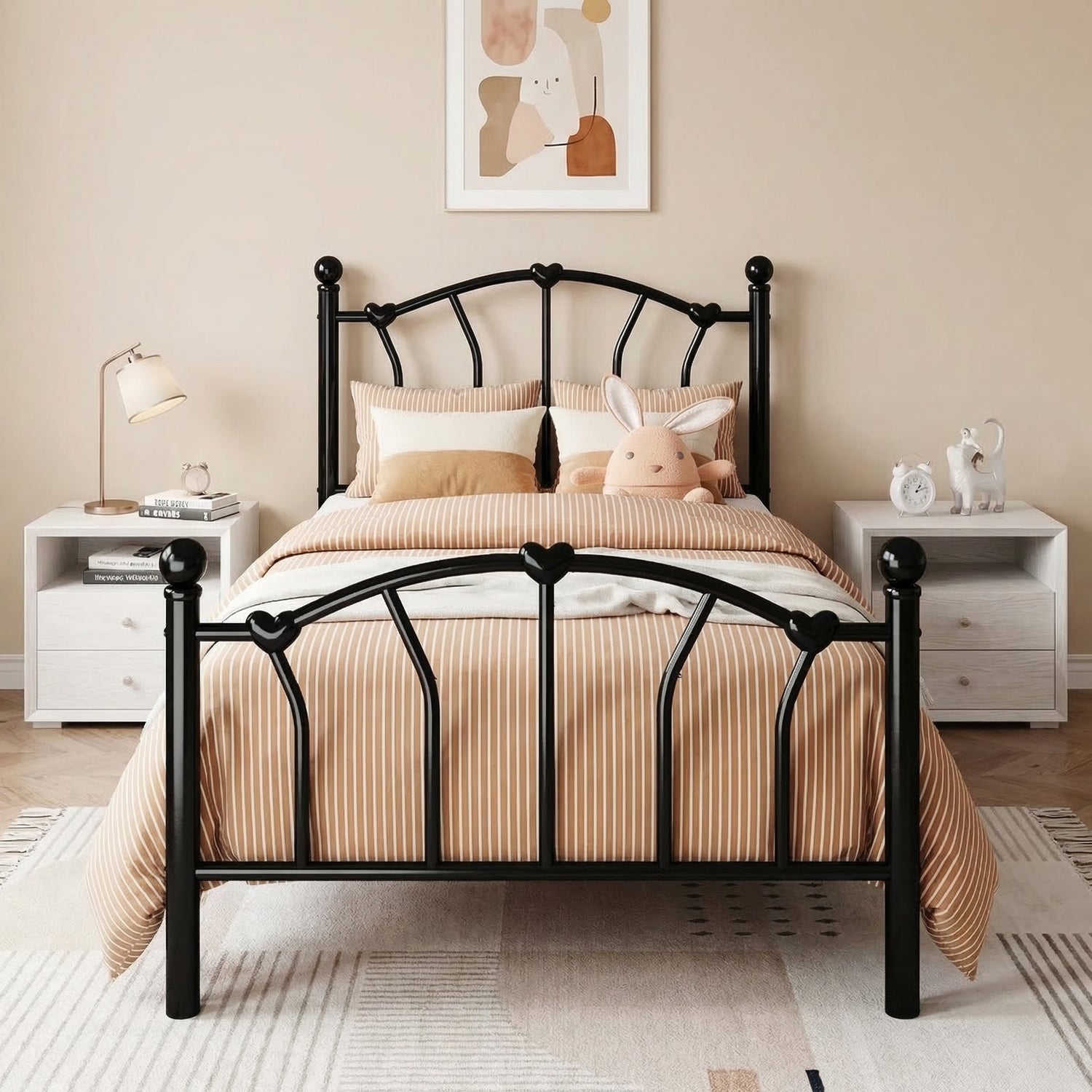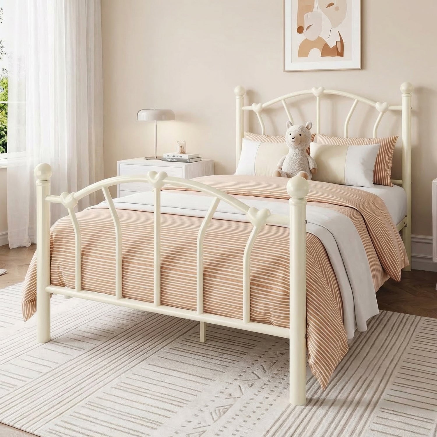 This twin size metal platform bed frame adds a romantic and charming touch to any bedroom with its unique heart-shaped headboard and footboard. The elegant design creates a sweet and stylish atmosphere, making it a great choice for kids, teens, or anyone who loves decorative bedroom furniture.