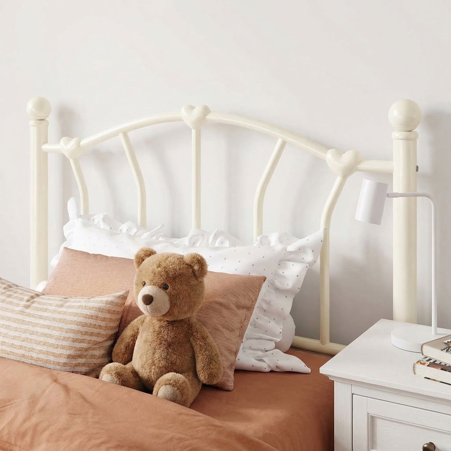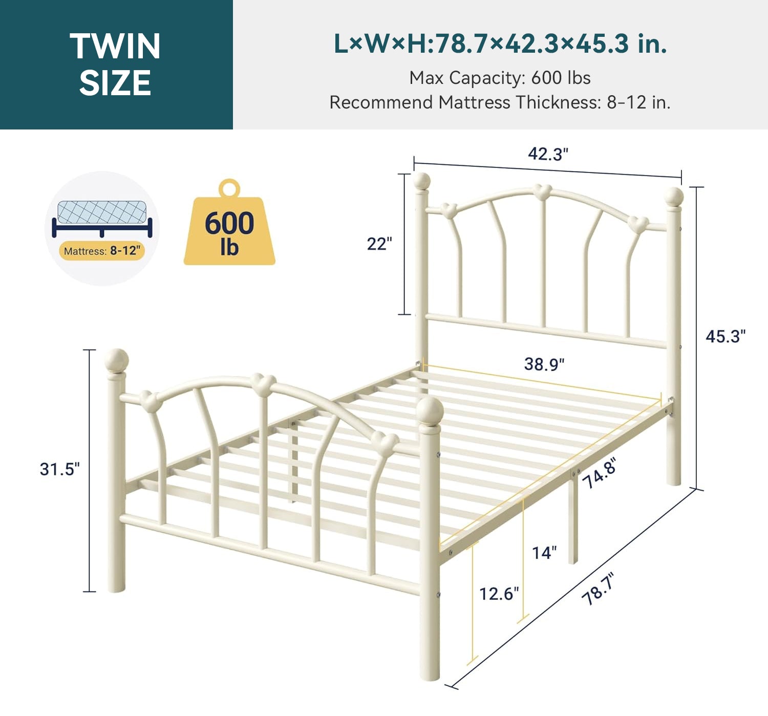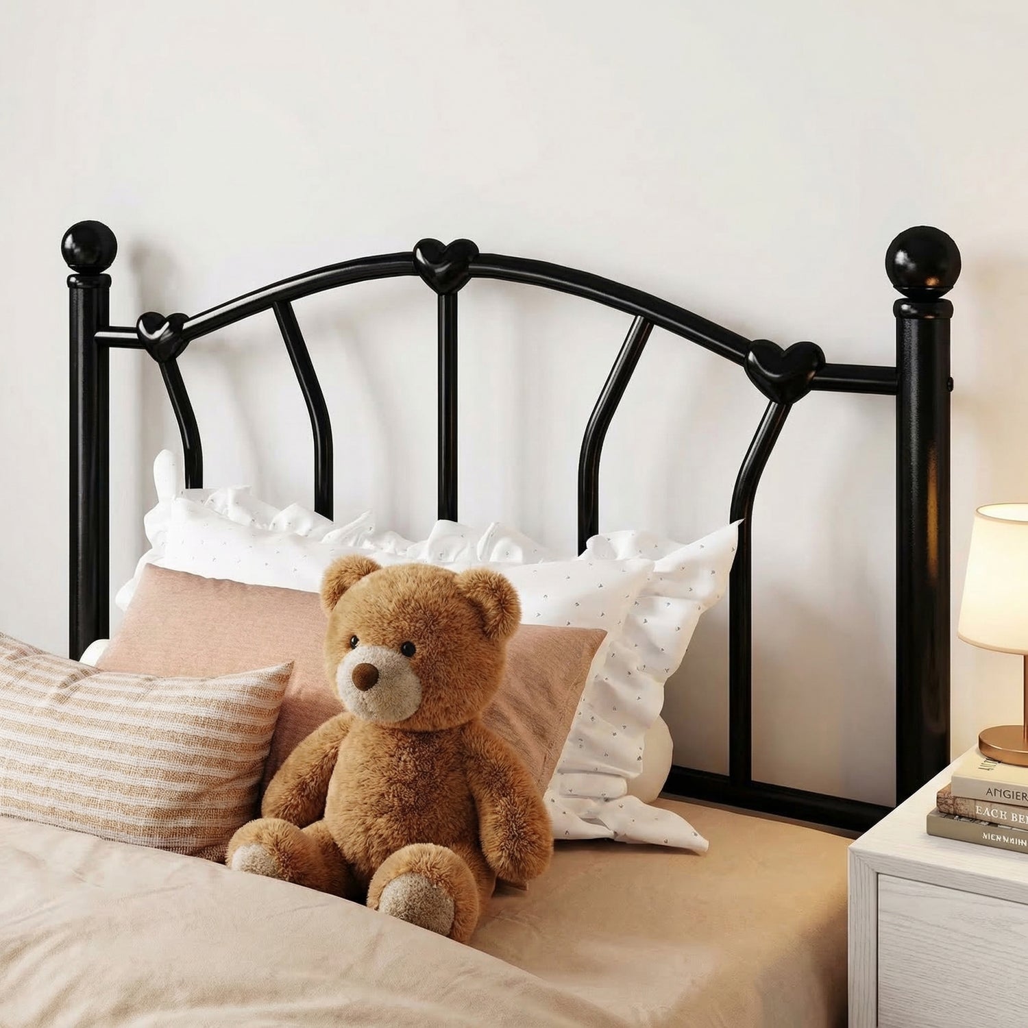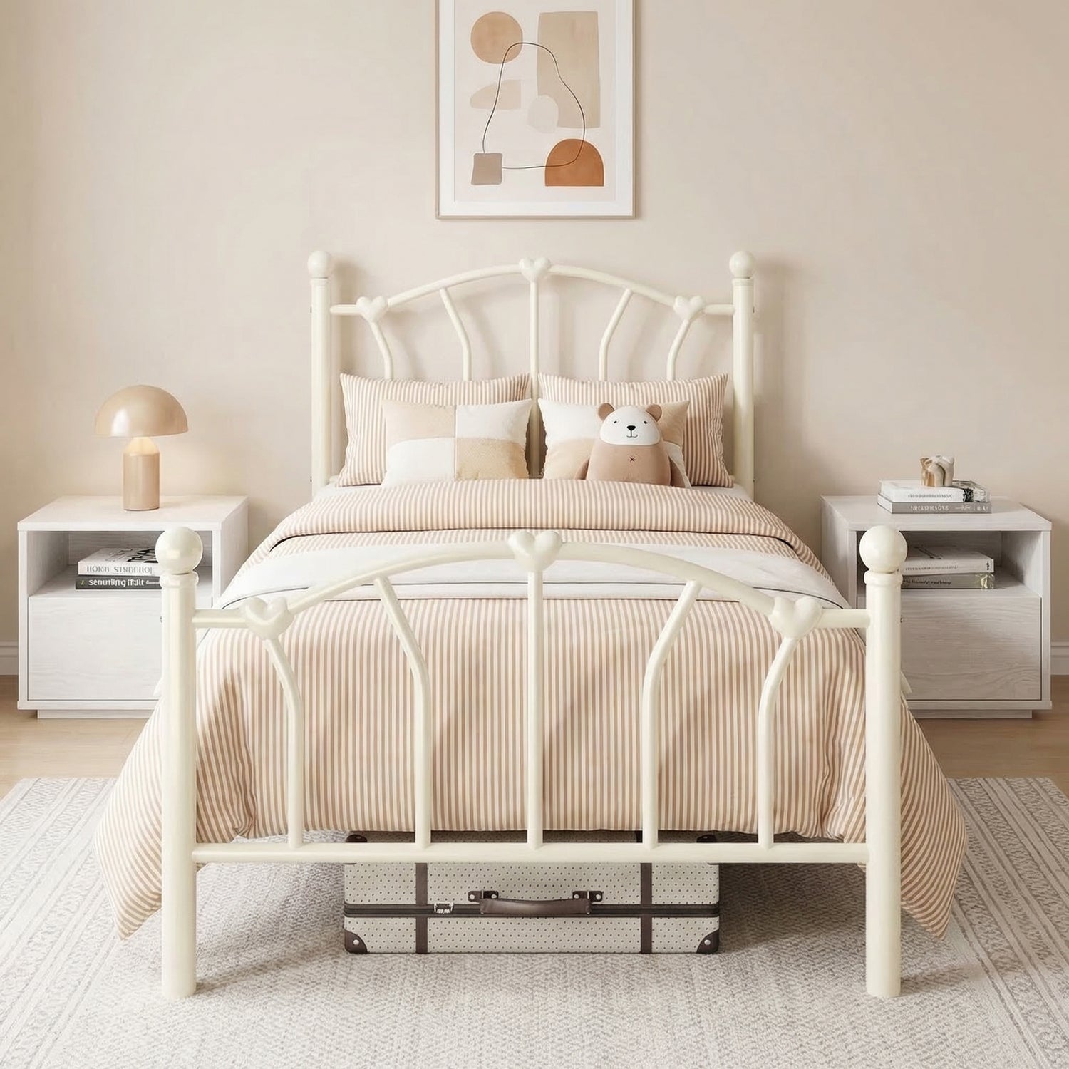 This twin size metal platform bed frame adds a romantic and charming touch to any bedroom with its unique heart-shaped headboard and footboard. The elegant design creates a sweet and stylish atmosphere, making it a great choice for kids, teens, or anyone who loves decorative bedroom furniture.