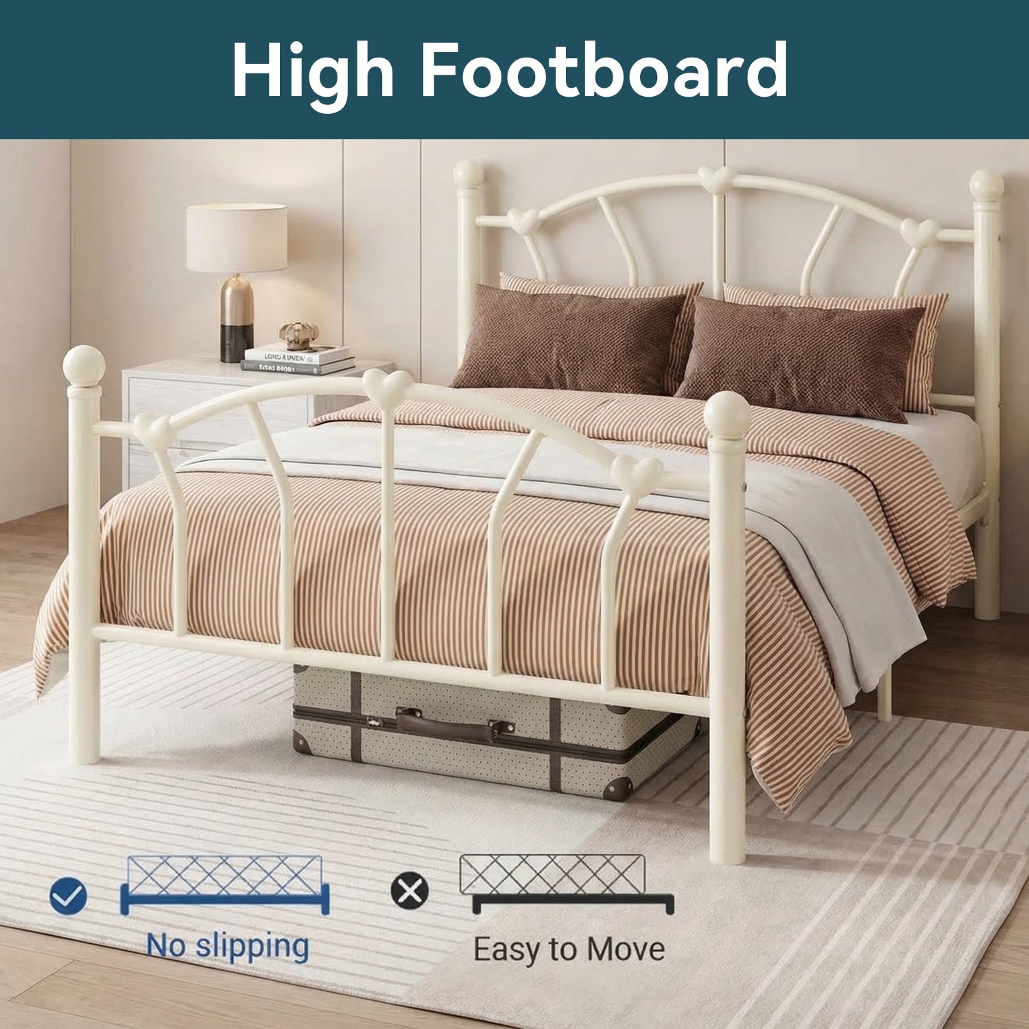 The sturdy metal construction provides reliable stability for everyday use. Reinforced metal slats and a durable frame help keep the mattress securely supported while preventing shifting or wobbling during sleep.