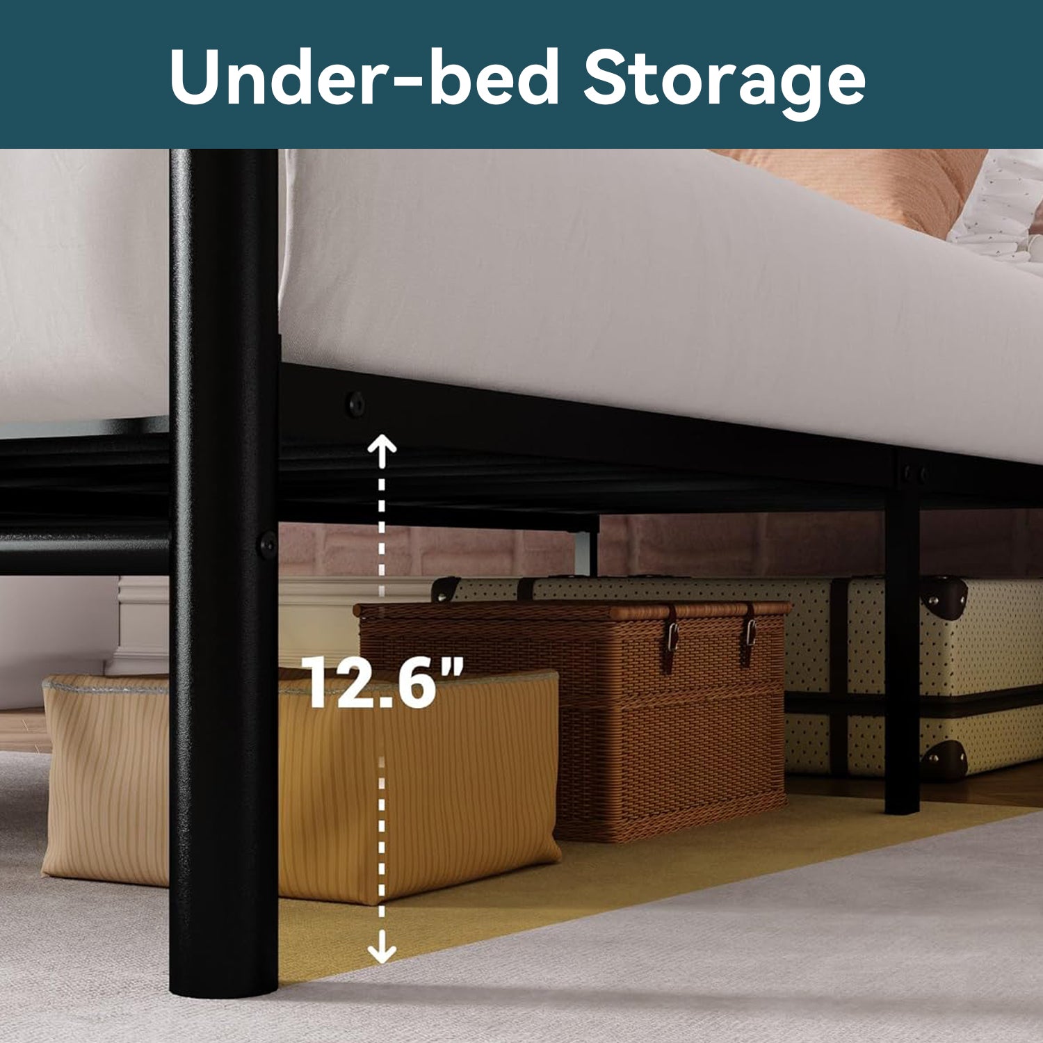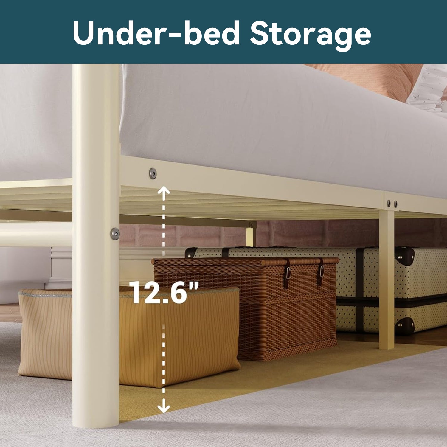 Its raised structure provides 12.6 inches of clearance underneath the bed, offering plenty of space for storage bins, luggage, seasonal clothing, or toys. The extra underbed space helps keep the room organized while making better use of limited bedroom space.