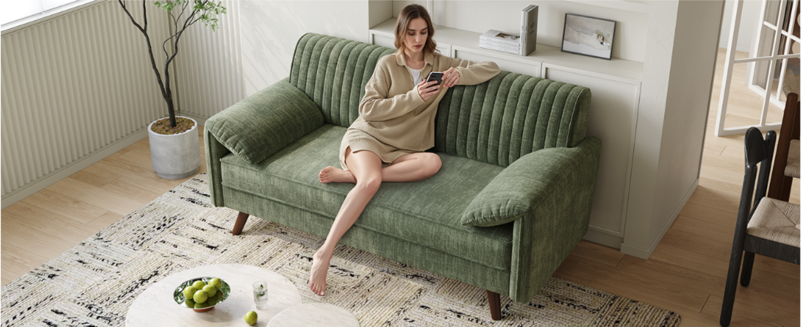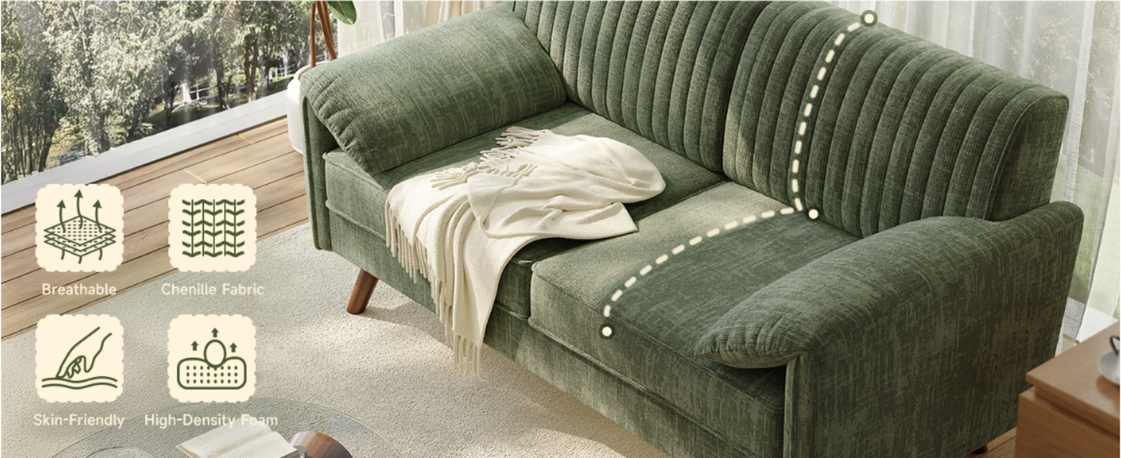 The seat is 23.2 inches deep and built with high-density foam and individual pocket springs. You sink in just enough to relax, while still feeling held up. The padded arms are soft and forgiving, perfect for resting your elbows or using as a pillow. The chenille fabric feels soft and holds up well to daily sitting and movement.