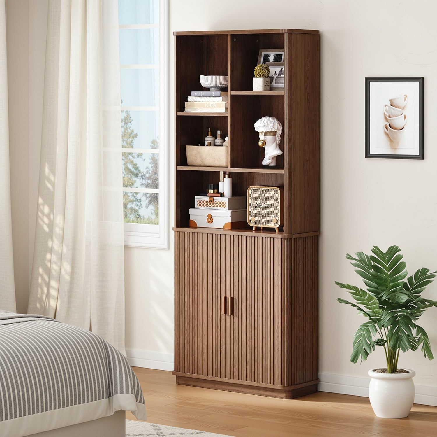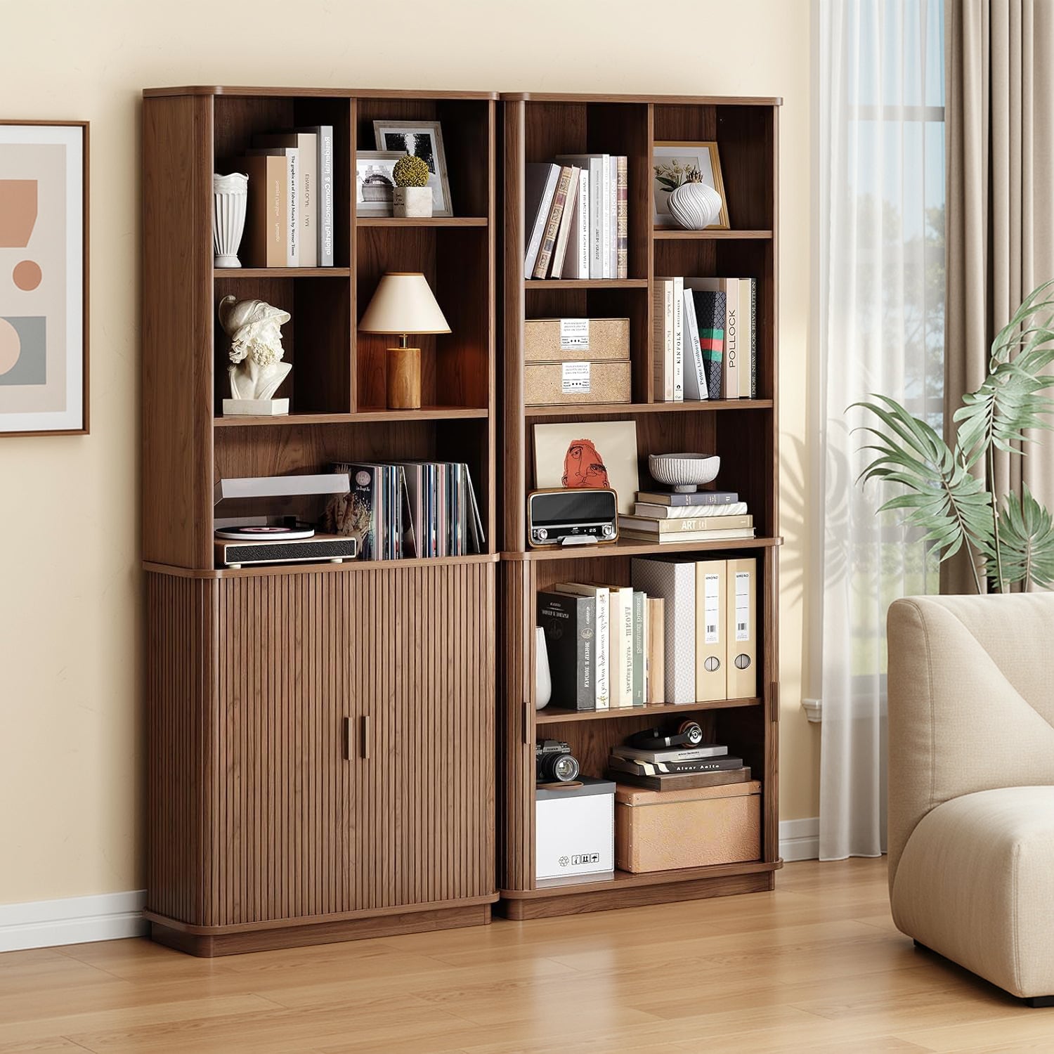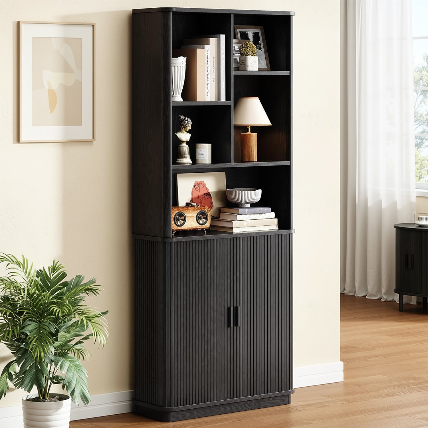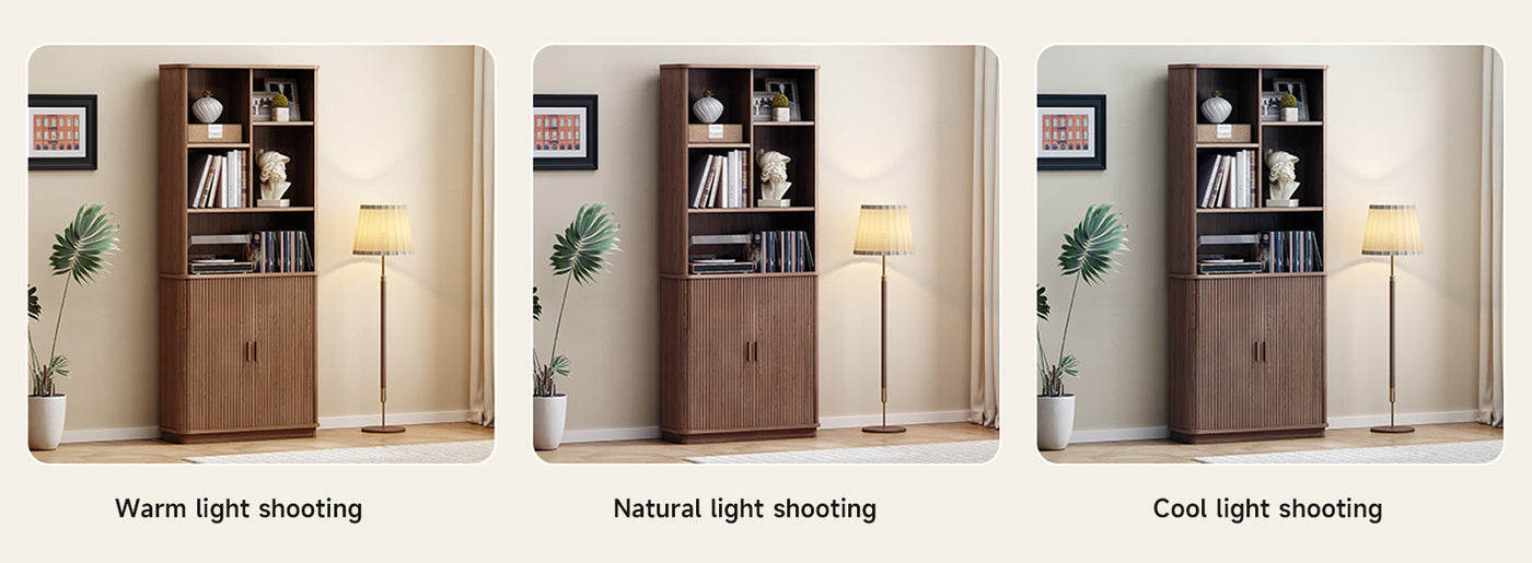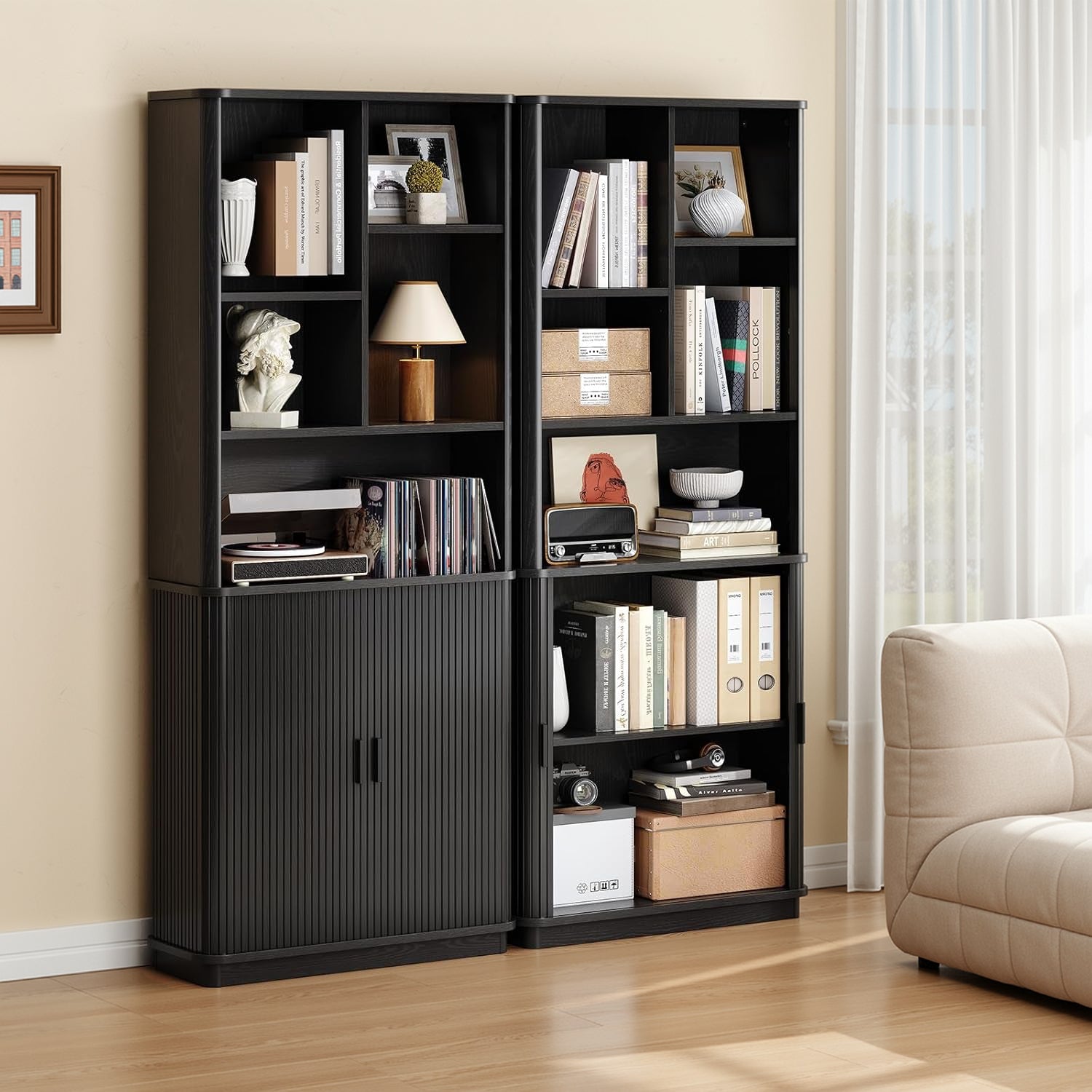 The open sections are easy to live with. Books, framed photos, a turntable, or the things you reach for during the day naturally find a place here. Two of the shelves are adjustable, so you’re not stuck working around fixed heights when your storage needs change.