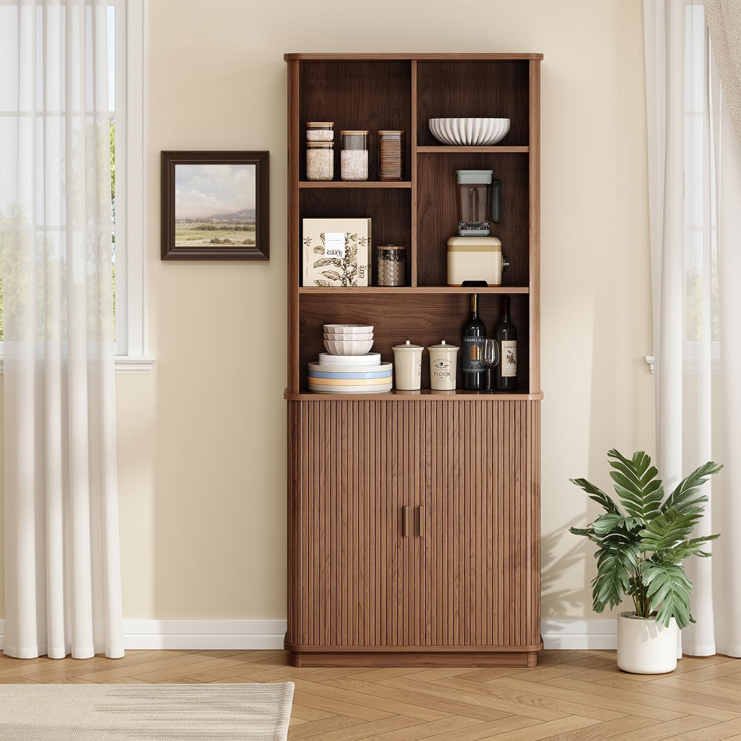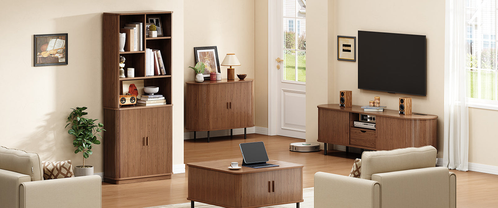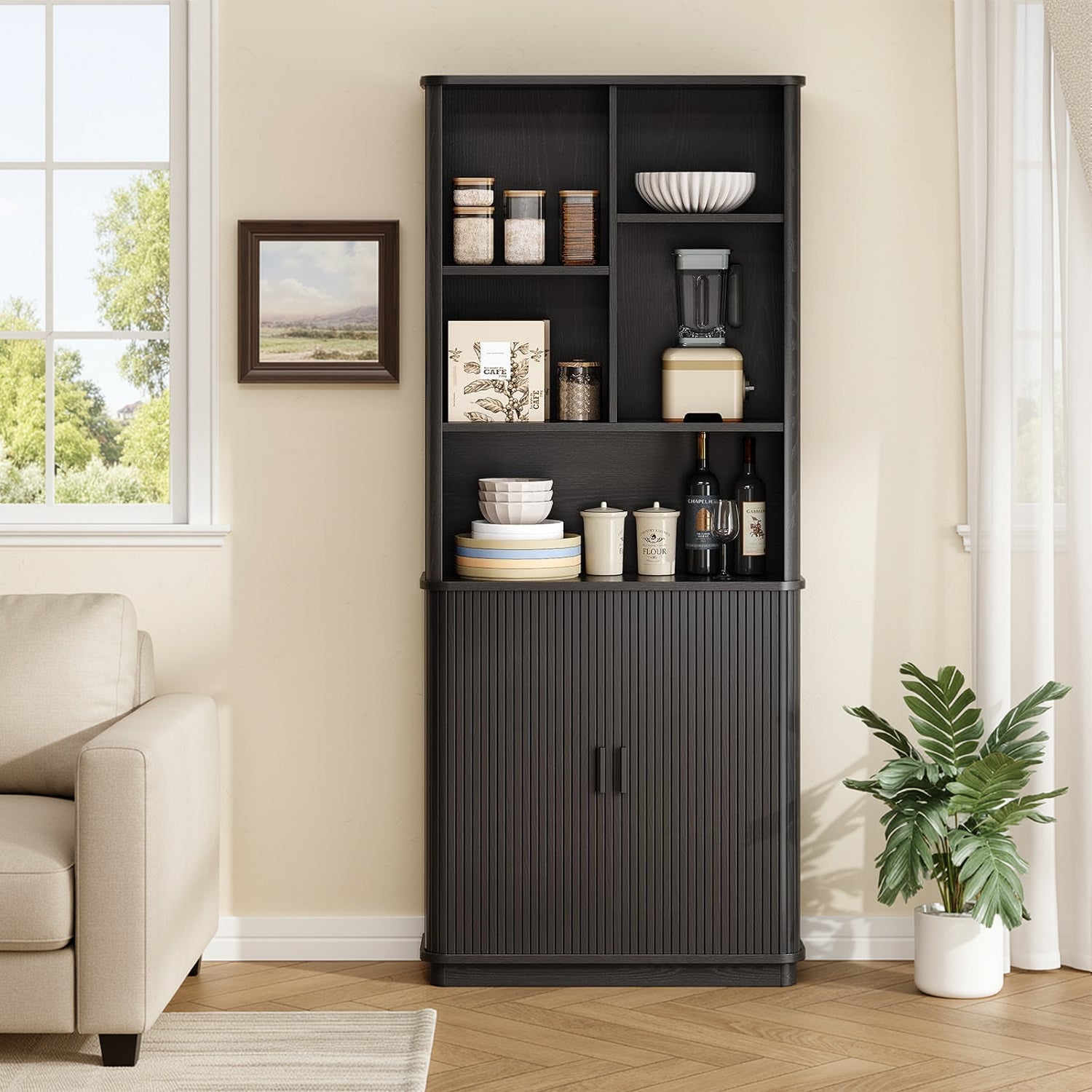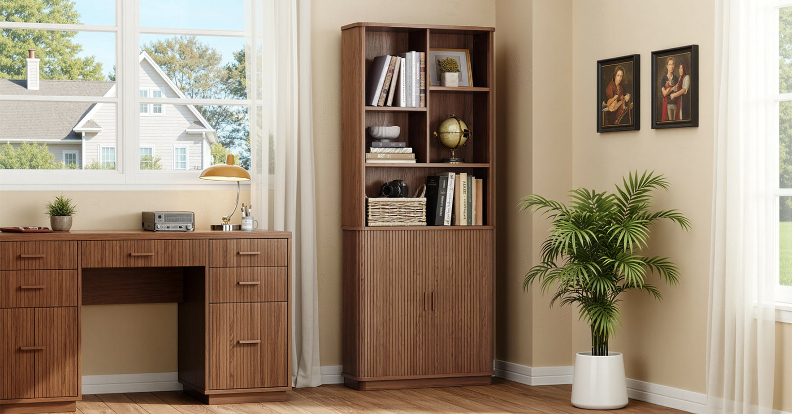 The open sections are easy to live with. Books, framed photos, a turntable, or the things you reach for during the day naturally find a place here. Two of the shelves are adjustable, so you’re not stuck working around fixed heights when your storage needs change.