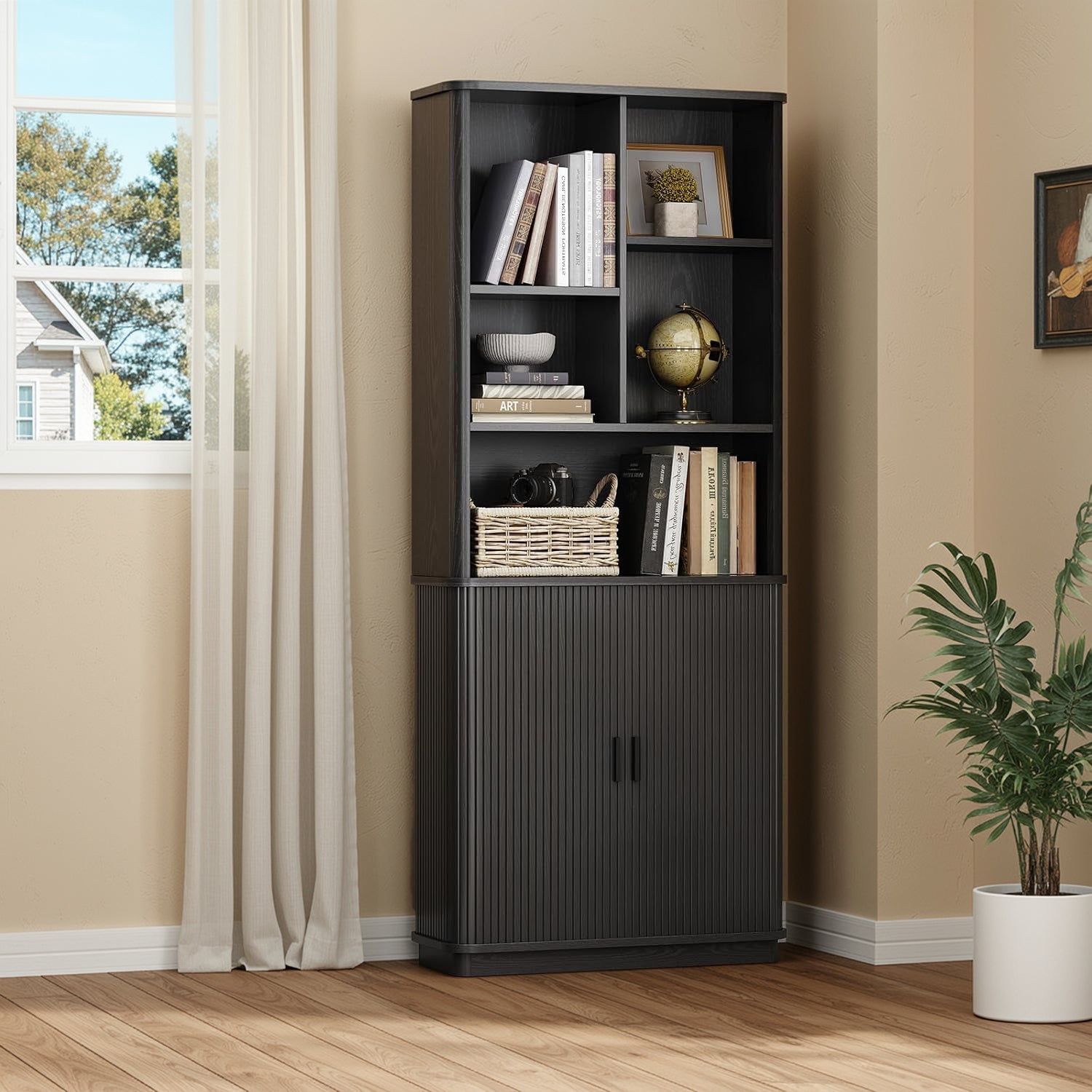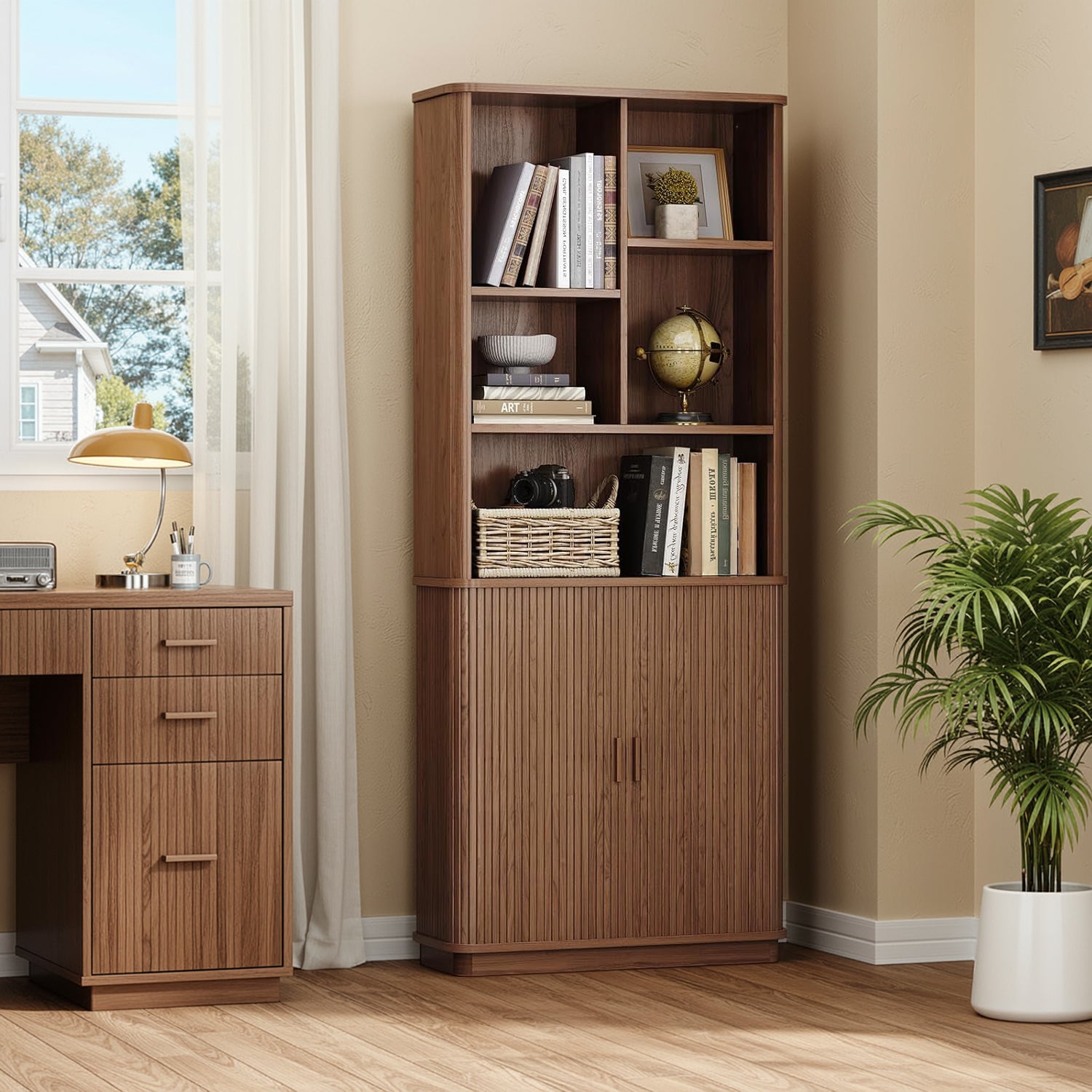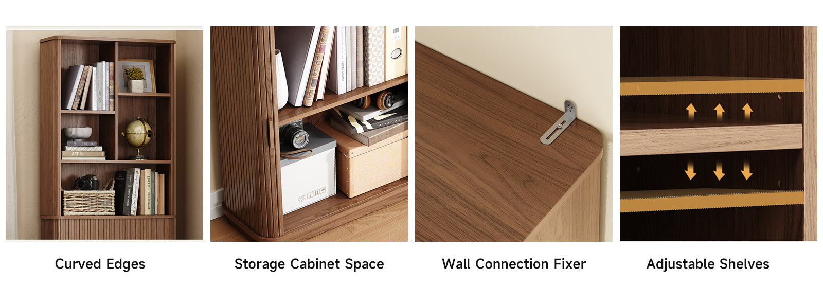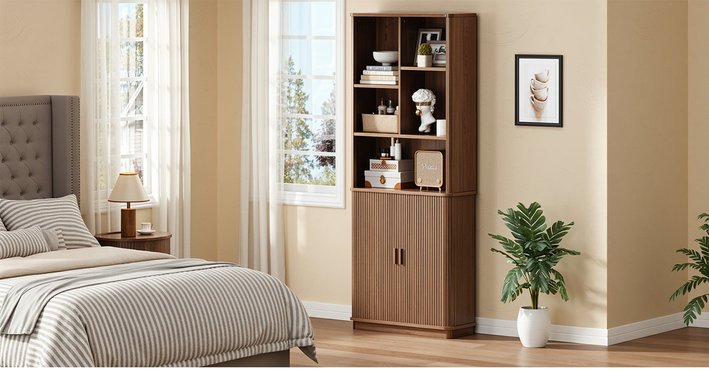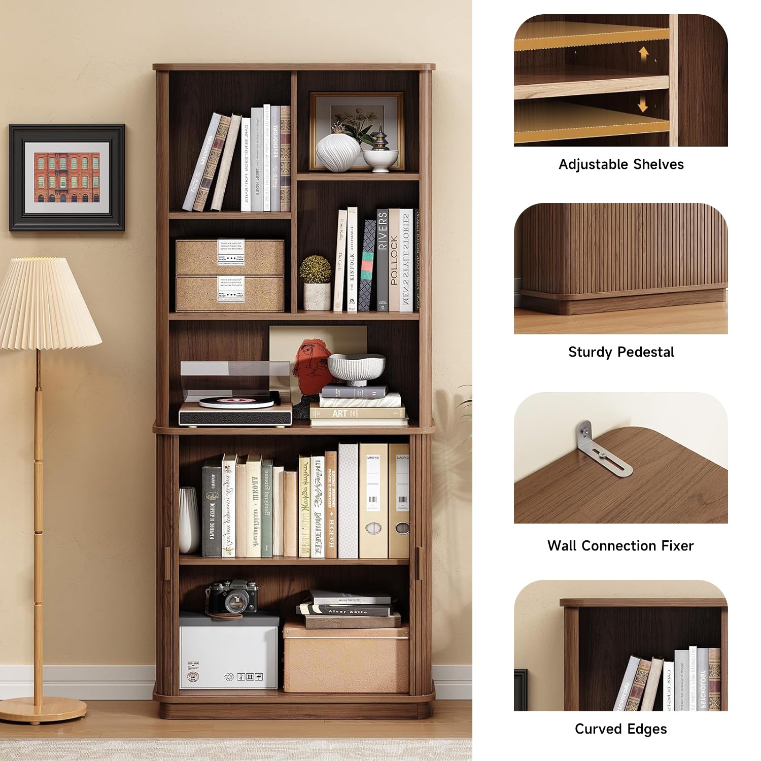 This modern bookcase has a calm, solid look that feels more like furniture than storage. The wood tone is warm without being heavy, and the rounded corners eliminate the sharp, boxy feeling that most tall shelves have. It sits comfortably in a living room or study without trying to be the center of attention.