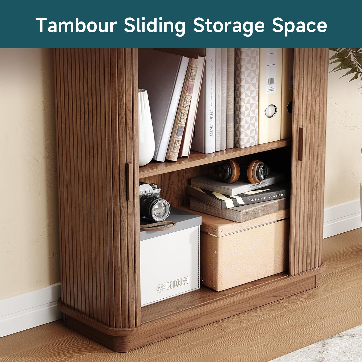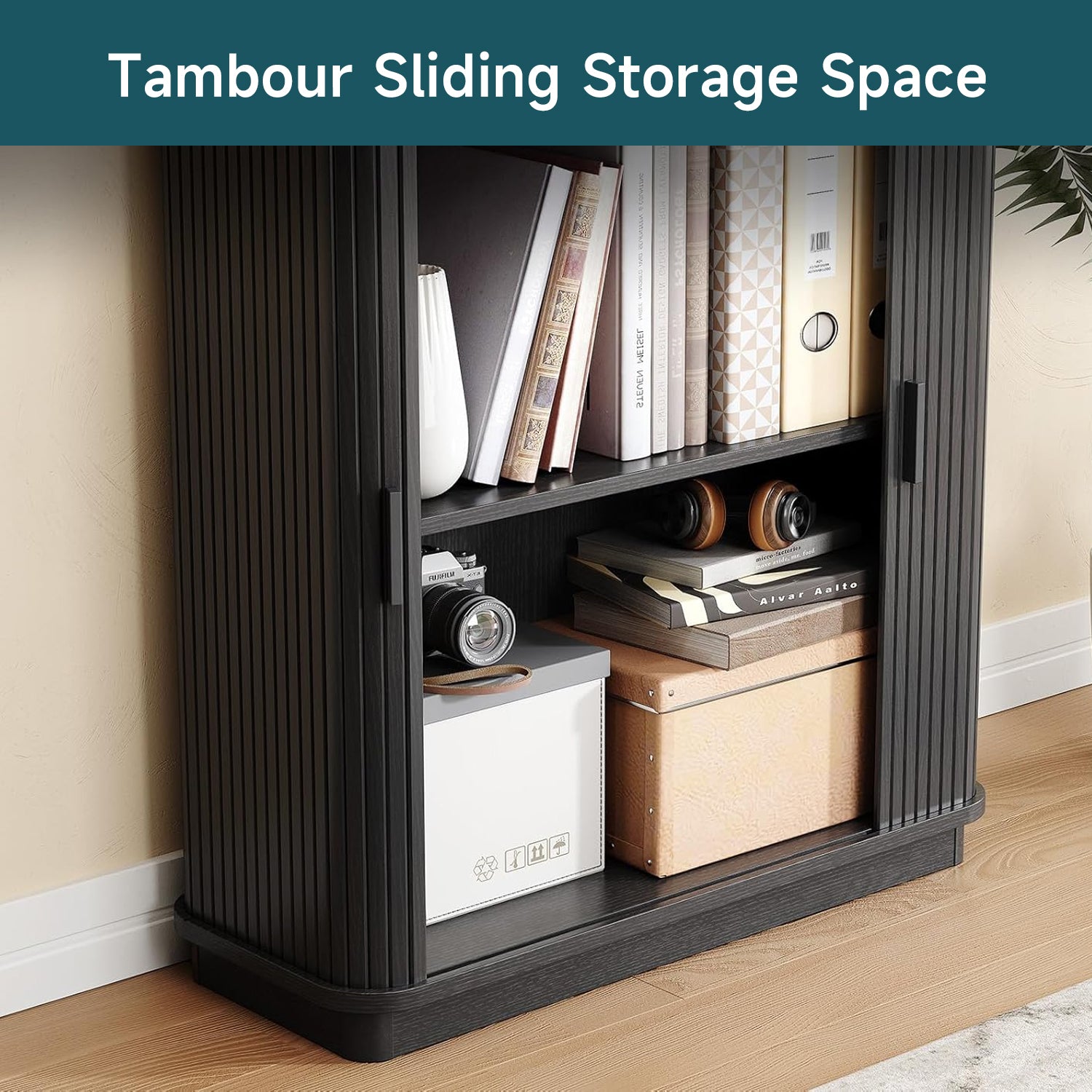 Behind the roll-up sliding door at the bottom, you can tuck away papers or storage boxes. The door slides smoothly and doesn’t swing into your space, which helps in tighter rooms.