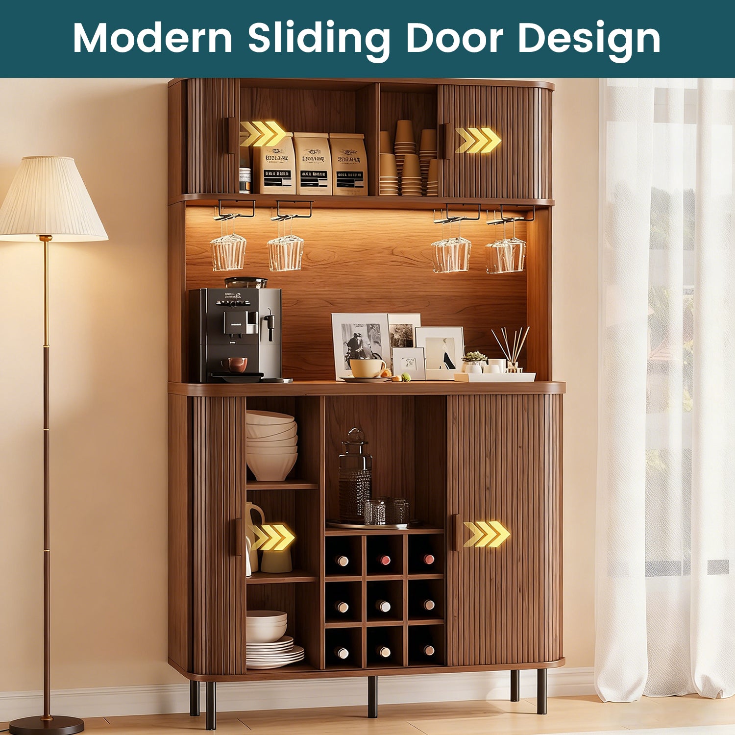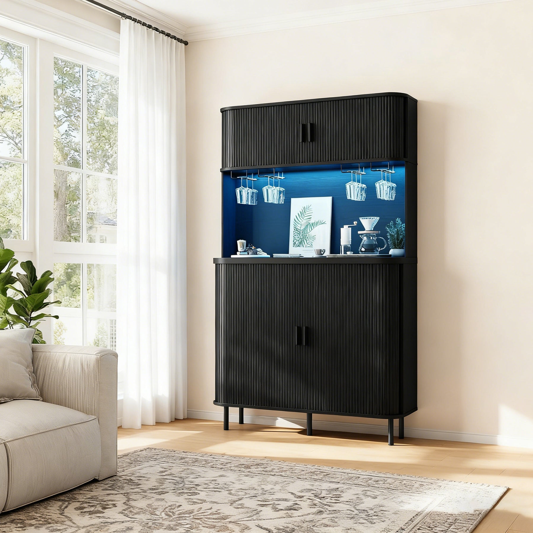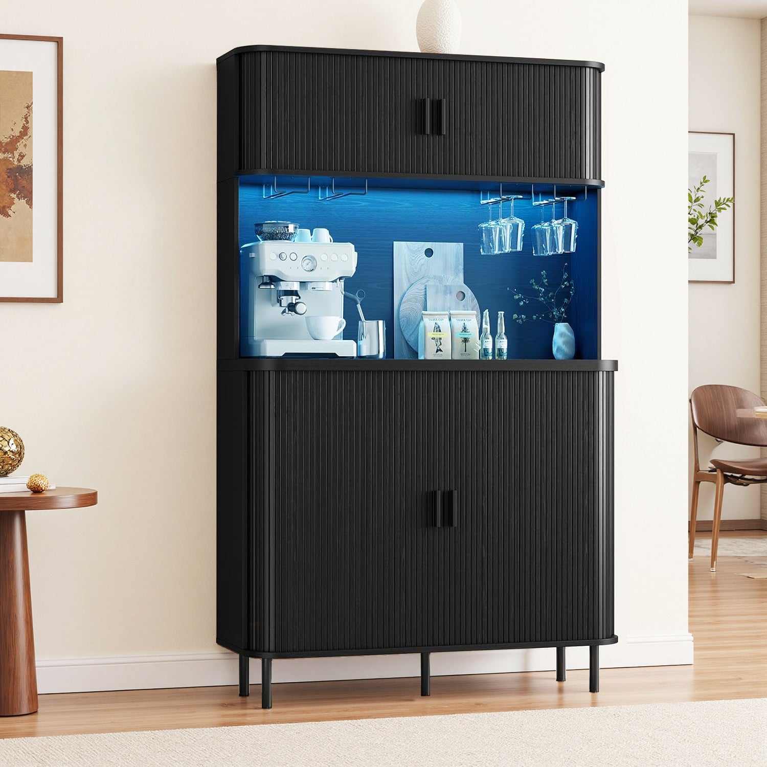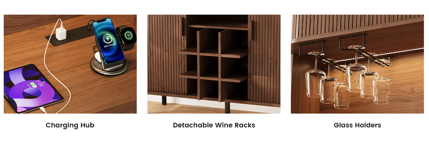 This liquor cabinet has nine compartments, plus a wine rack that you can take out if you don’t need it. The middle countertop is wide enough for a coffee maker, and the glass holders above it keep cups easy to grab without taking up shelf space.