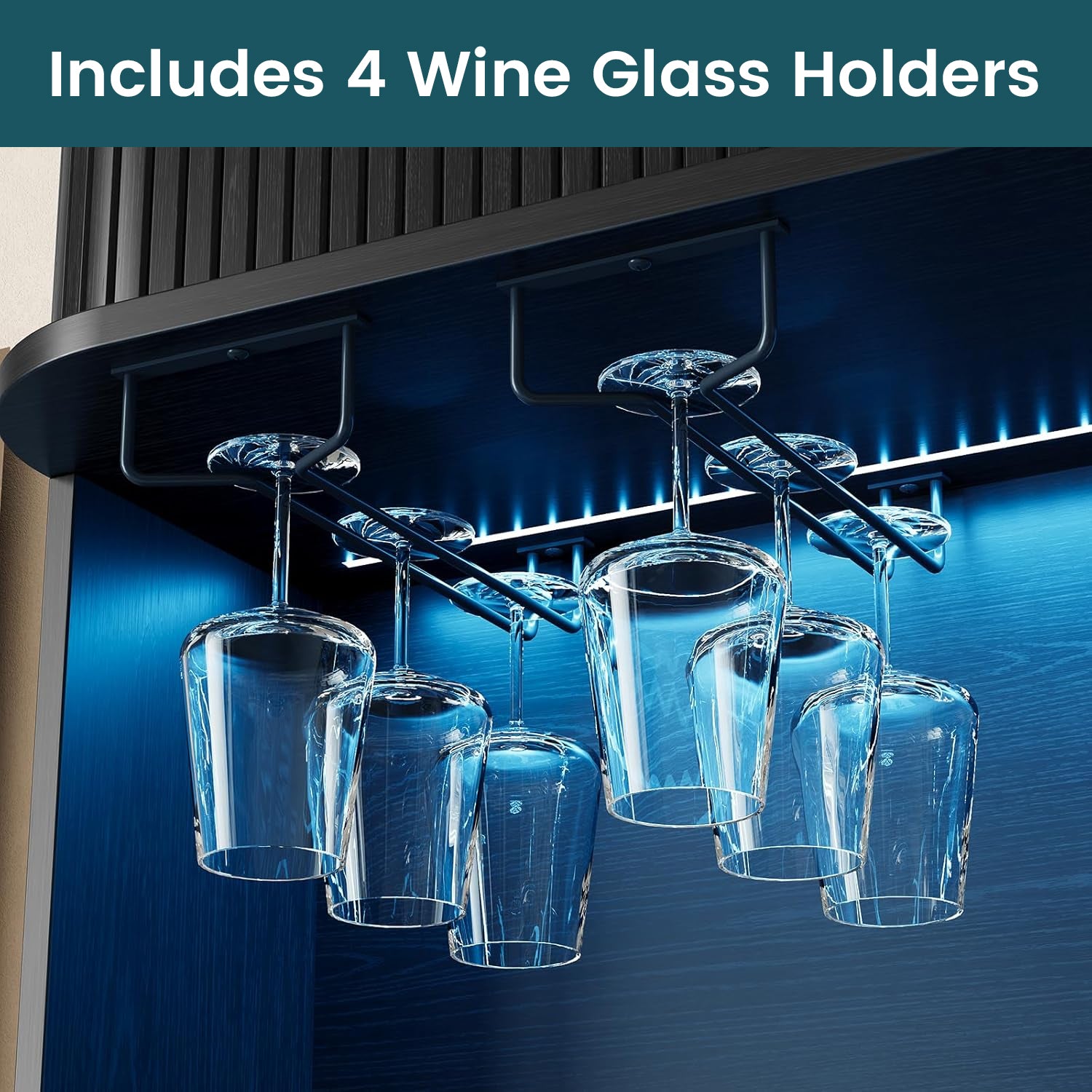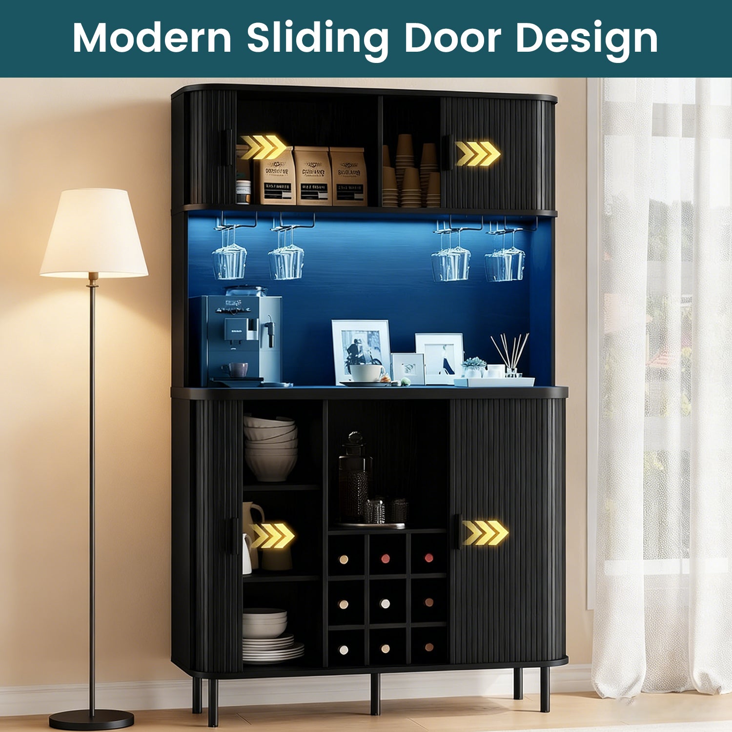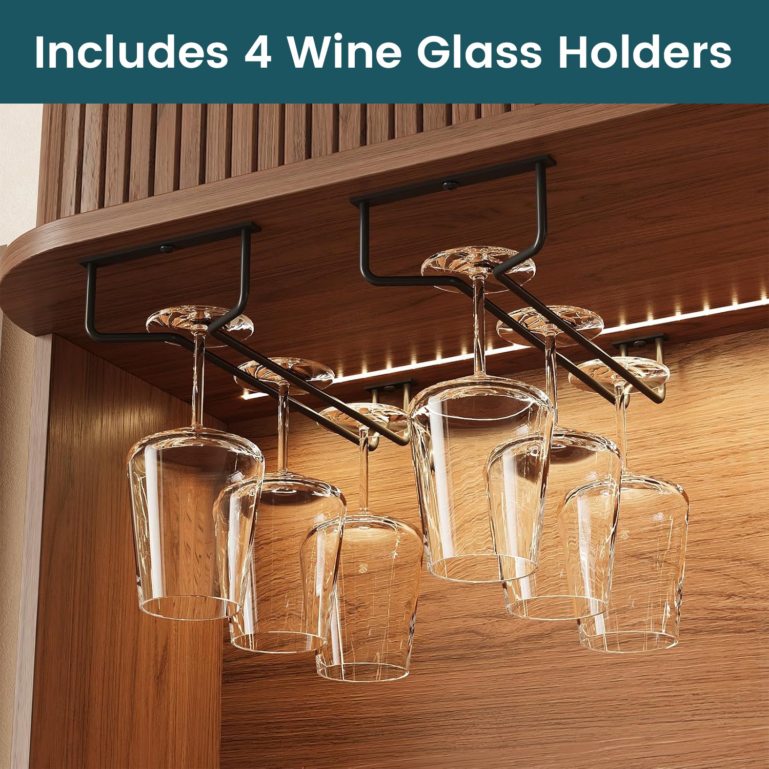 This liquor cabinet has nine compartments, plus a wine rack that you can take out if you don’t need it. The middle countertop is wide enough for a coffee maker, and the glass holders above it keep cups easy to grab without taking up shelf space.