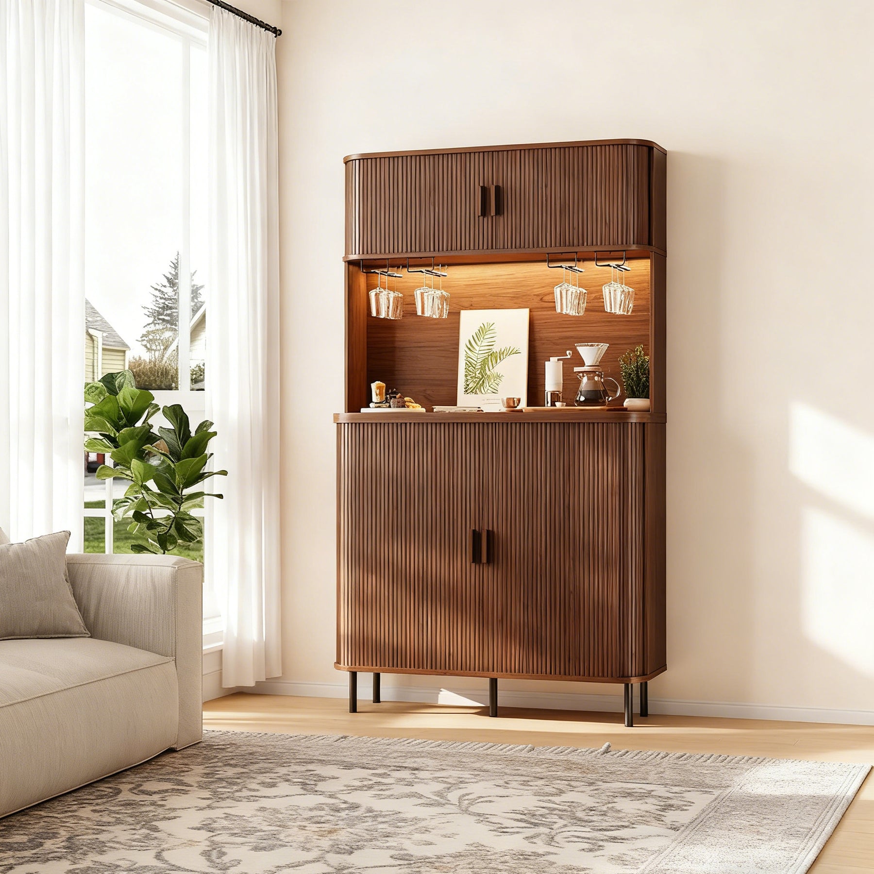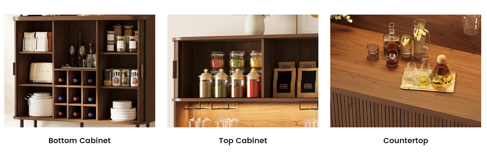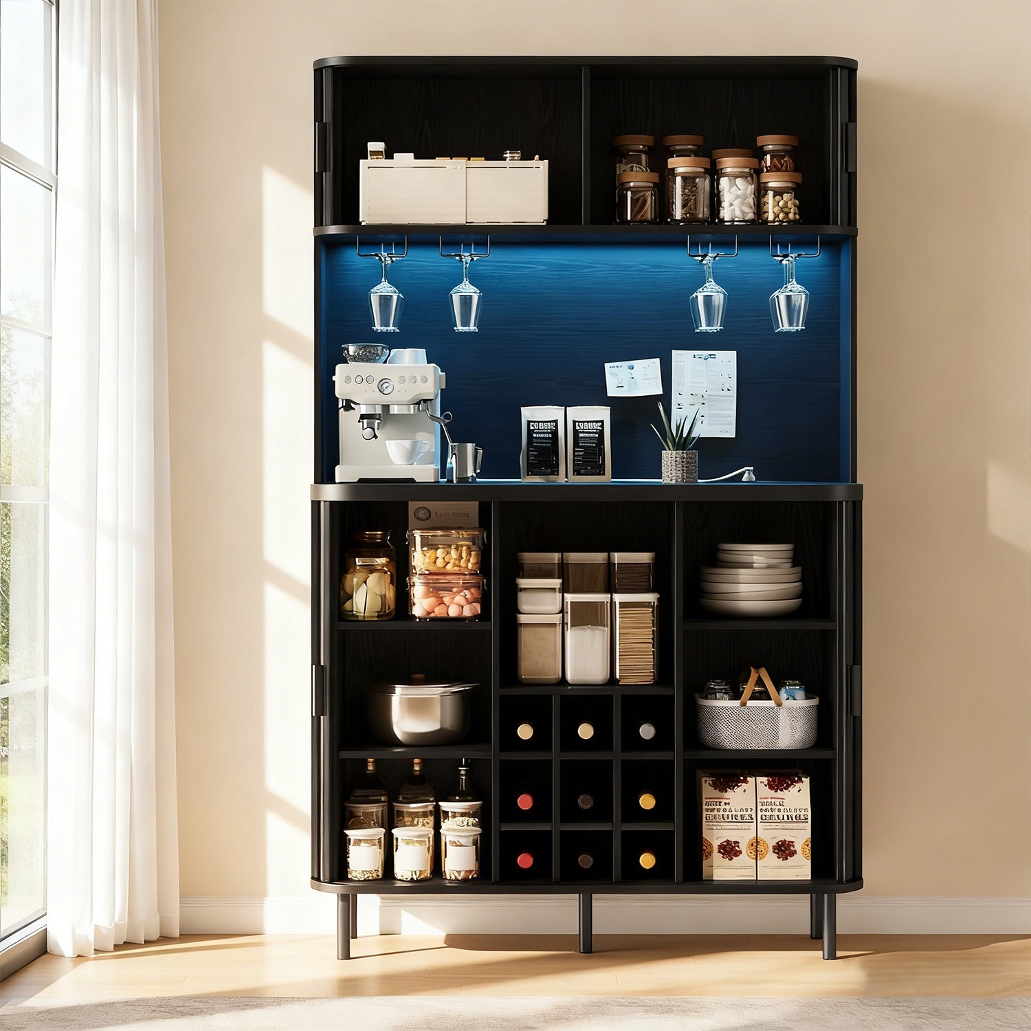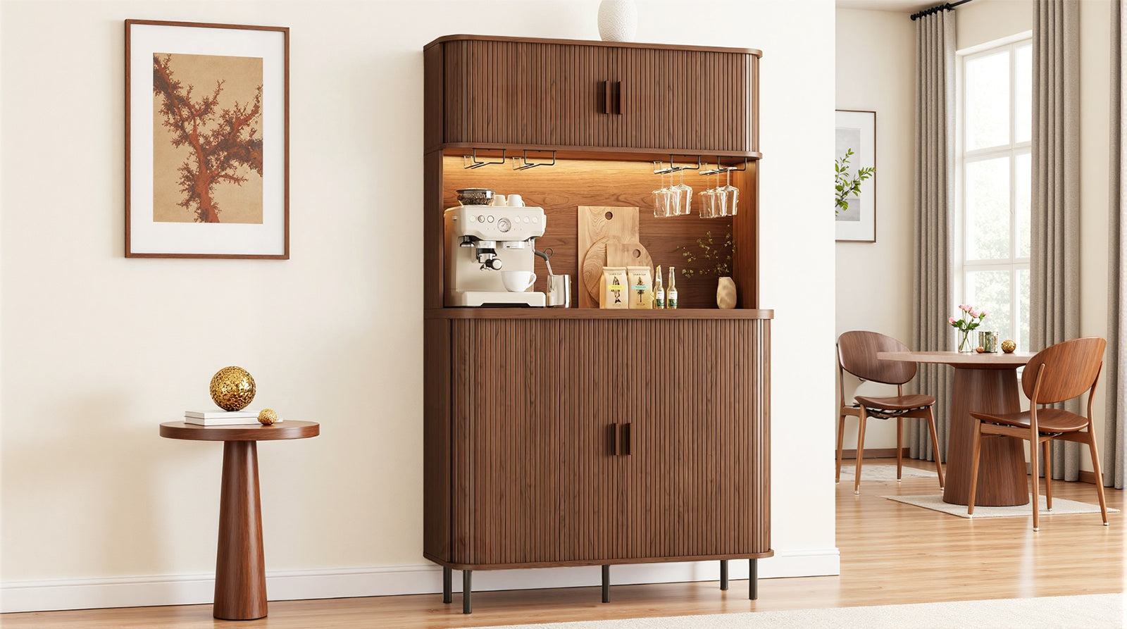 You can use it as a bar, a coffee station, or just extra storage in the kitchen area. The layout works well for anyone who likes things organized but doesn’t want furniture that feels too formal or complicated.