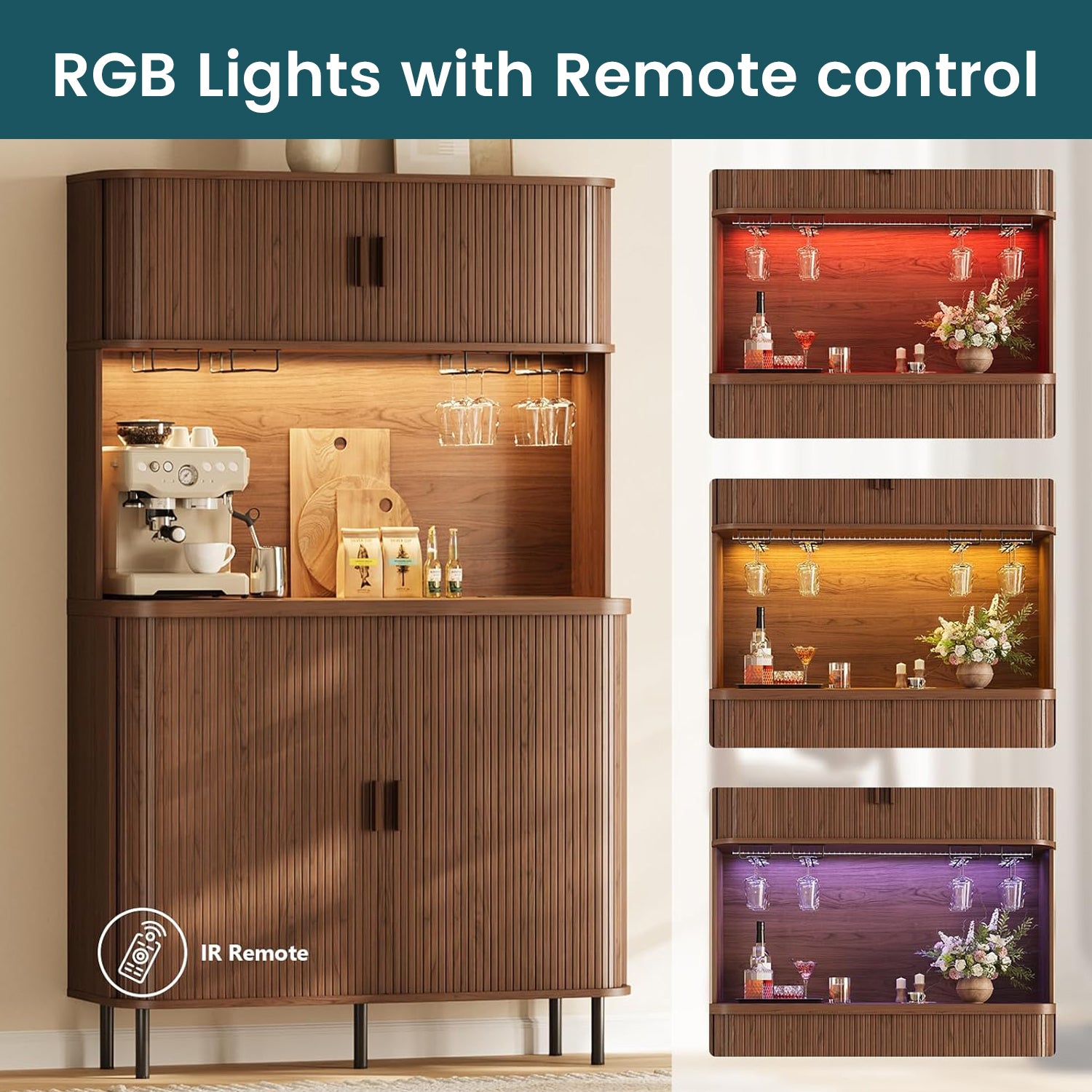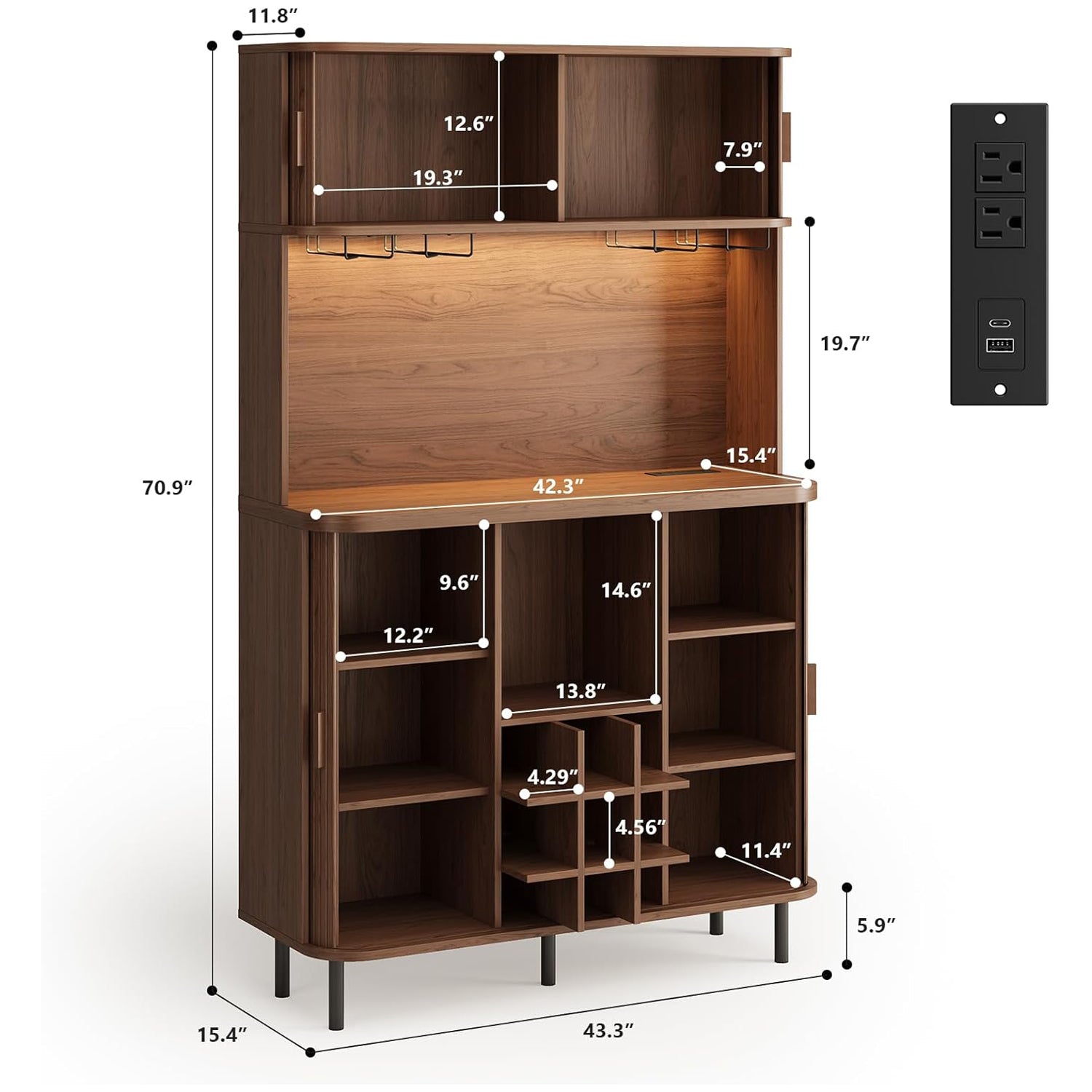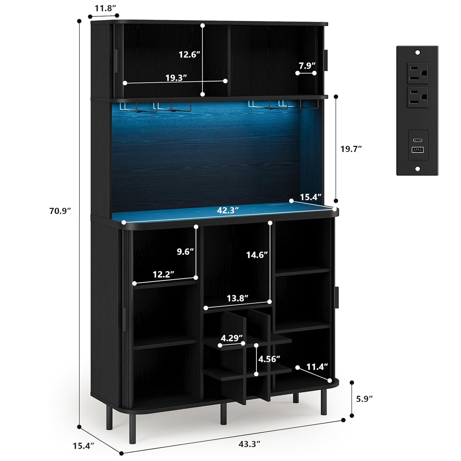 The upper shelf has RGB lighting that you can change with a remote. It’s not overly bright—just enough to give the cabinet a warm look when the room is dim. Two AC outlets and two USB ports are included, which makes charging devices simple without running cords across the room.