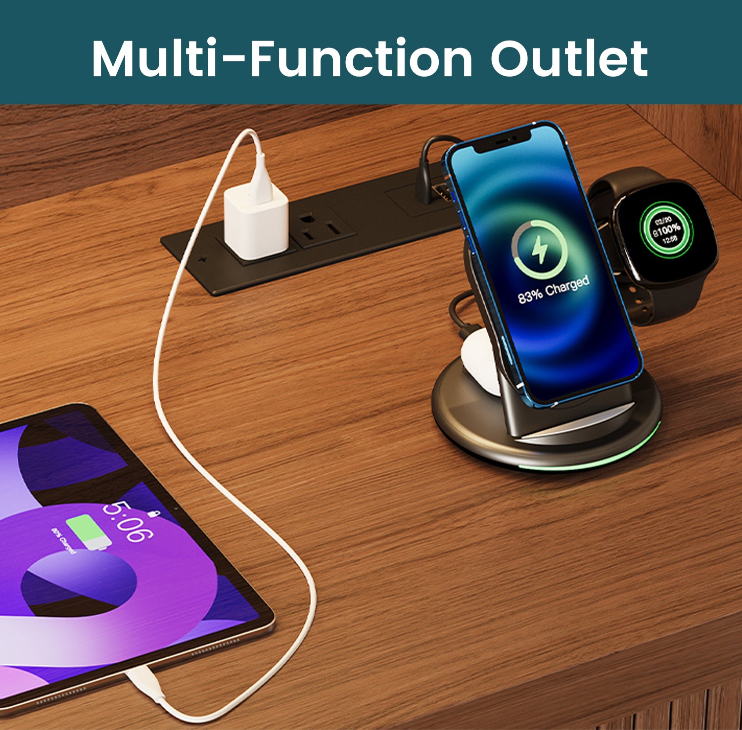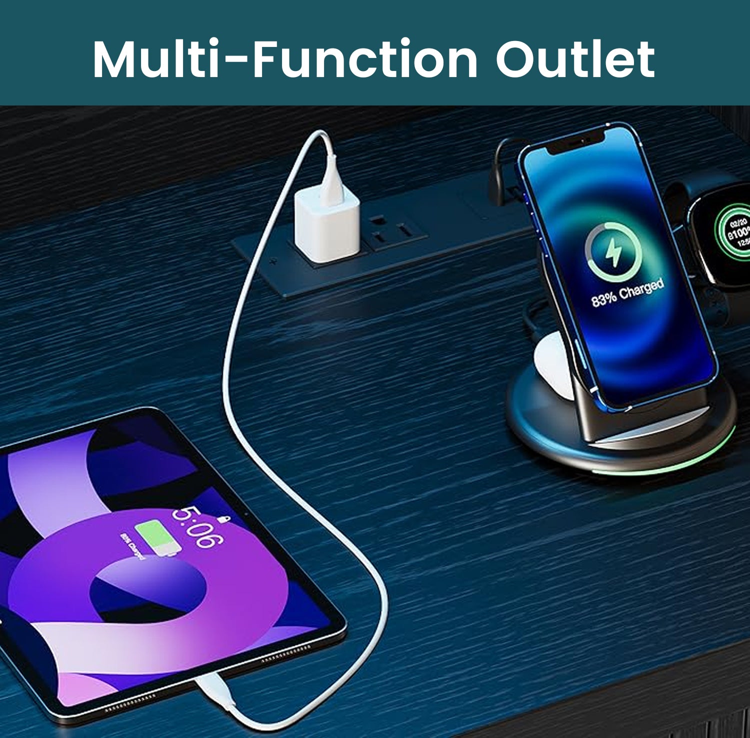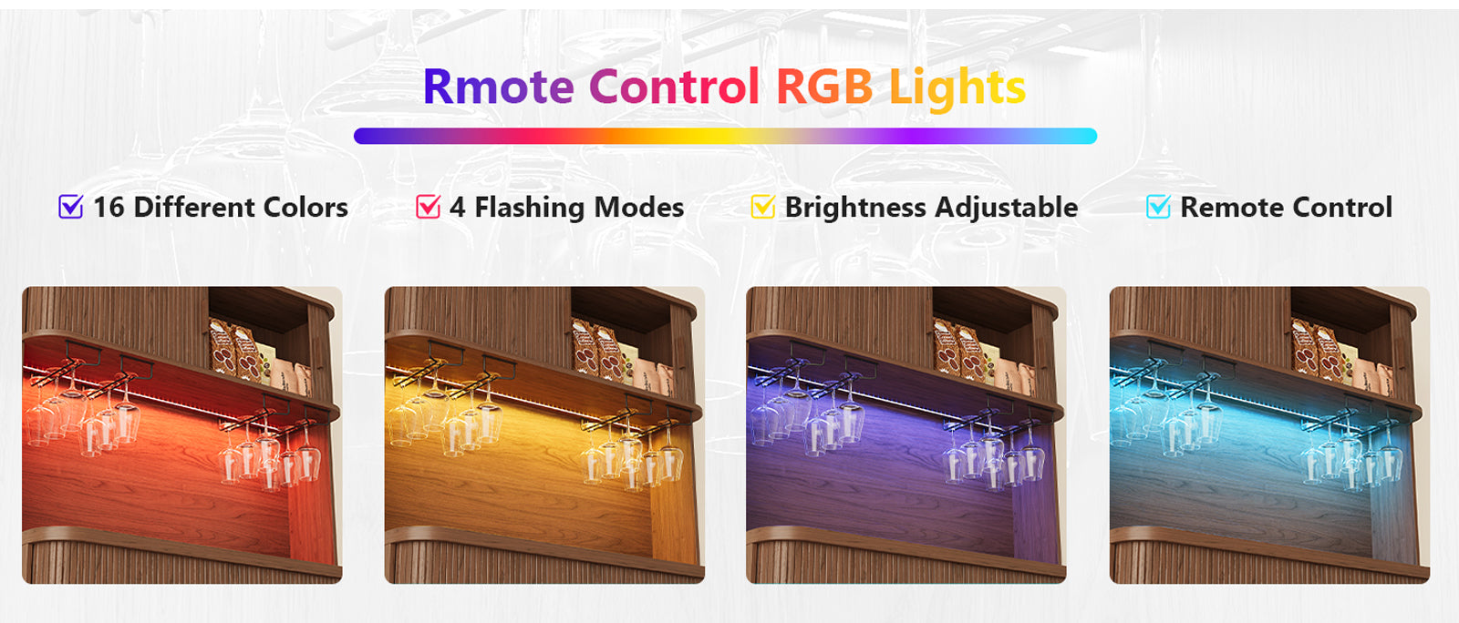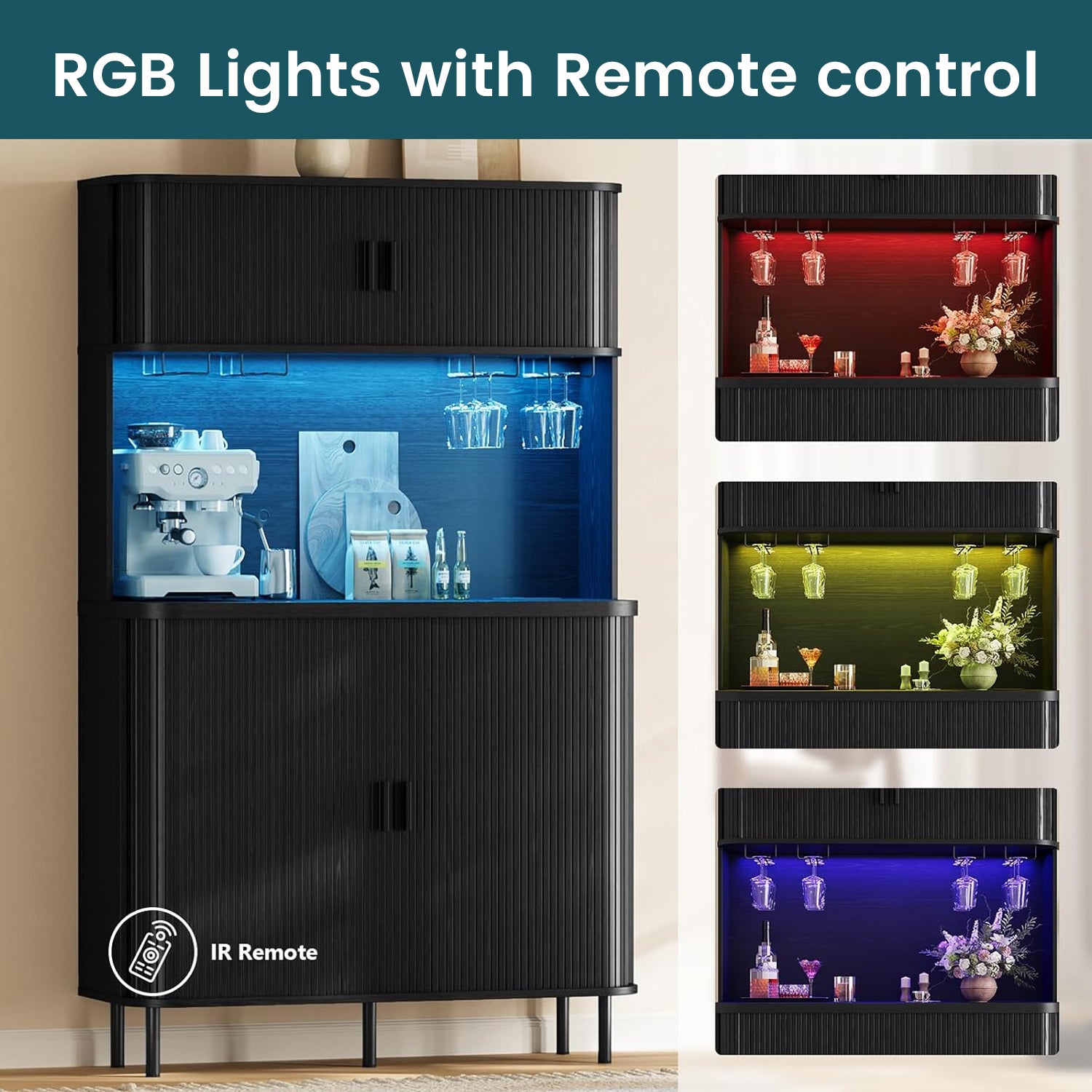 The upper shelf has RGB lighting that you can change with a remote. It’s not overly bright—just enough to give the cabinet a warm look when the room is dim. Two AC outlets and two USB ports are included, which makes charging devices simple without running cords across the room.