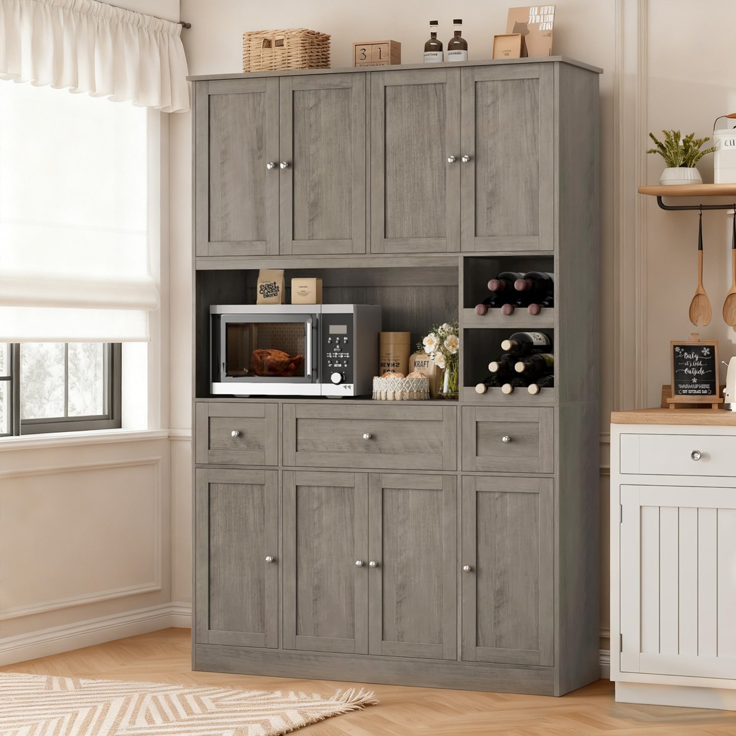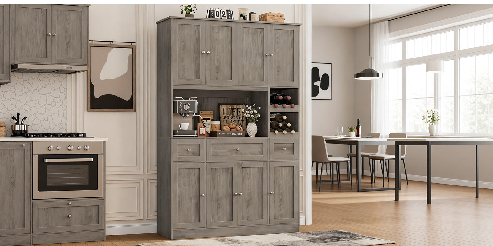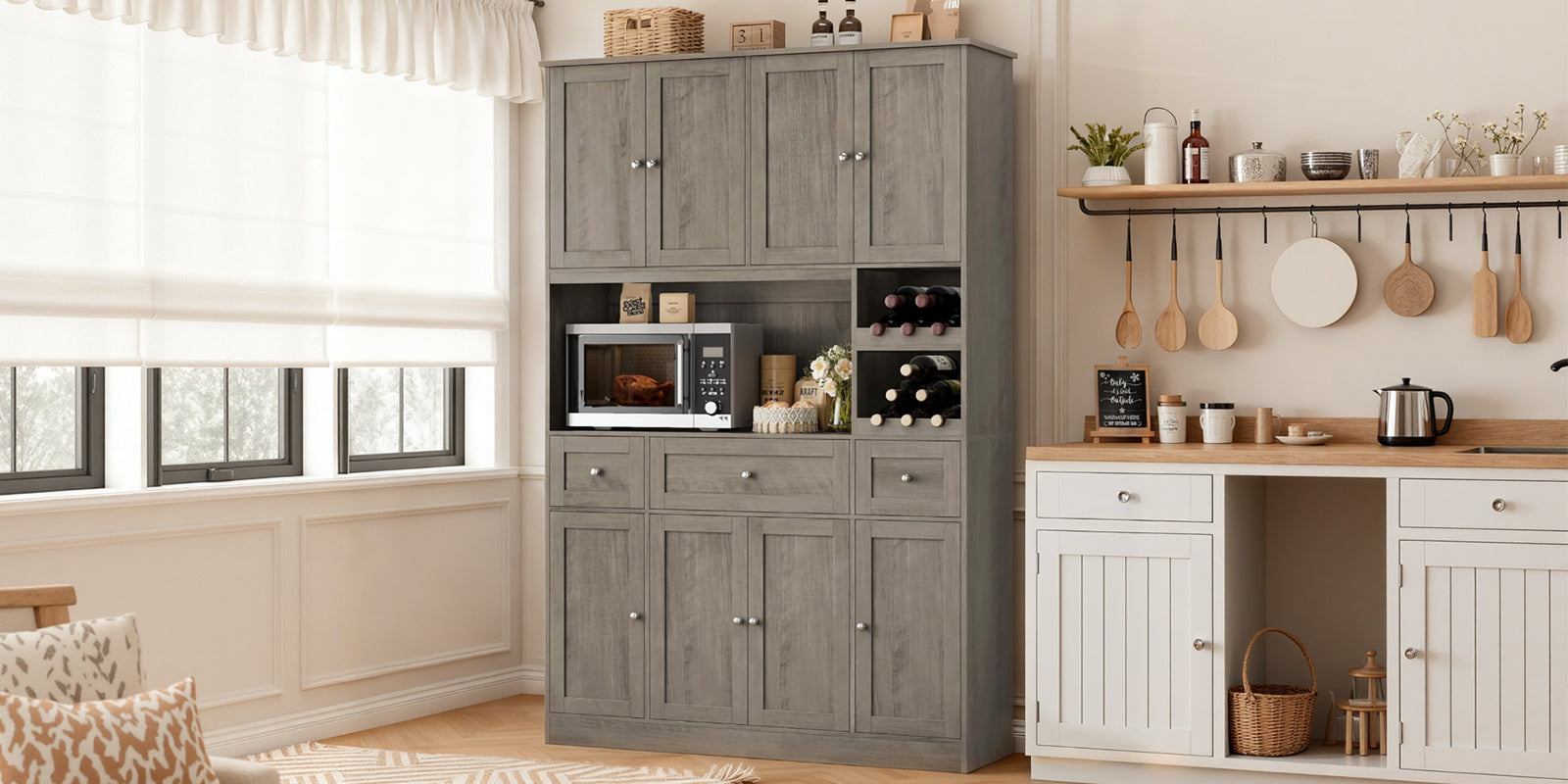This ash grey kitchen hutch cabinet brings a clean, organized look to your home while giving you tons of practical storage space. It’s built to hold your everyday kitchen essentials—from plates and pantry items to your microwave, coffee maker, or even a full setup for your morning routine or wine night.