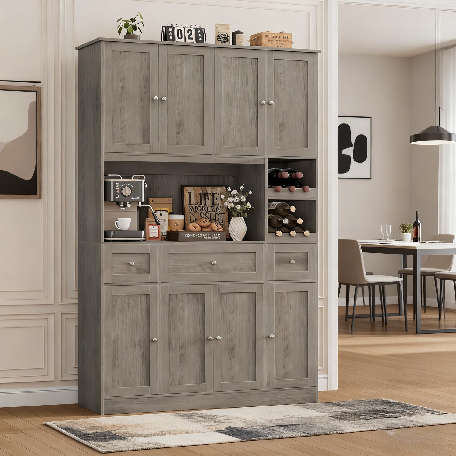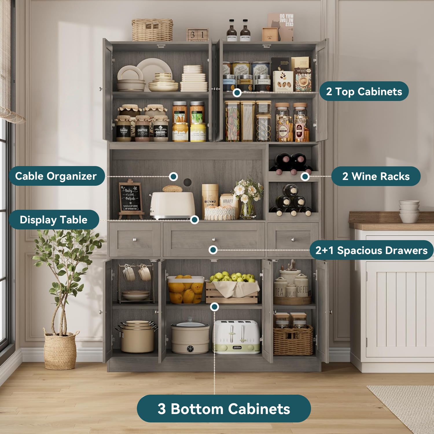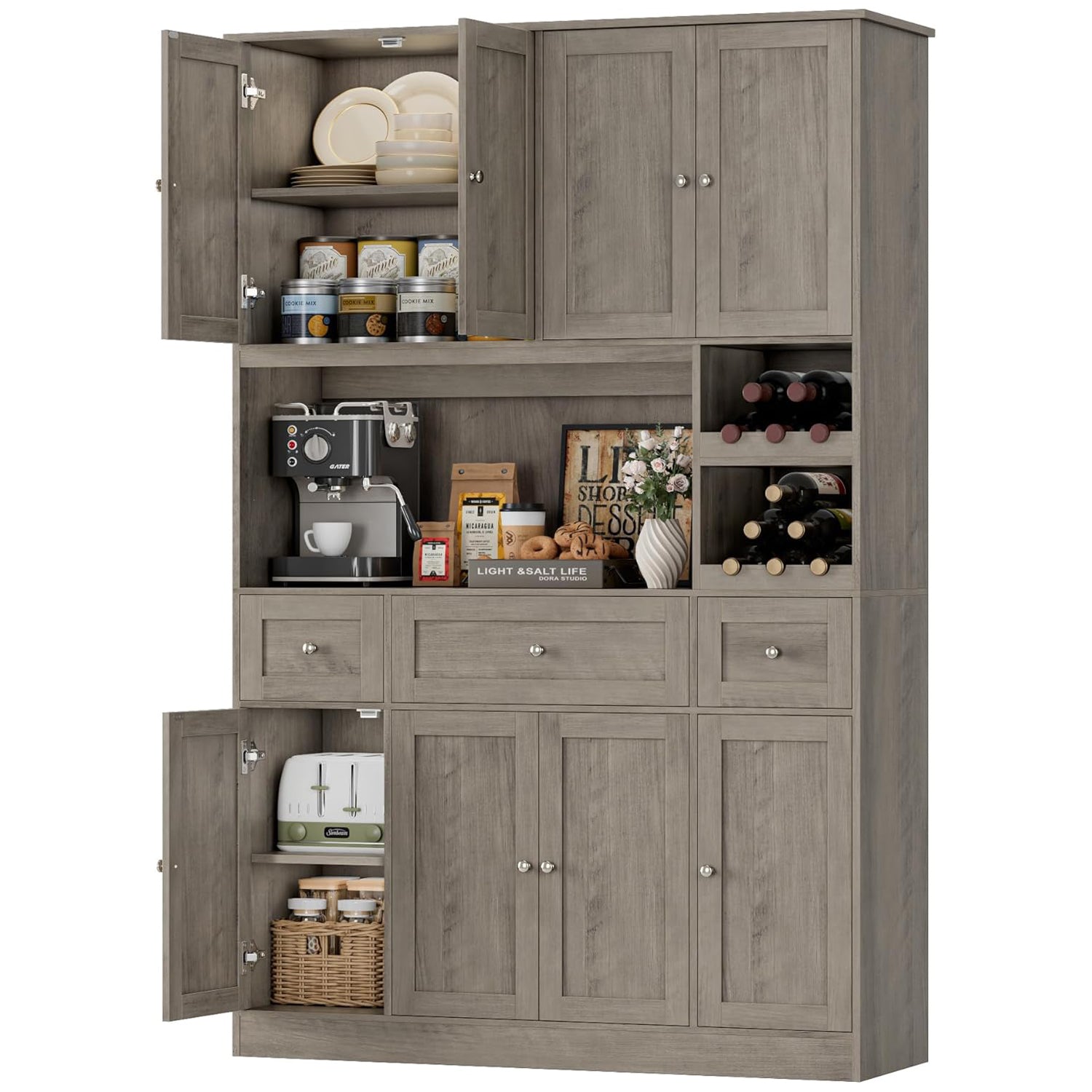 72” Tall Kitchen Hutch with Storage, Pantry Cabinet with Drawers, 5-Door Buffet Sideboard with Wine Rack & Large Countertop