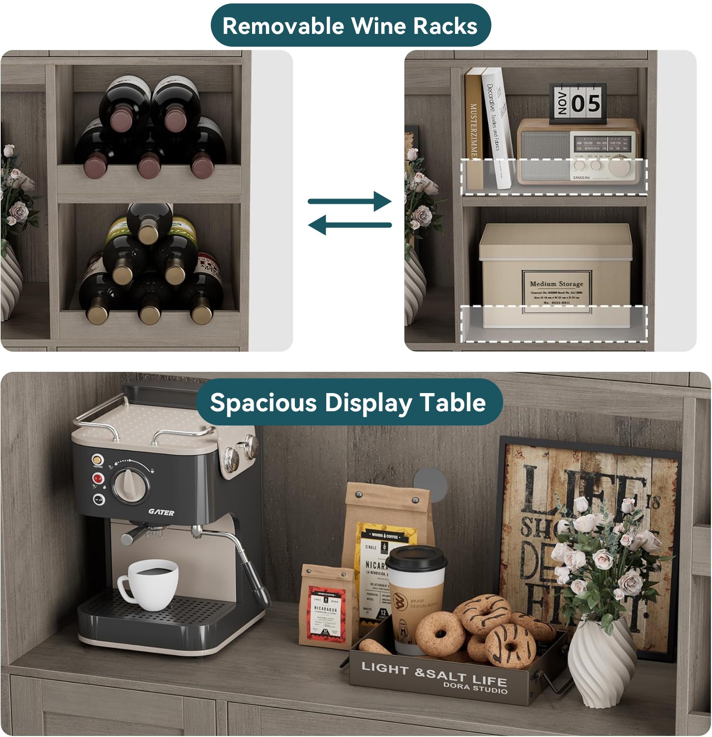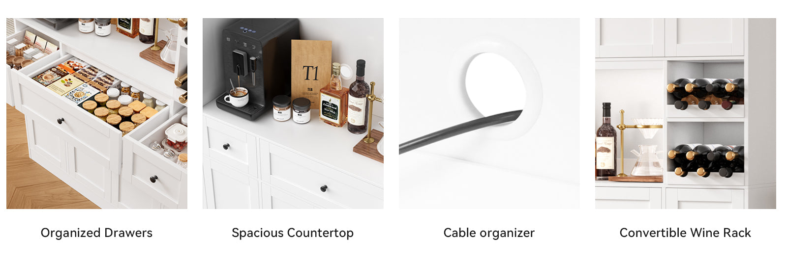 Its wide countertop also works great as a food prep station or coffee bar, and the built-in cable hole keeps your appliances neatly wired and clutter-free. The right-side wine rack features removable dividers, so you can switch it into a regular storage shelf anytime. All cabinet doors use soft-close hinges, keeping things quiet and extending the life of the cabinet.