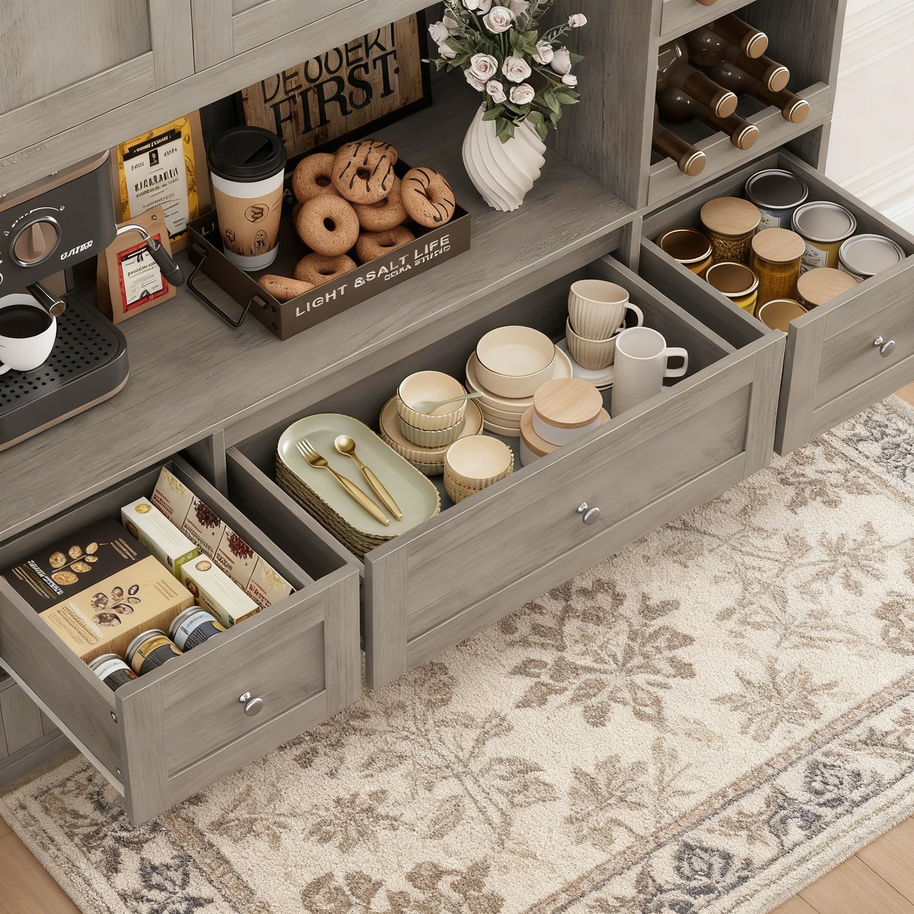 The cabinet includes 5 spacious door compartments that easily store cutlery, spices, bowls, and dry goods. Its open center countertop provides the perfect spot for a microwave, coffee machine, toaster, or extra prep space when you’re cooking. A double-layer wine rack and three smooth-glide drawers in different sizes help you keep everything organized exactly the way you like it.
