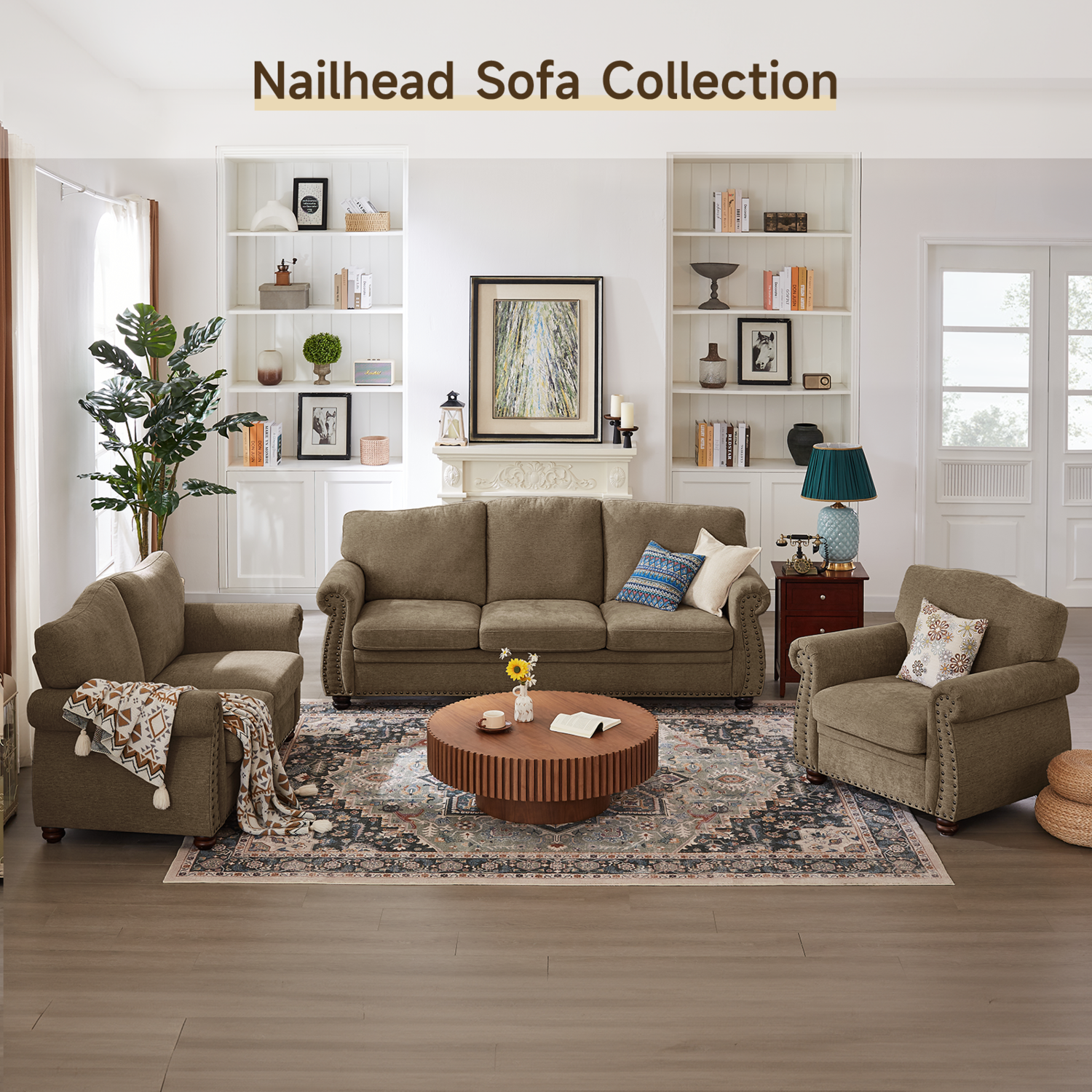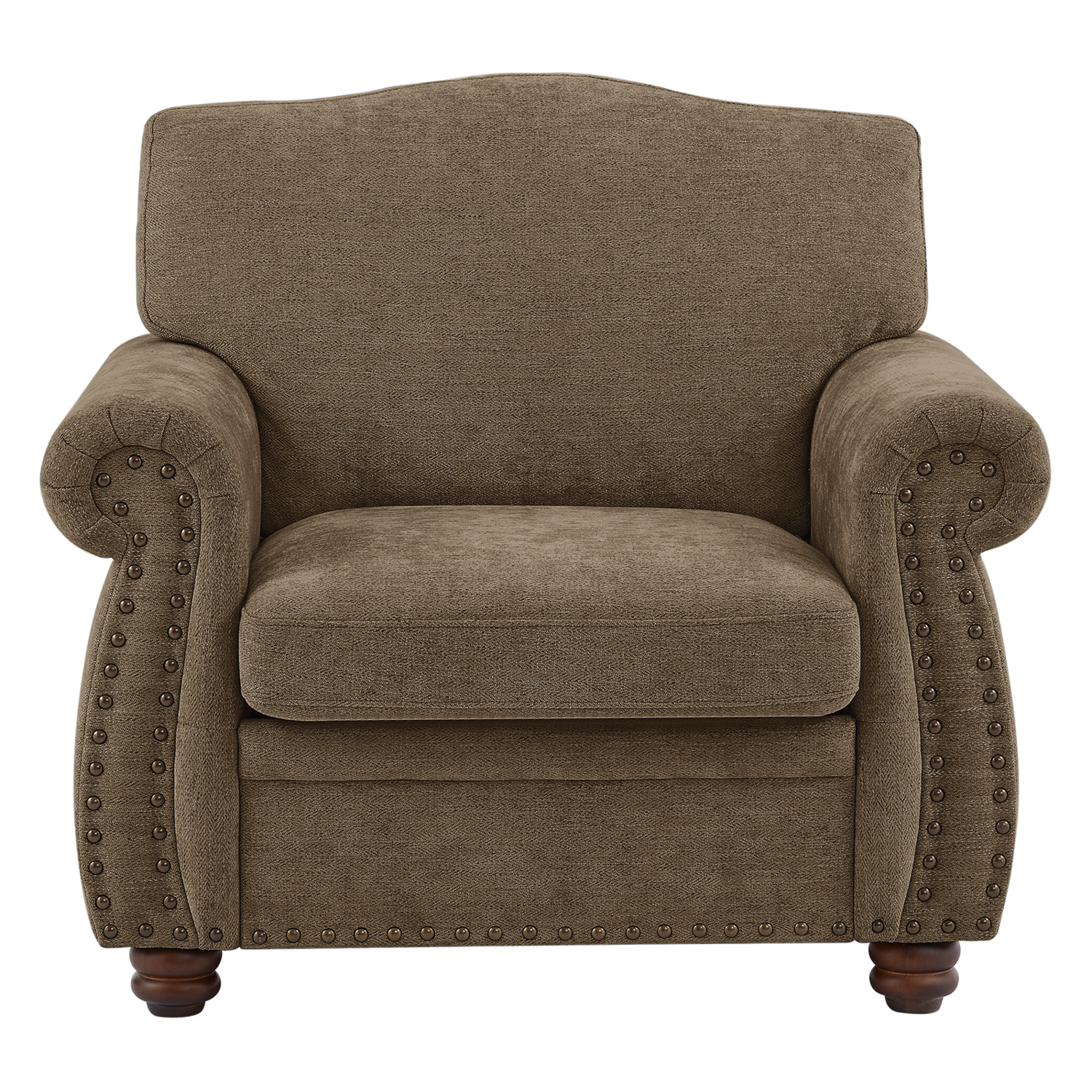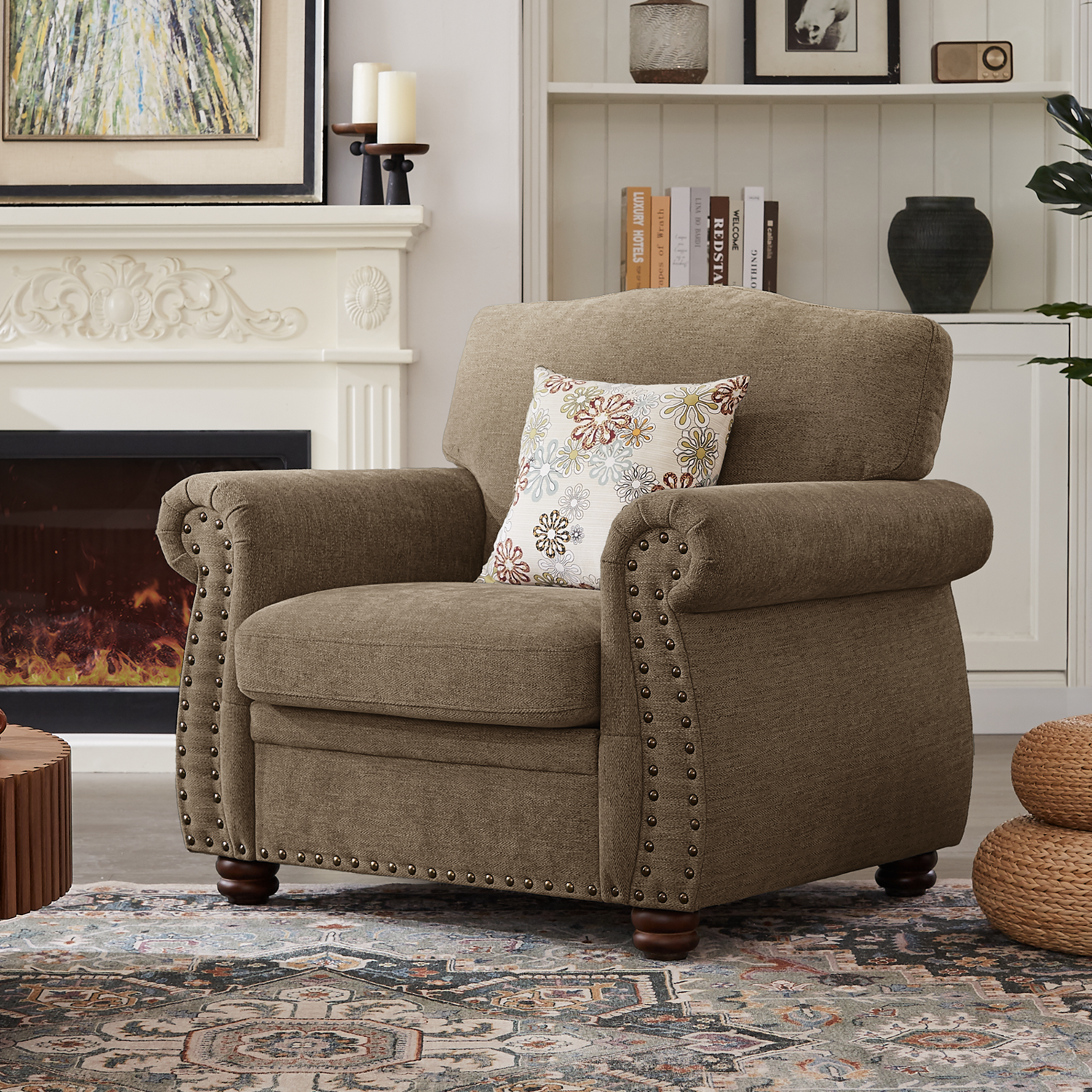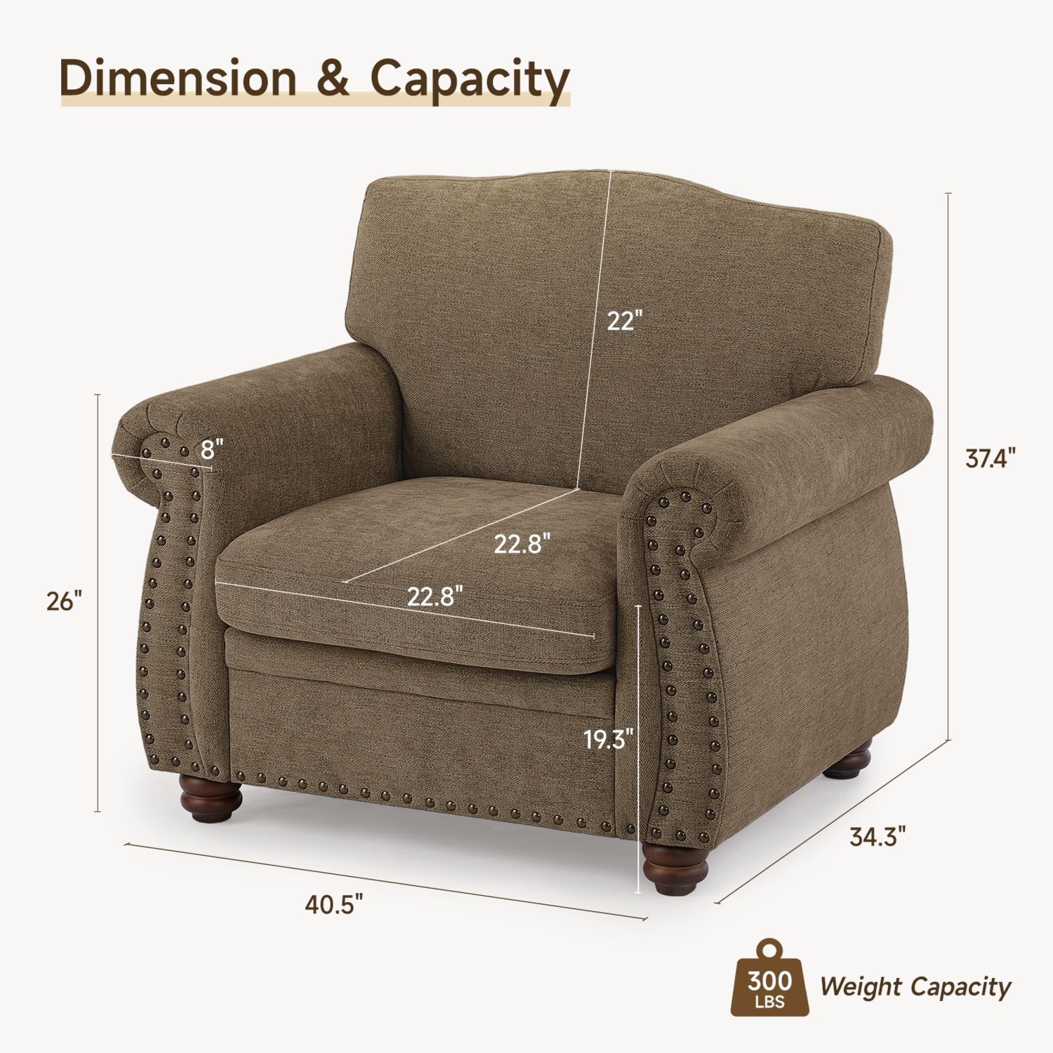This single sofa is 40.5 inches in width x 34.3 inches in depth x 37.4 inches in height, and the oversized chair features delicate nailhead trim and traditional rolled arms for a vintage vibe that suits a variety of styles of decoration.