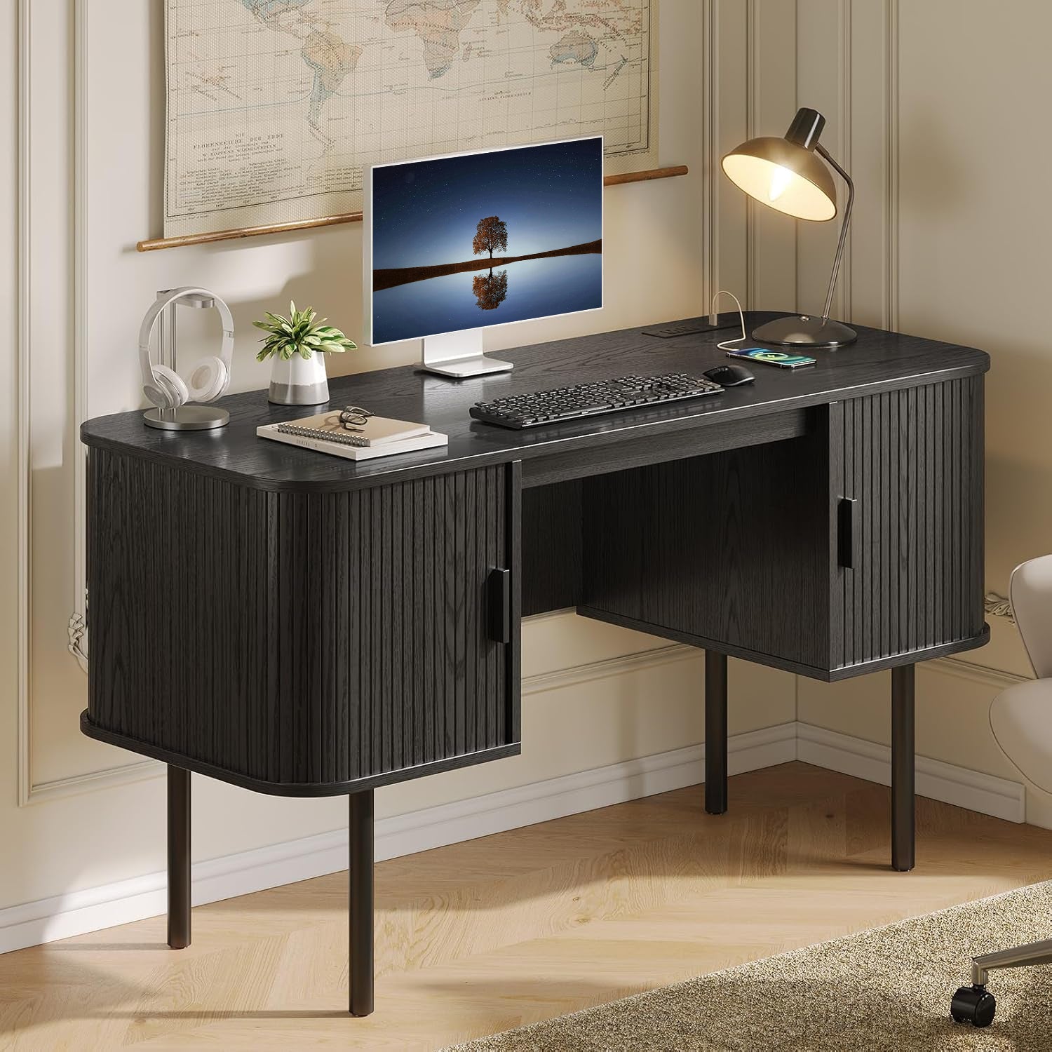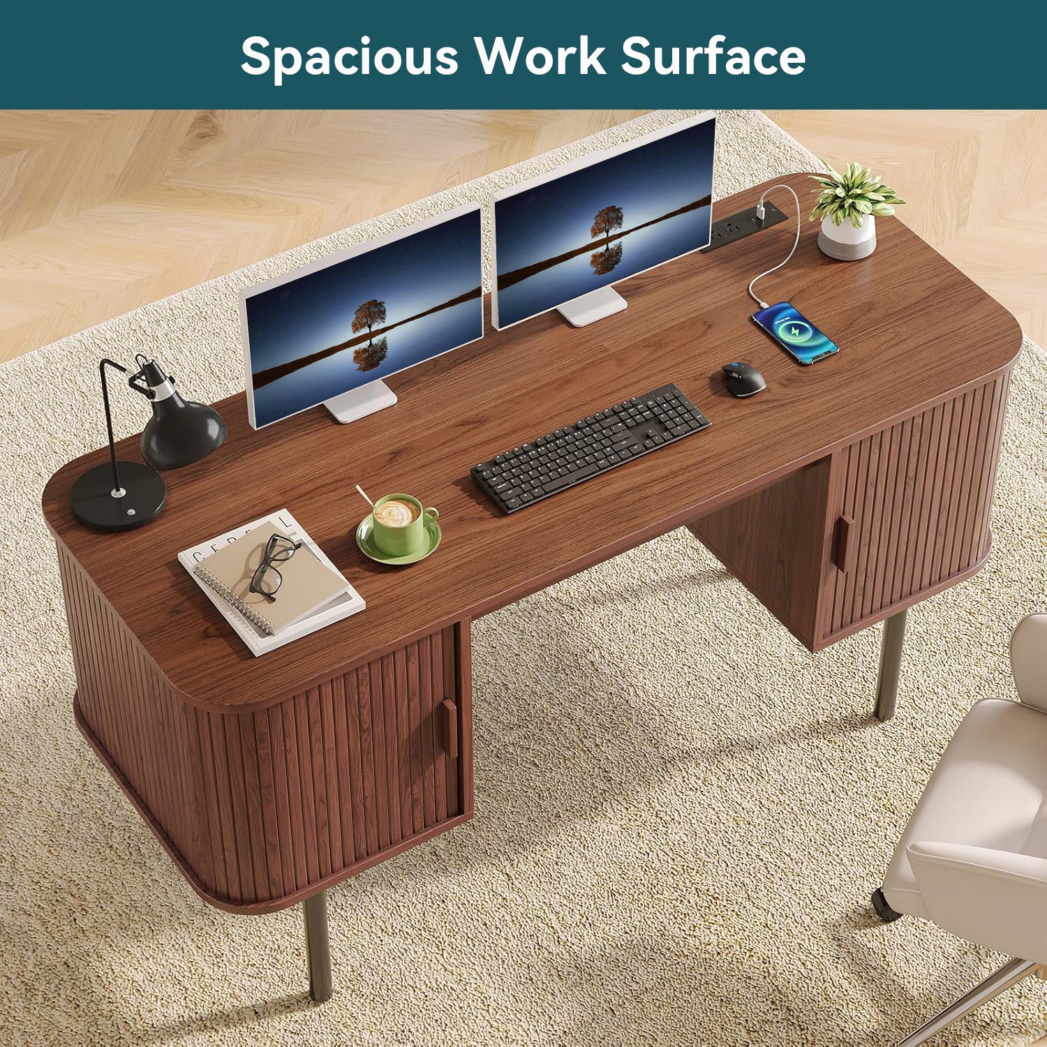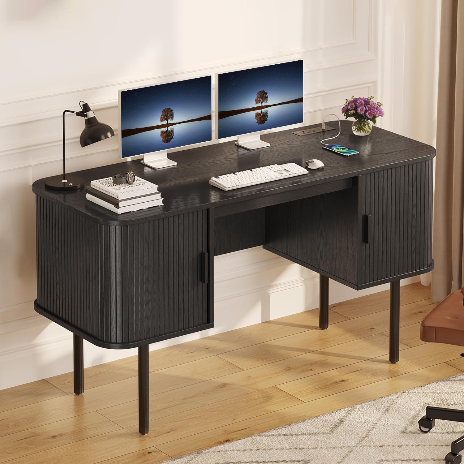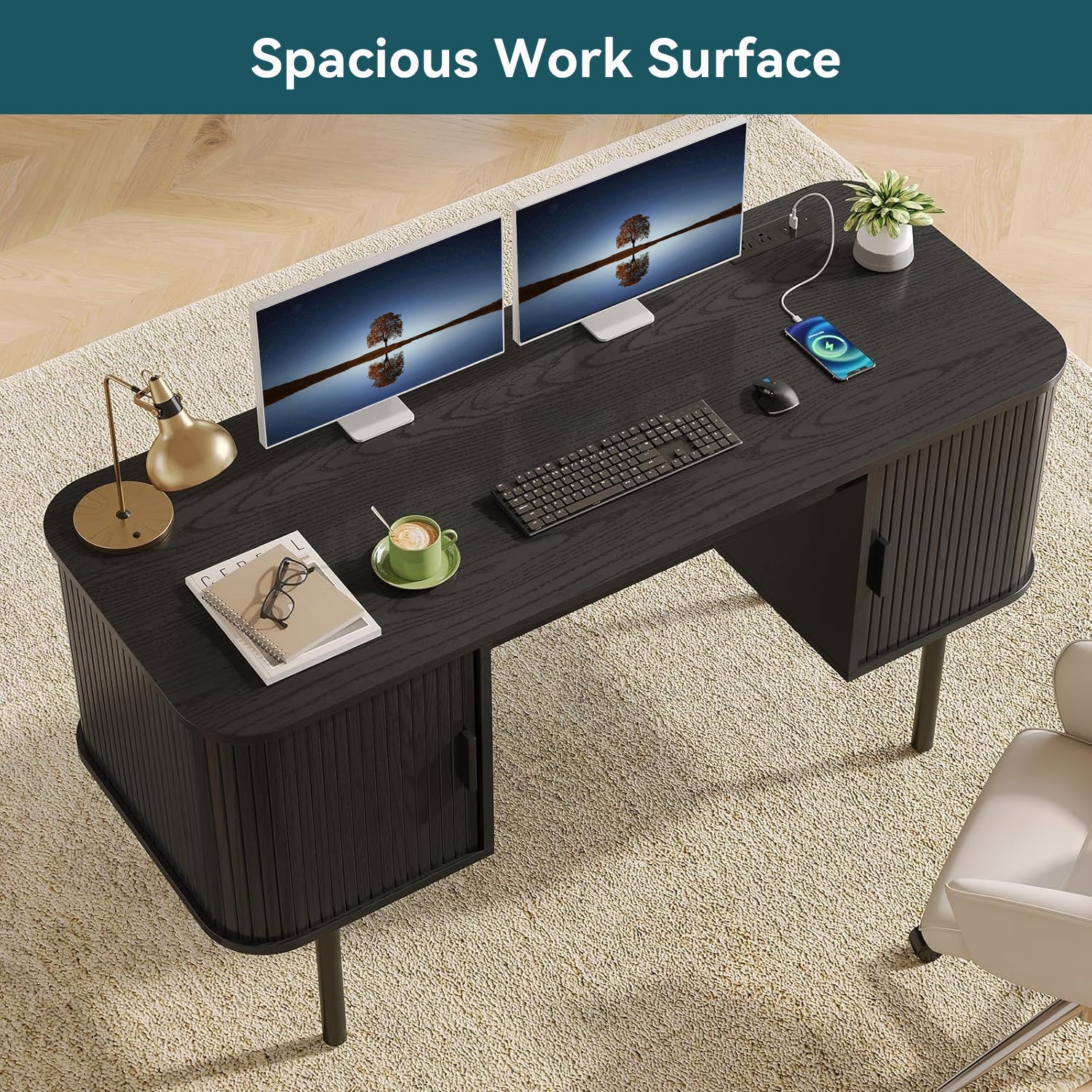 Computer Desk, Study Table, 55 Inch Home Office Desk with 2 Storage Cabinets and Power Outlets