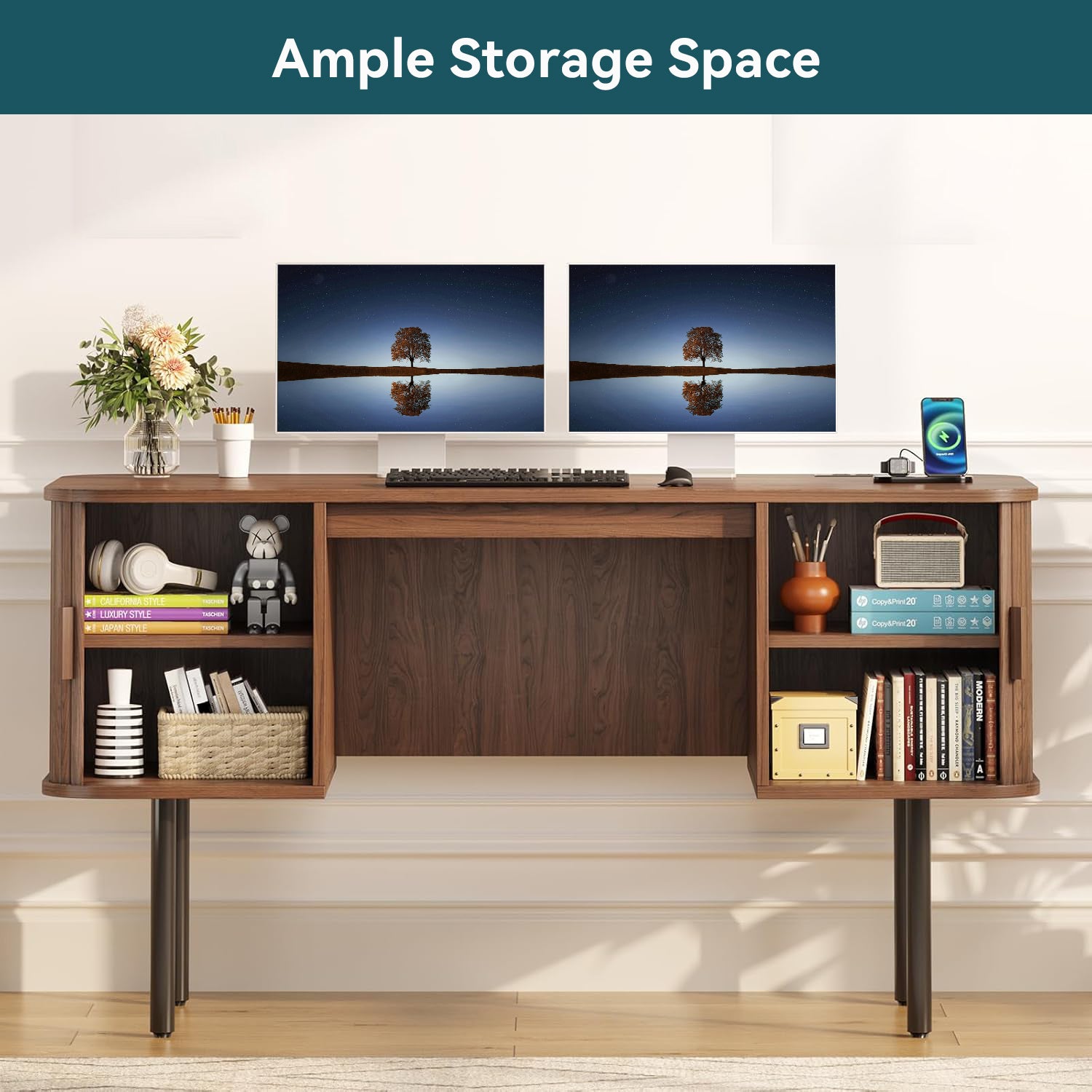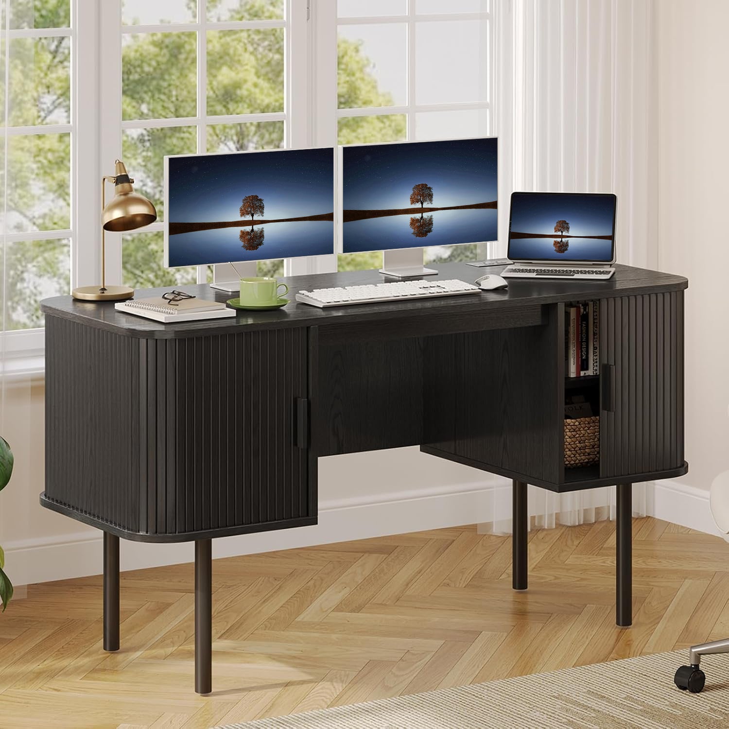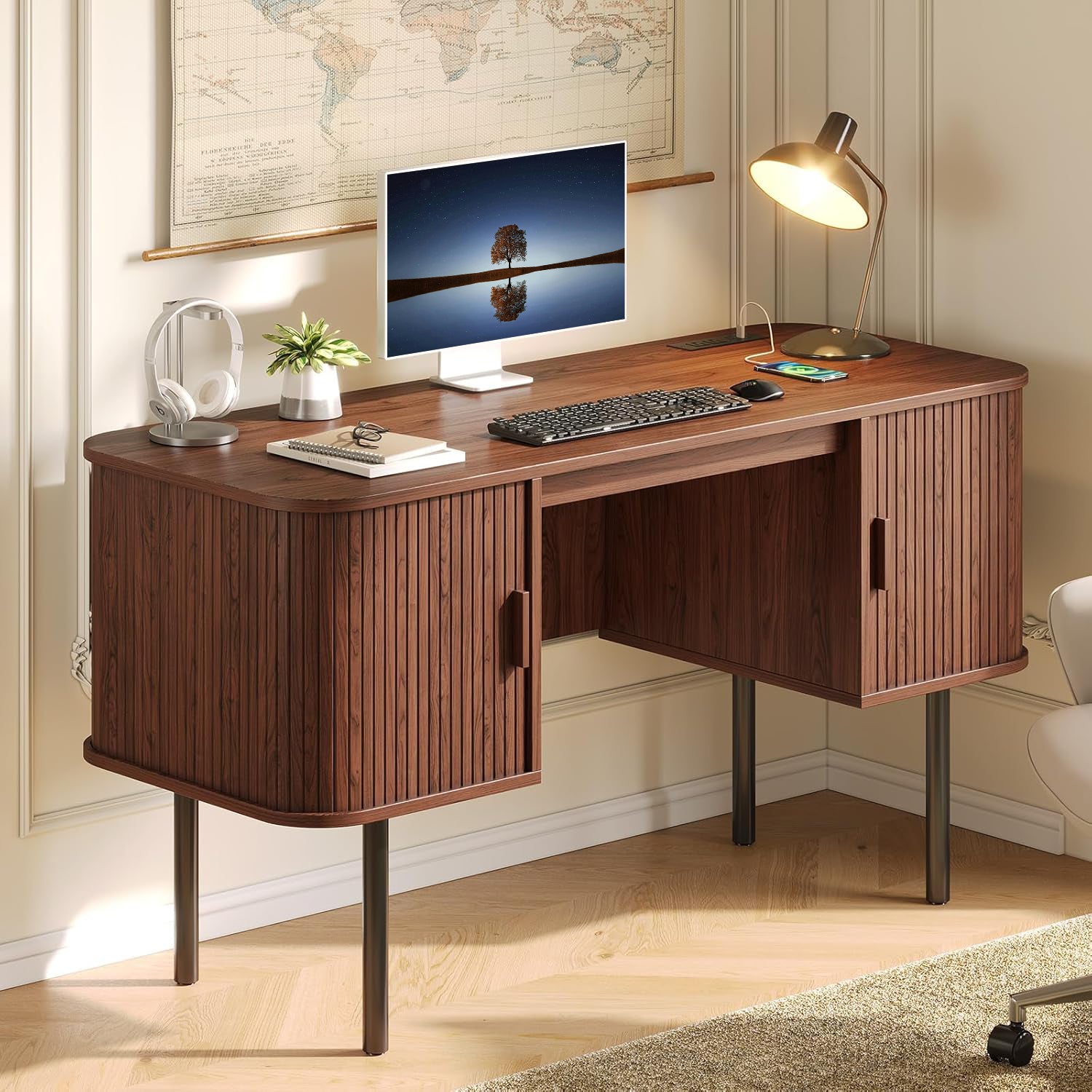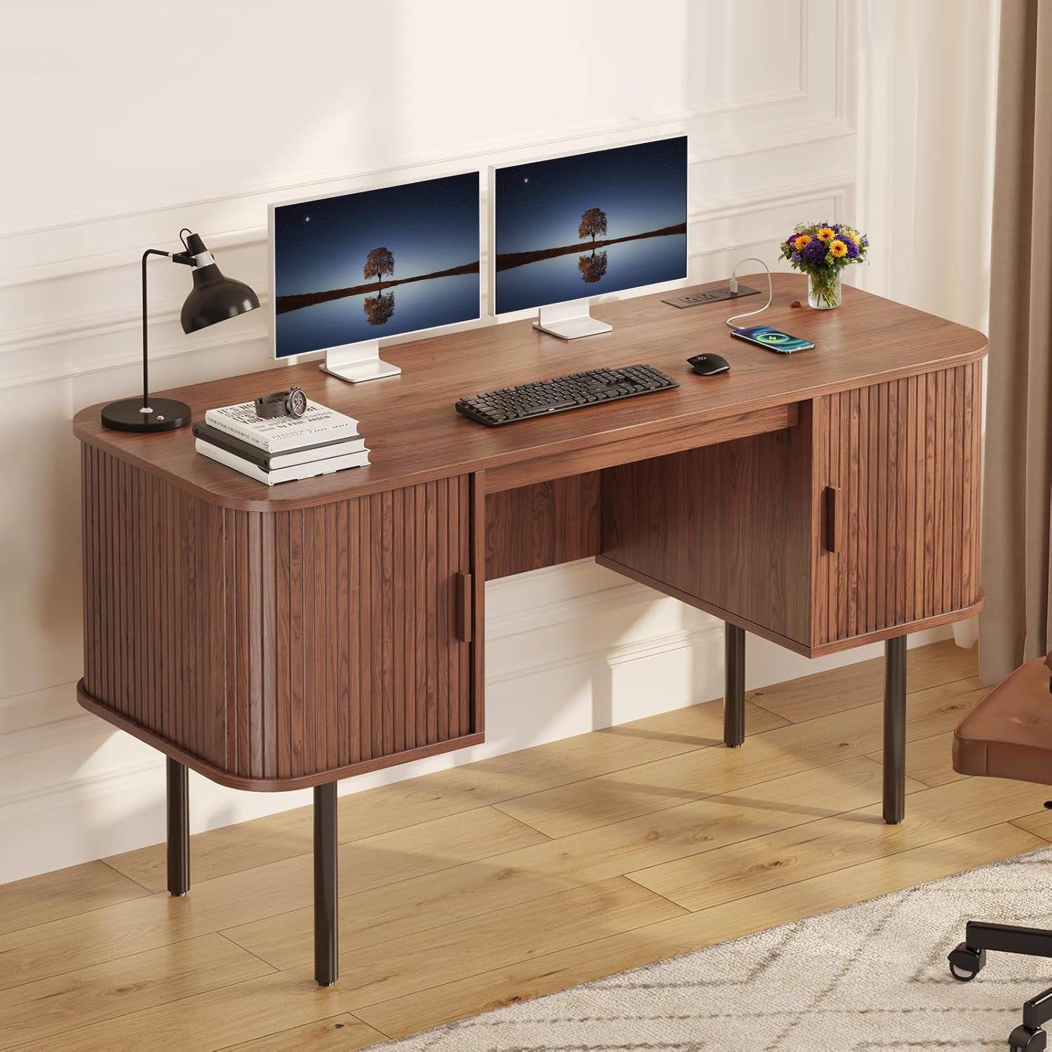 Computer Desk, Study Table, 55 Inch Home Office Desk with 2 Storage Cabinets and Power Outlets