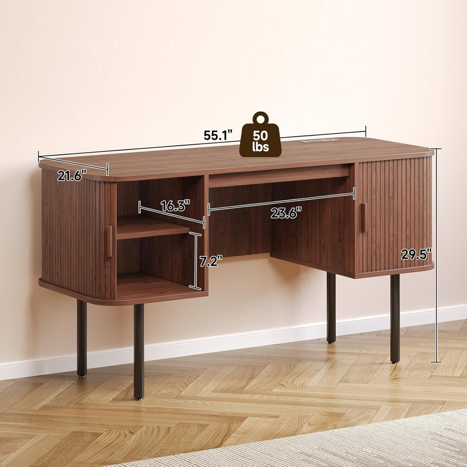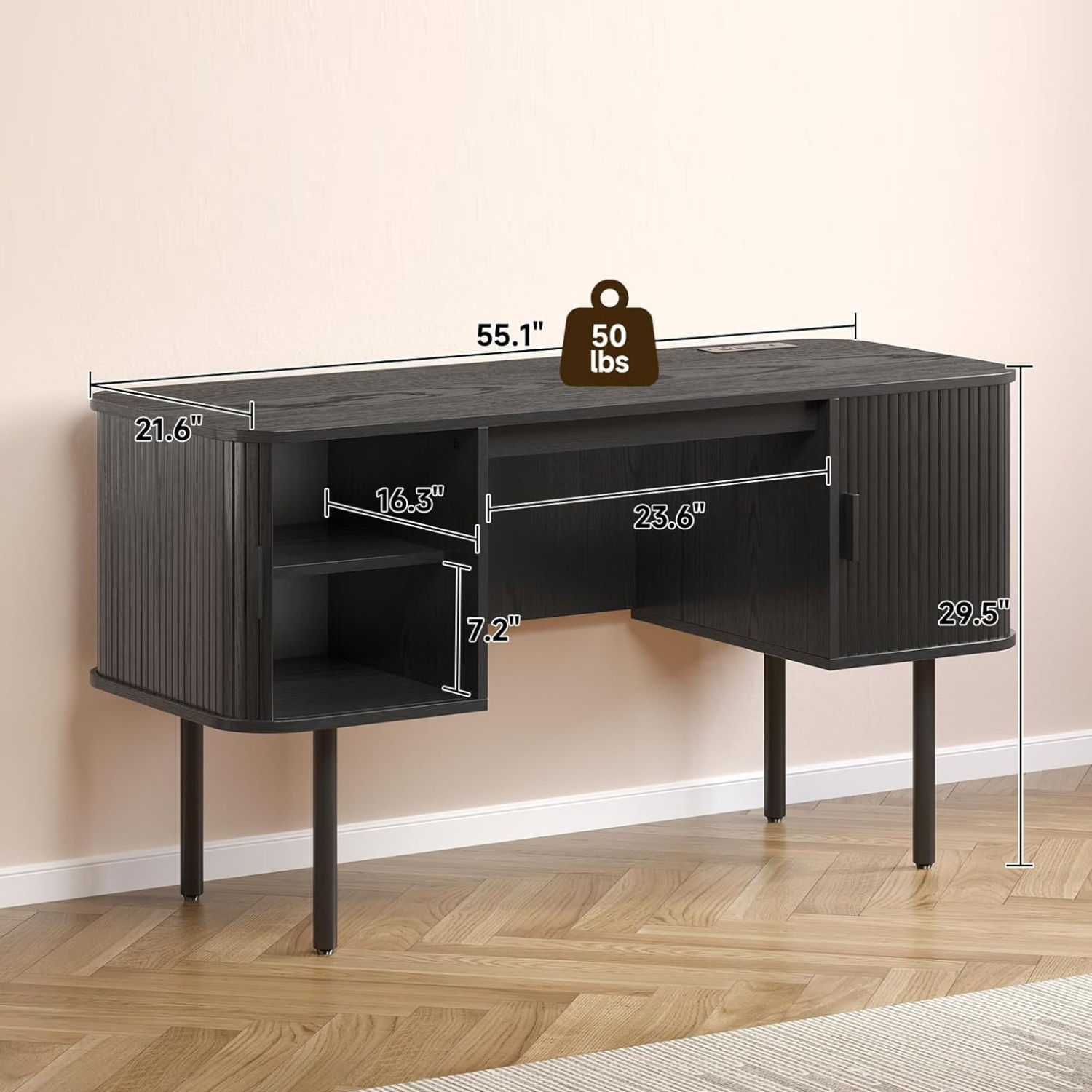 This computer desk measures 21.6"D x 55.1"W x 29.5"H, offering a spacious surface and ample storage. The desktop can support up to 50 lbs, making it suitable for computers, books, and other essentials.