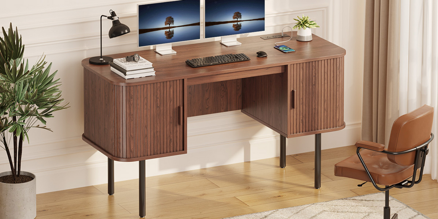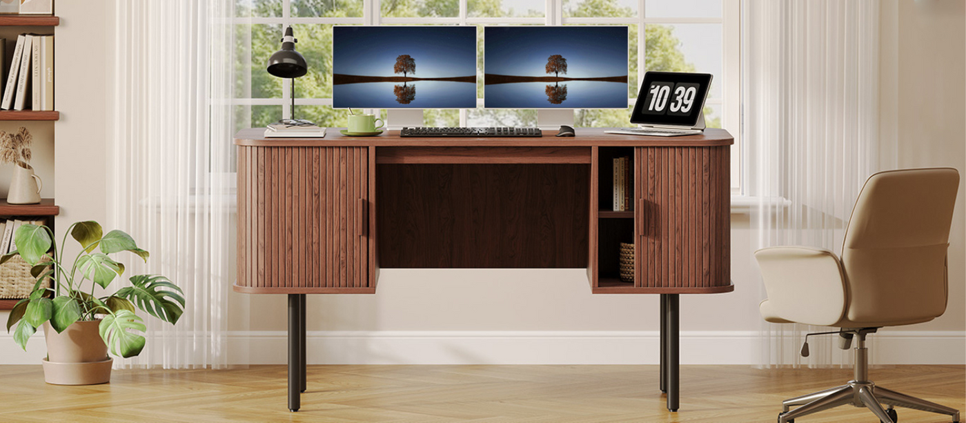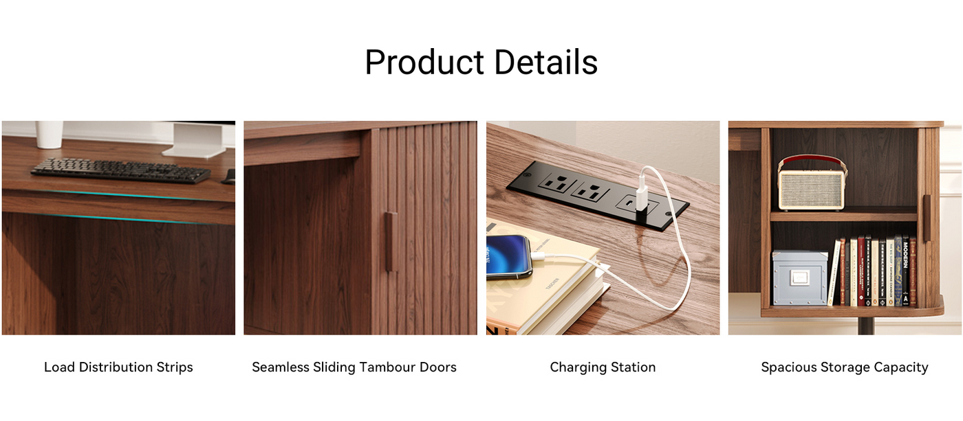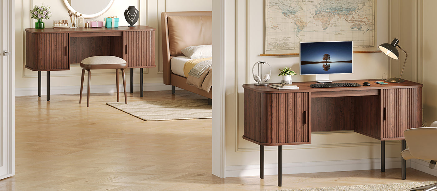 On both sides of the desk, sliding doors open smoothly to reveal two-tier storage compartments. You can open and close them as you like, providing both open and closed storage options.