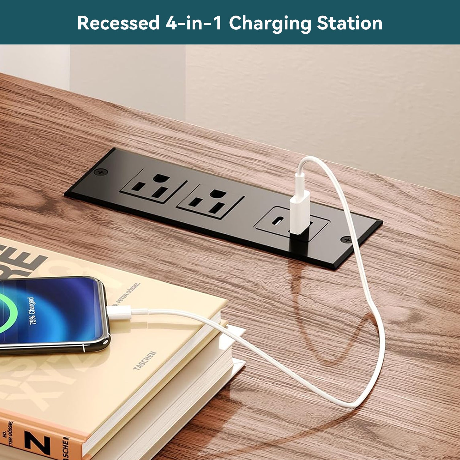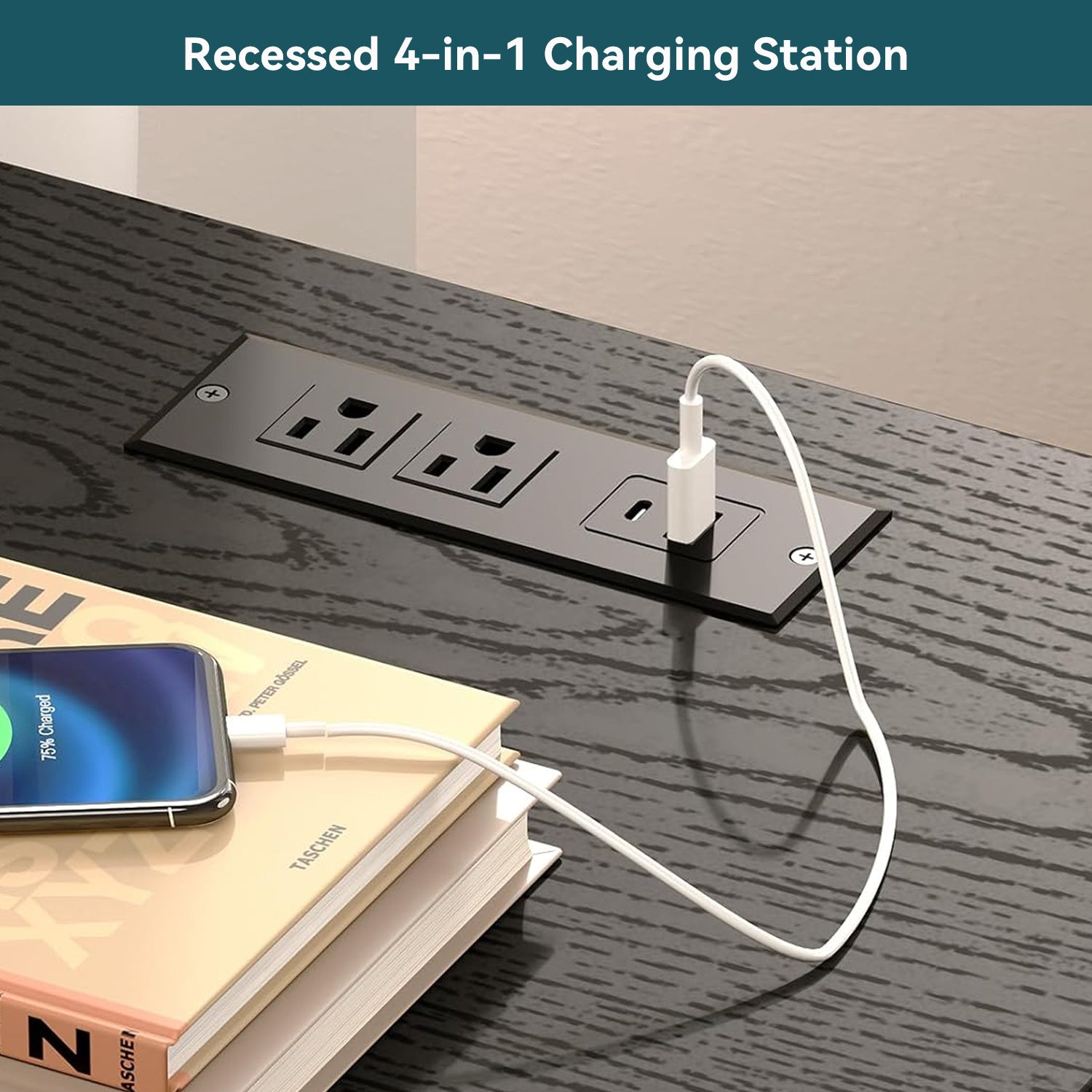 A built-in power station is located on the desktop, including two standard outlets, one USB port, and one Type-C port. A hidden cable management system helps keep wires organized and out of the way.