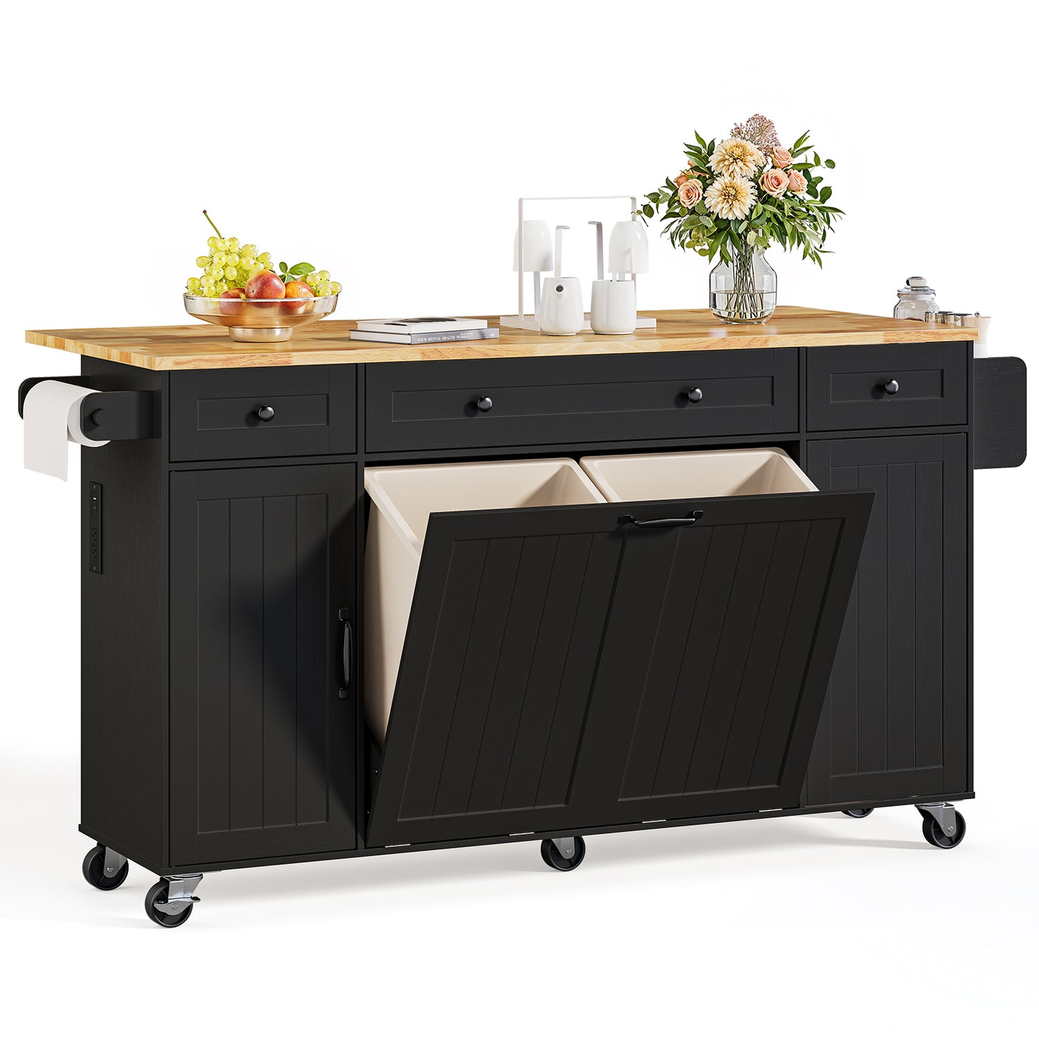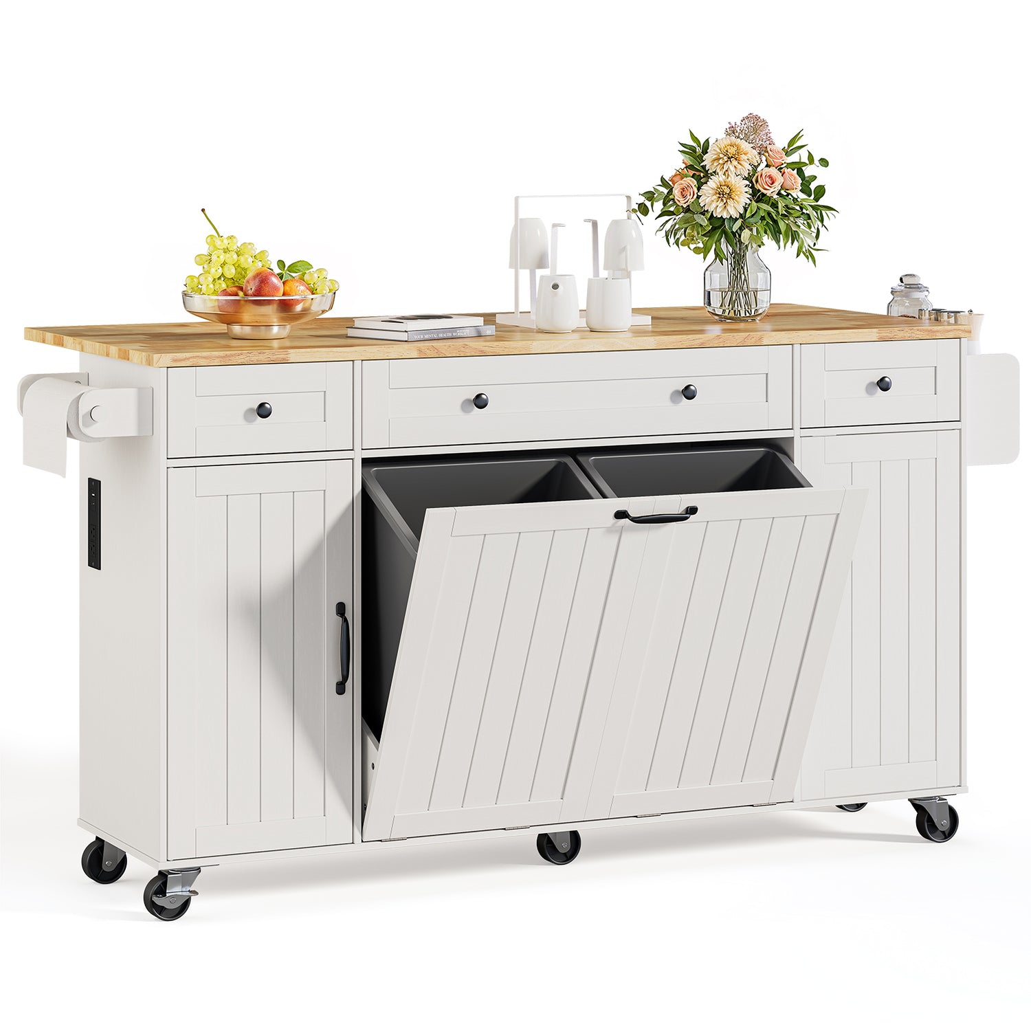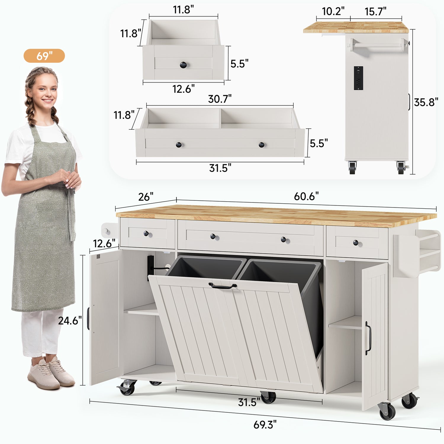 Kitchen Island with Double Tilt Out Trash Bins, 69.3'' Rolling Kitchen Cart with Drop Leaf, Drawers & Power Outlet