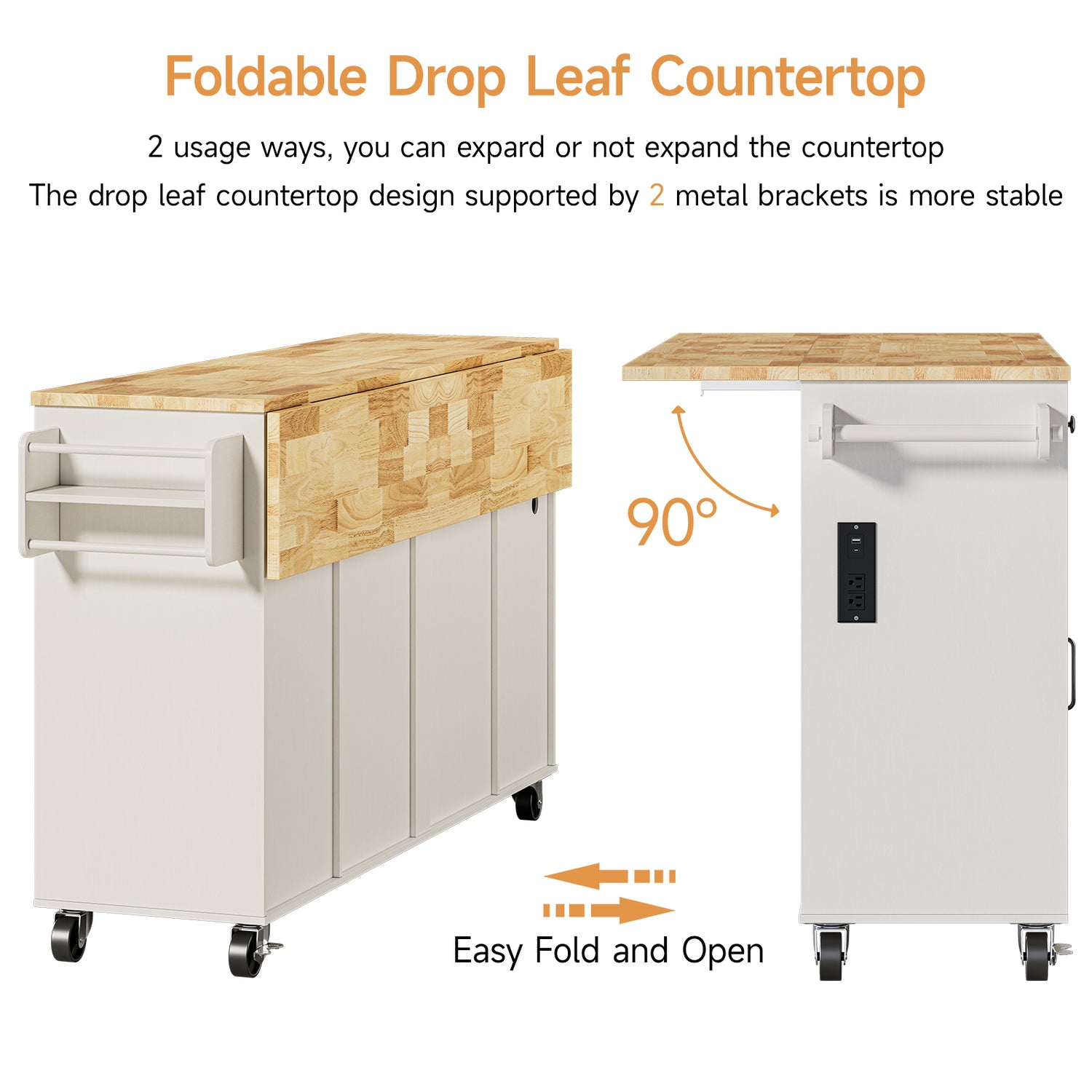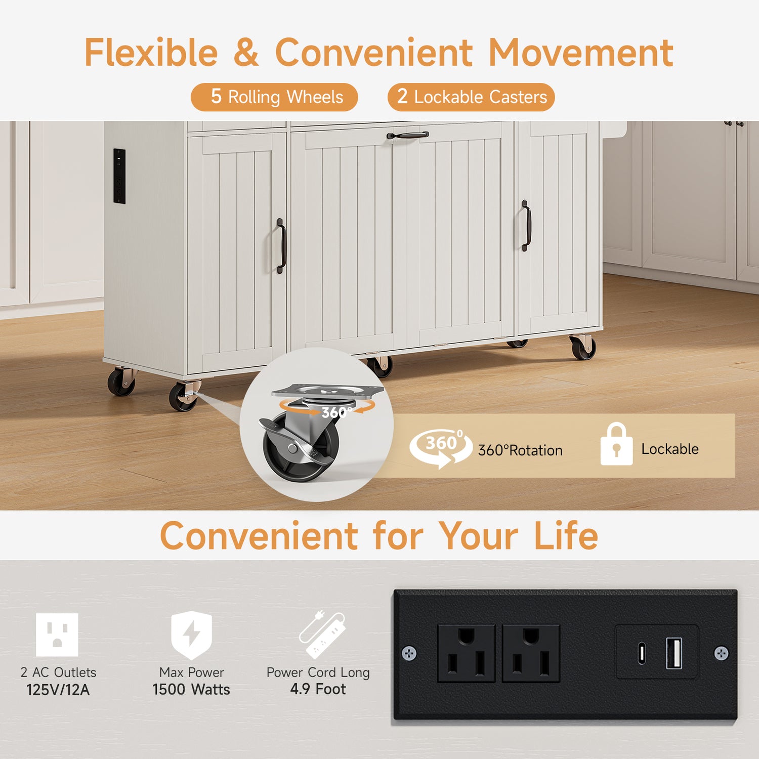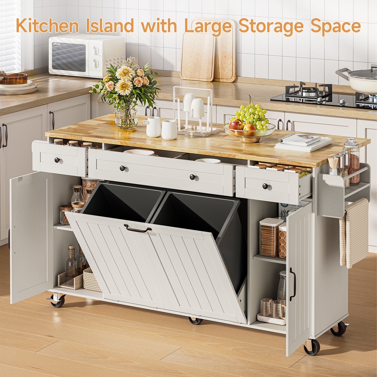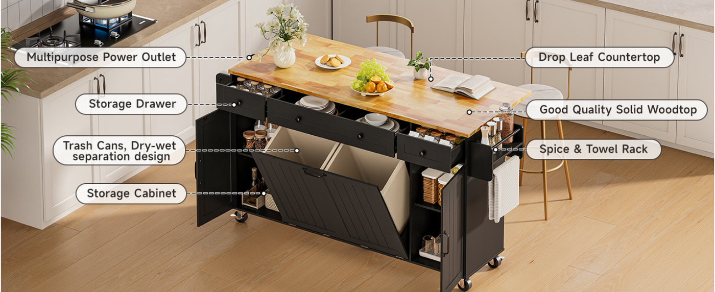 Kitchen Island with Double Tilt Out Trash Bins, 69.3'' Rolling Kitchen Cart with Drop Leaf, Drawers & Power Outlet