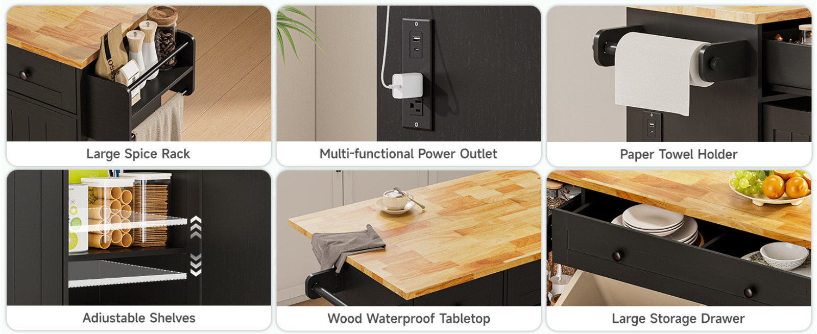 The power design also prioritizes practicality. Plug in your coffee maker in the morning, run a blender while prepping meals, or charge your phone or tablet while following recipes. Mobility is smooth and stable thanks to the five-wheel caster system, while two lockable casters keep it firmly in place during use.