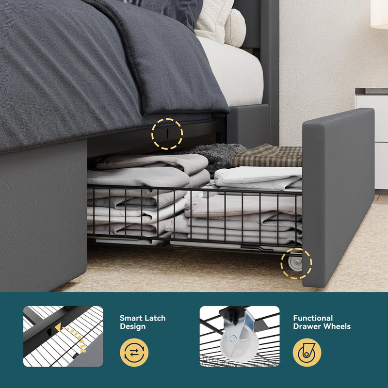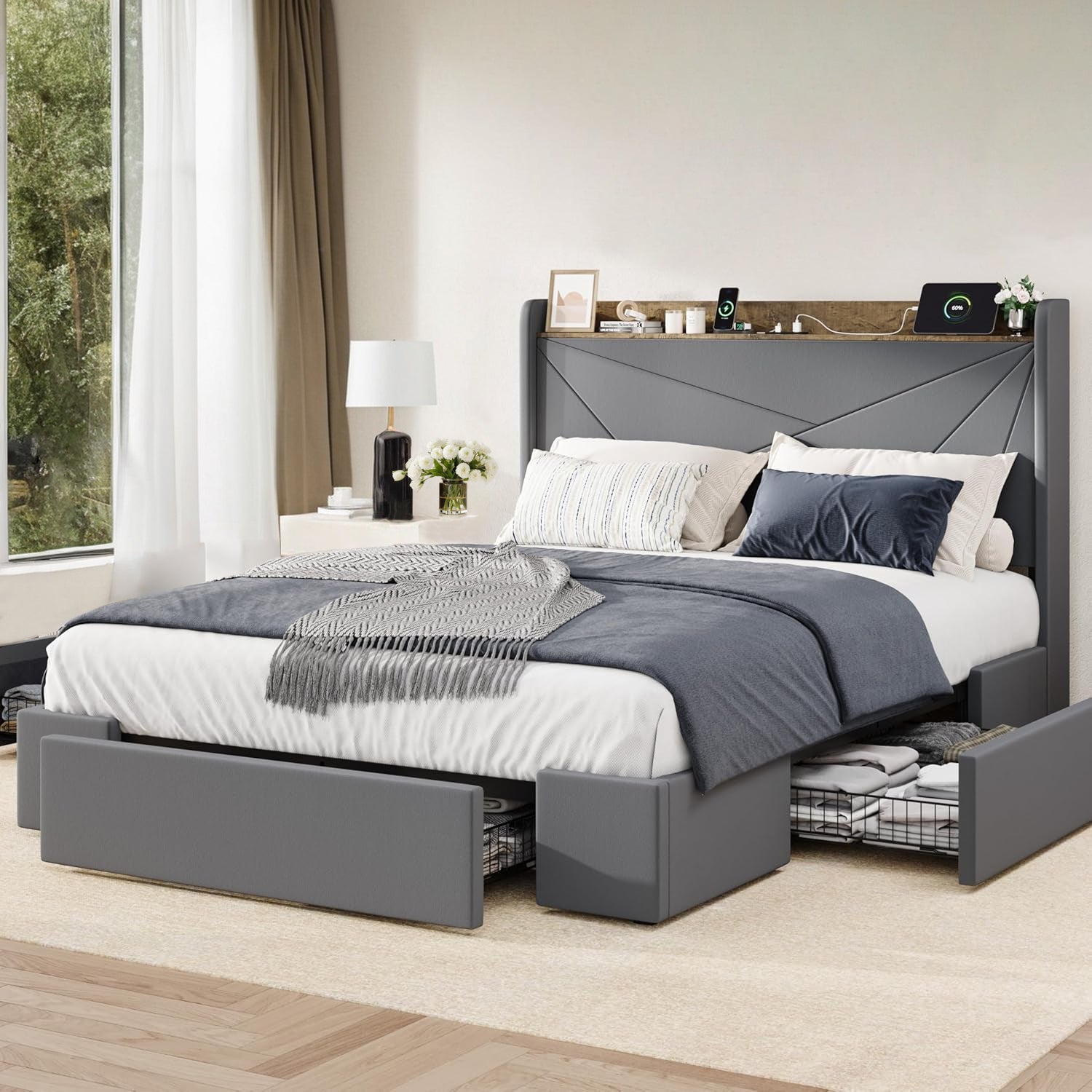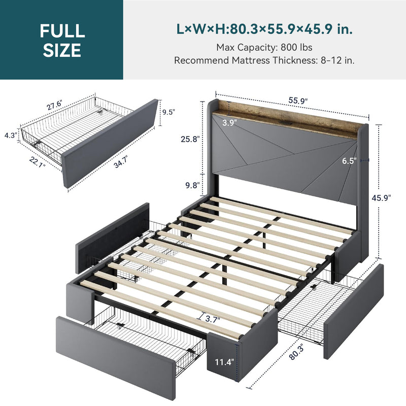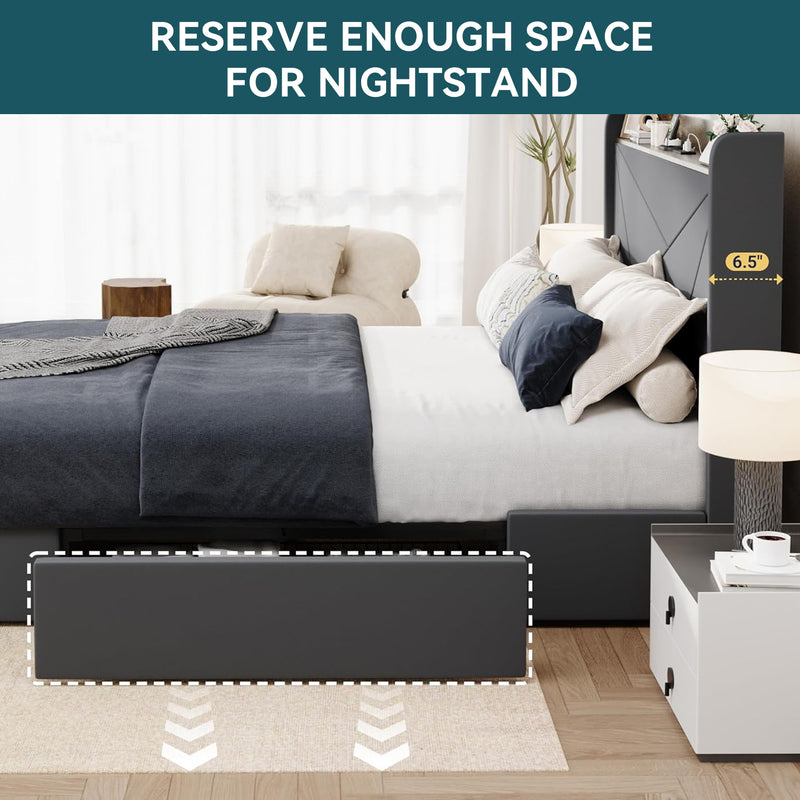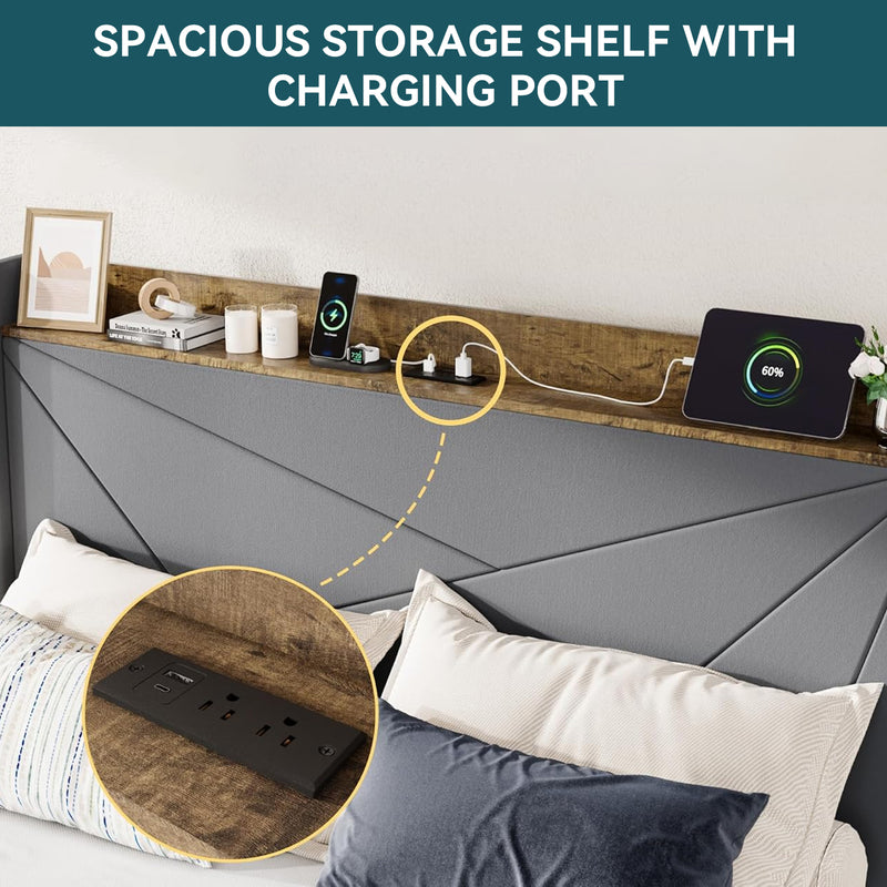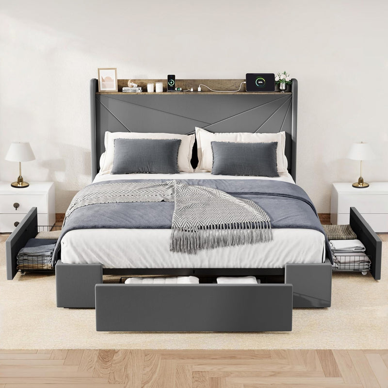 Upholstered Bed Frame with 3 Drawers Storage and and Headboard with USB Ports, No Box Spring Needed