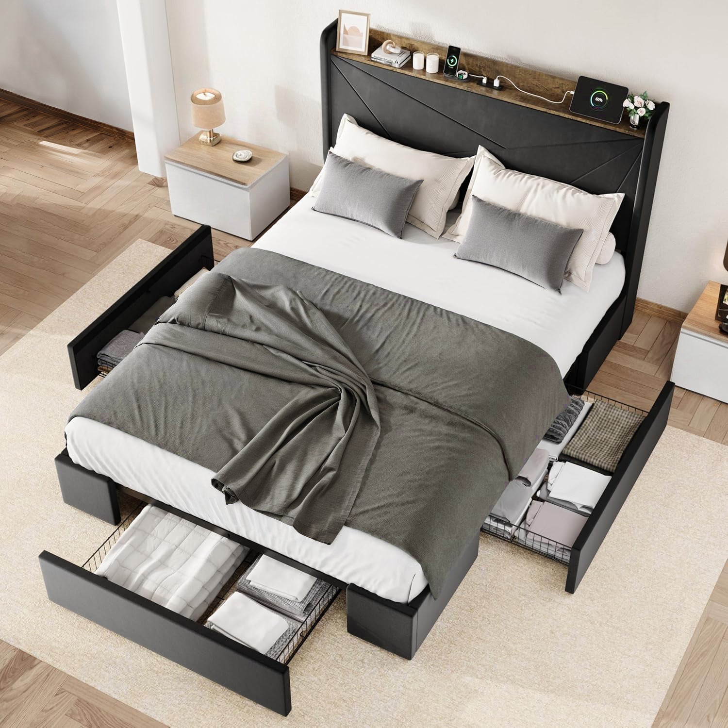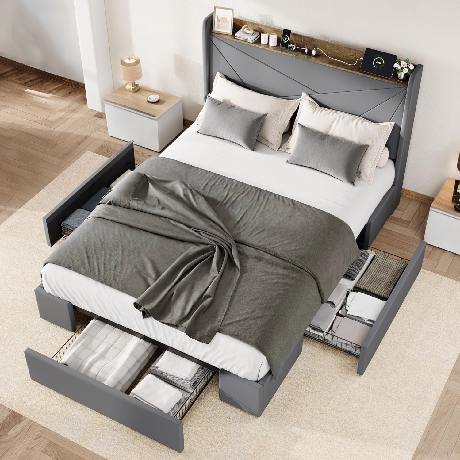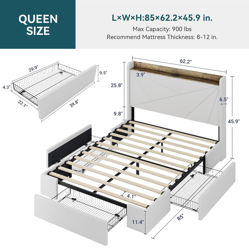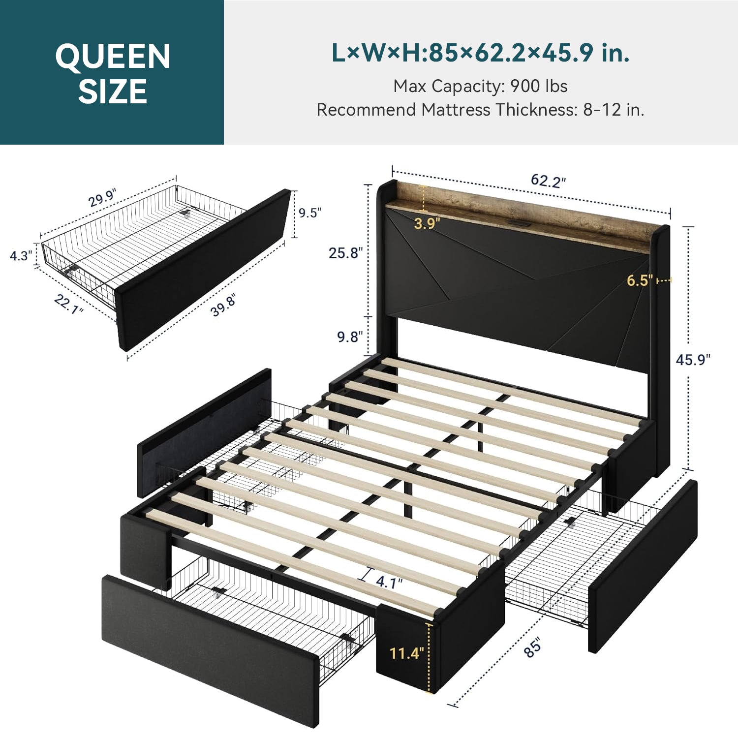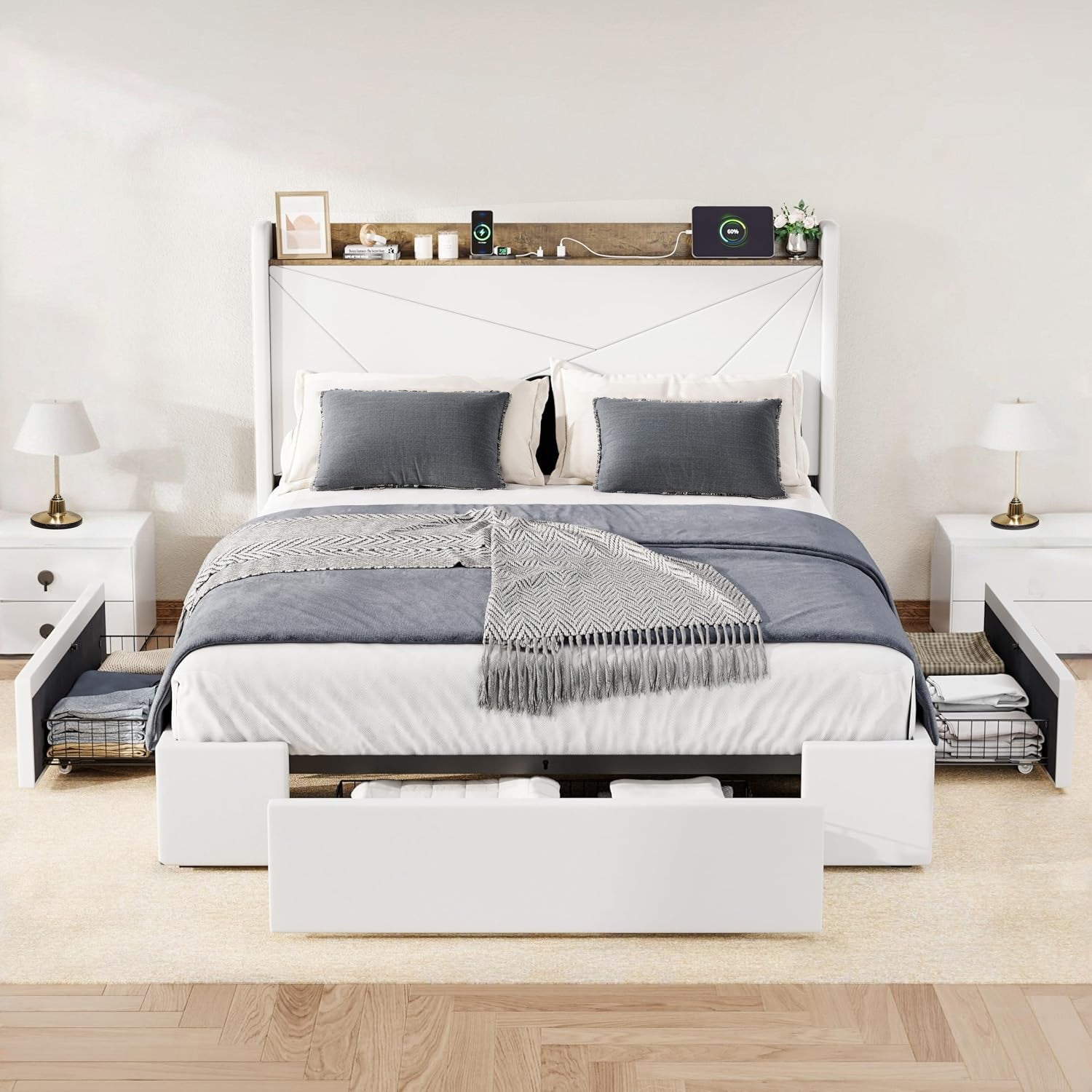 Upholstered Bed Frame with 3 Drawers Storage and and Headboard with USB Ports, No Box Spring Needed