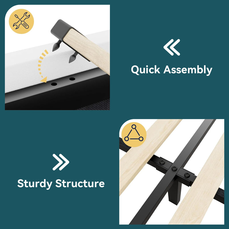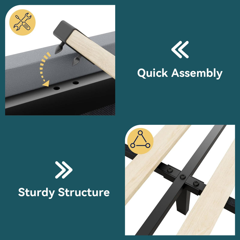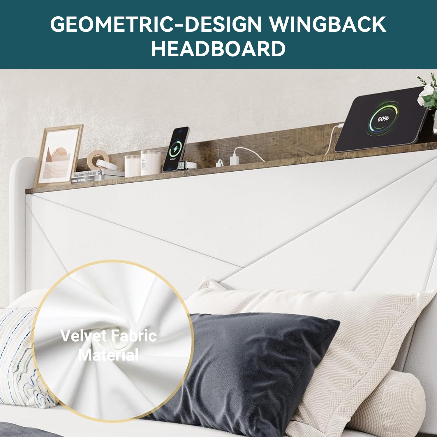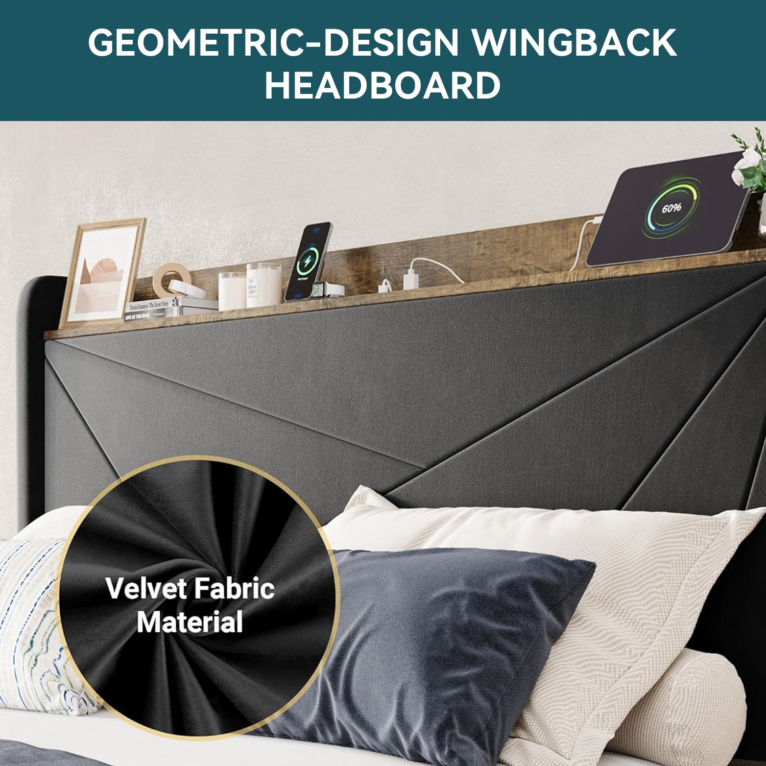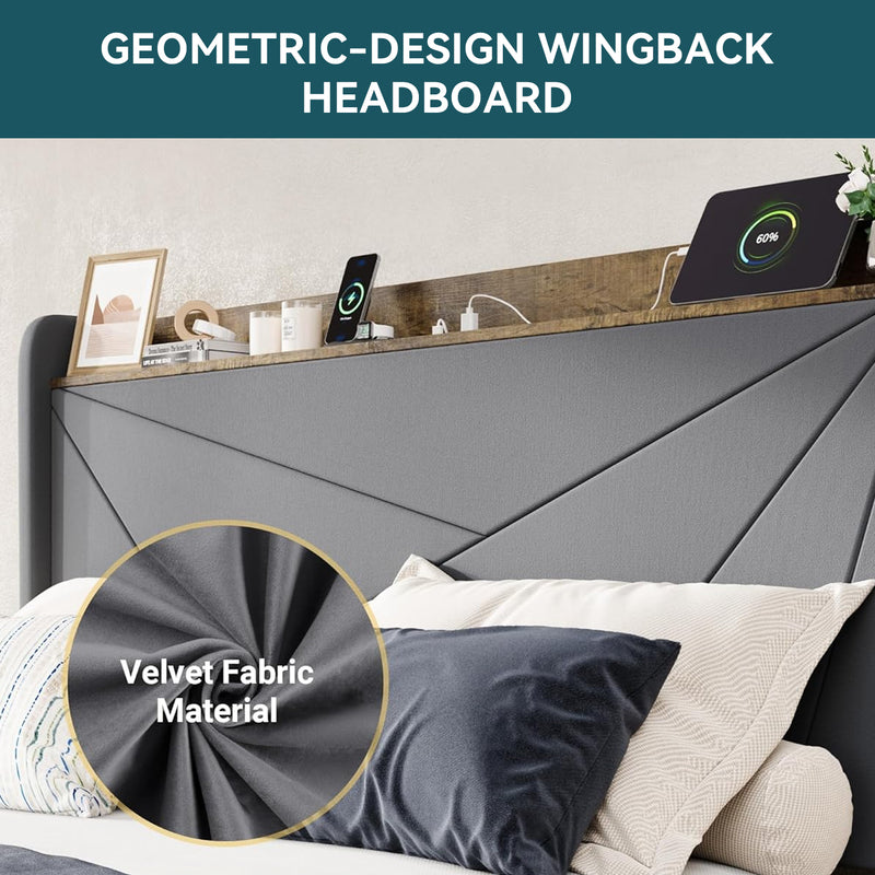 This velvet bed frame is crafted from premium velvet, offering a soft, delicate touch and a natural sheen. The fabric is durable, wrinkle-resistant, and perfectly complements modern, high-end home decor, making it an ideal choice for those seeking both luxury and longevity. The headboard features an integrated charging station, equipped with 2 AC power outlets, 1 USB port, and 1 Type-C port. Charge multiple devices, including phones, tablets, and laptops, all at once—ideal for pre-bedtime entertainment and work-related charging needs. Beneath the bed, you'll find three spacious storage drawers that make it easy to store and access your items. These drawers come with drawer locks, providing secure storage for bedding, clothing, and other essentials. The wingback headboard is designed with a built-in storage shelf, perfect for organizing small items like books, glasses, and remotes, keeping everything neatly stored and easily accessible. This bed features a heavy-duty metal frame reinforced with thick wooden slats, providing excellent support and ensuring long-term durability. The frame eliminates the need for a box spring, and EVA strips between the slats minimize friction noise, creating a quieter and more peaceful sleeping environment. This easy-to-assemble bed frame comes with all the necessary parts, tools, and clear instructions. The modular drawer design allows for flexible placement, so you can arrange the three drawers in any direction. Assembly is quick and simple, easily manageable by one person.