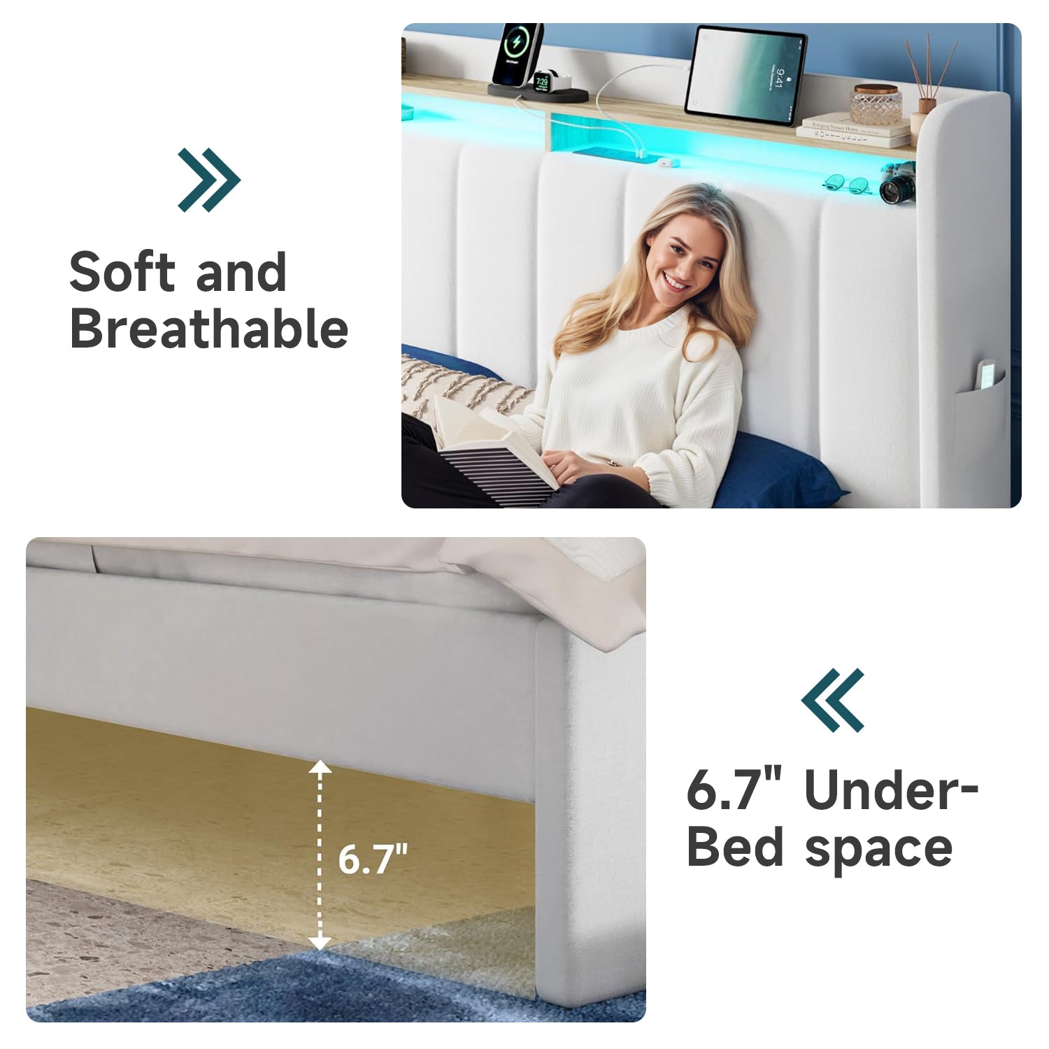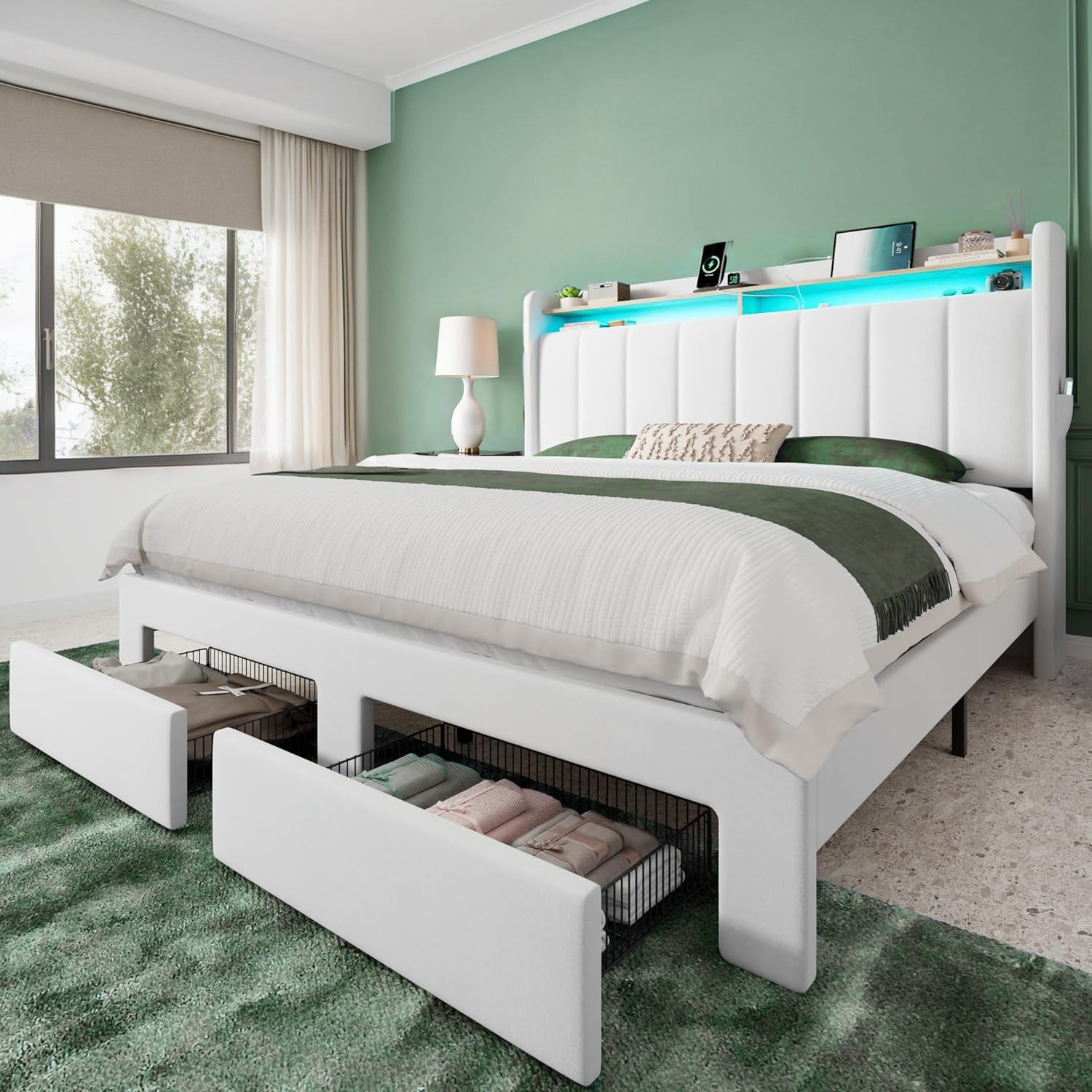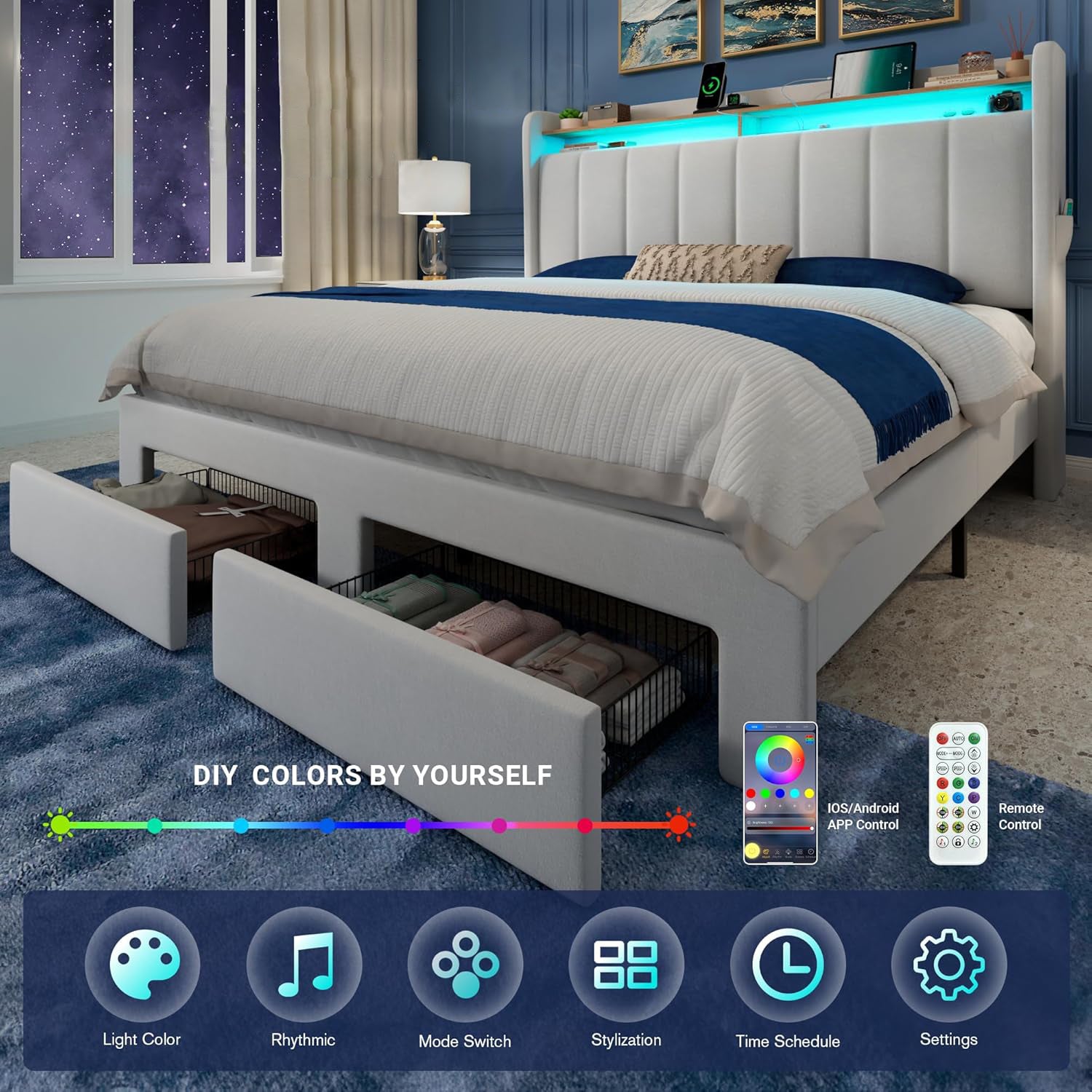 Velvet Upholstered Platform Bed Frame with LED Headboard, Storage Drawers & Charging Ports, No Box Spring Needed