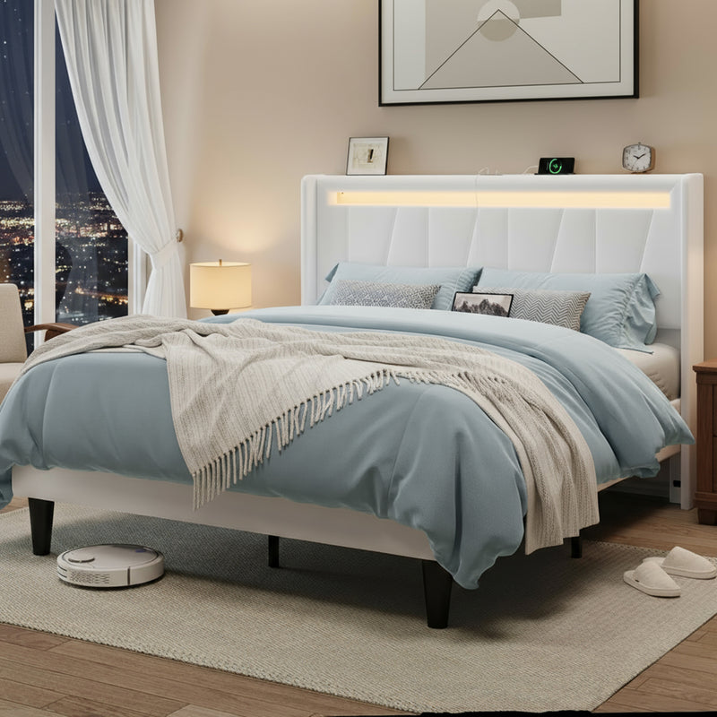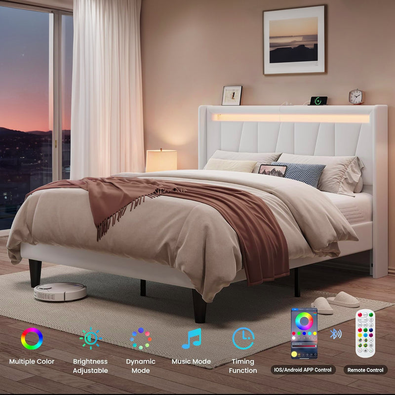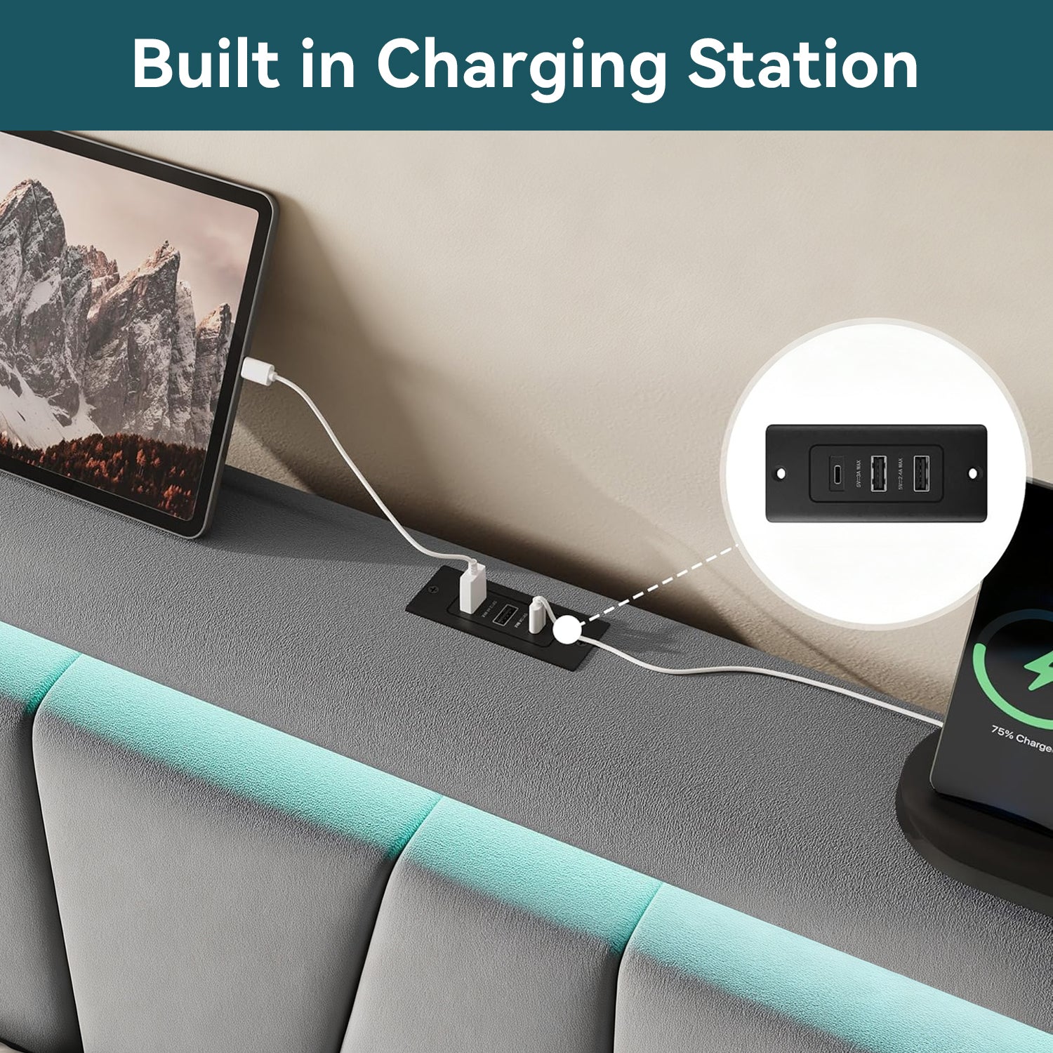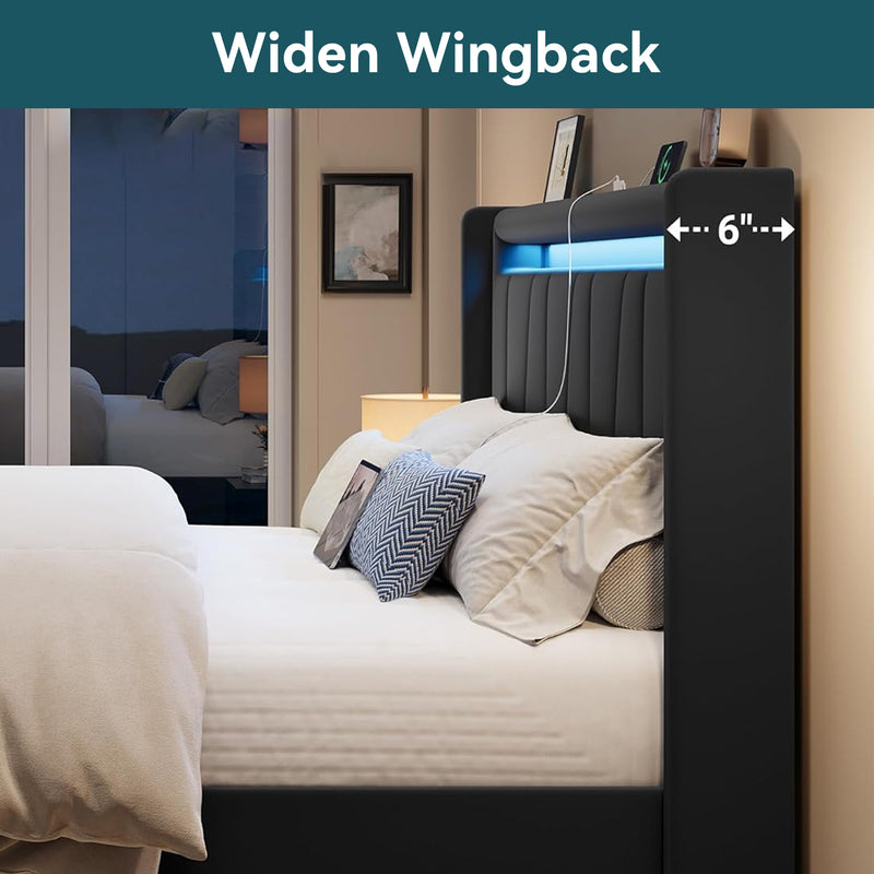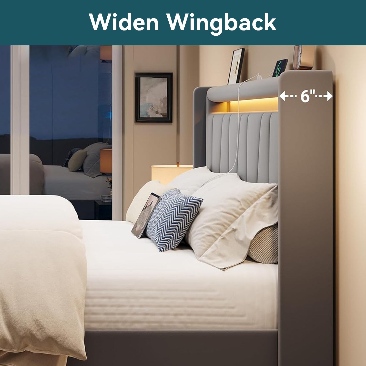 Velvet Upholstered Platform Bed Frame with Charging Station & Wingback LED Headboard,No Box Spring Needed