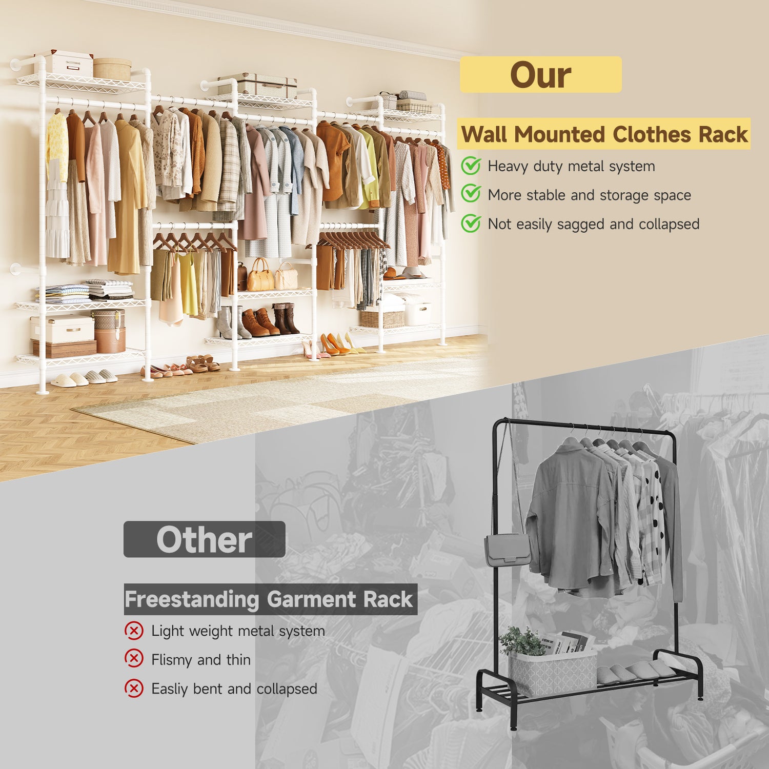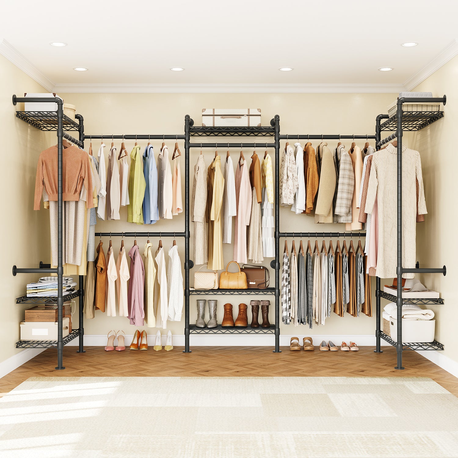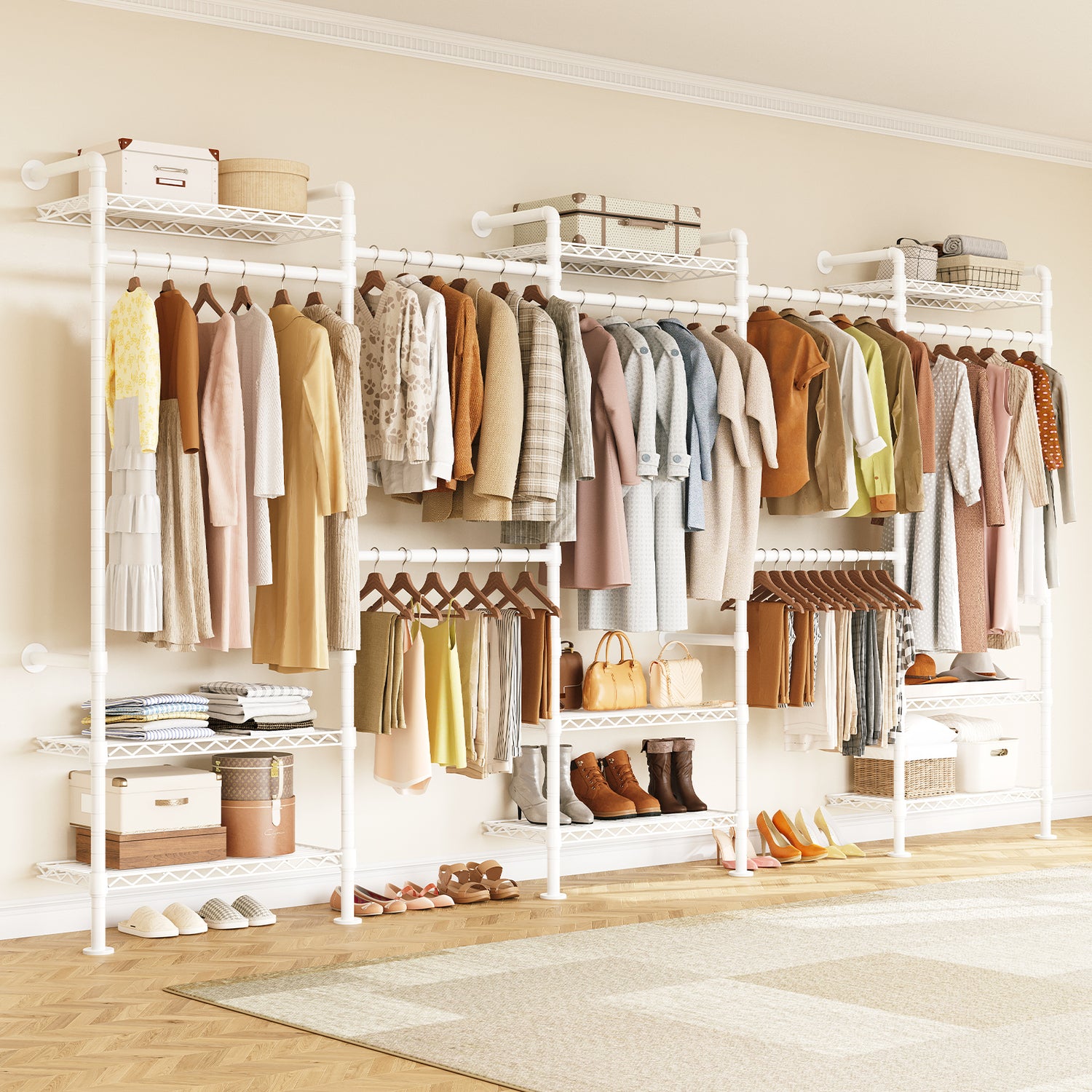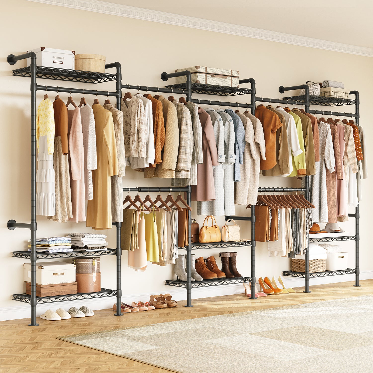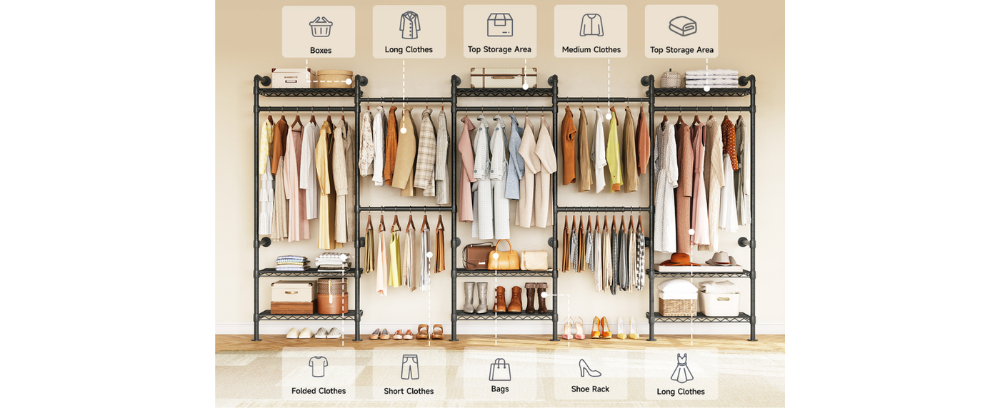 Unlike traditional closets with bulky panels, this system uses an open metal frame. It provides solid support while offering more hanging space, reducing the need to fold clothes. The open design also allows for clear visibility and easy access to your items.