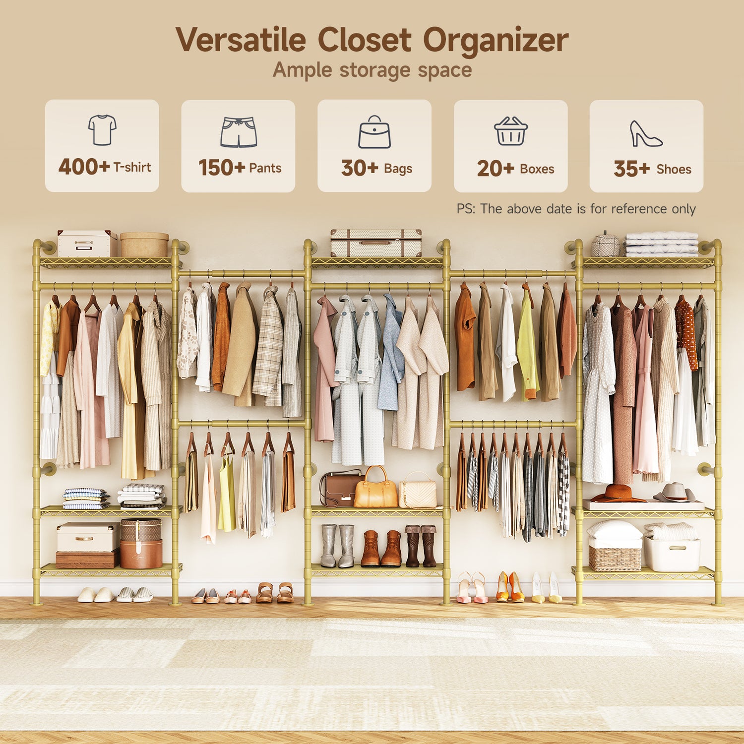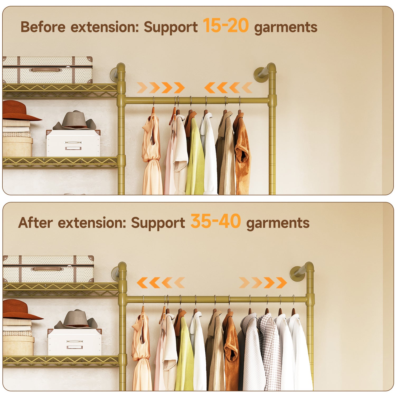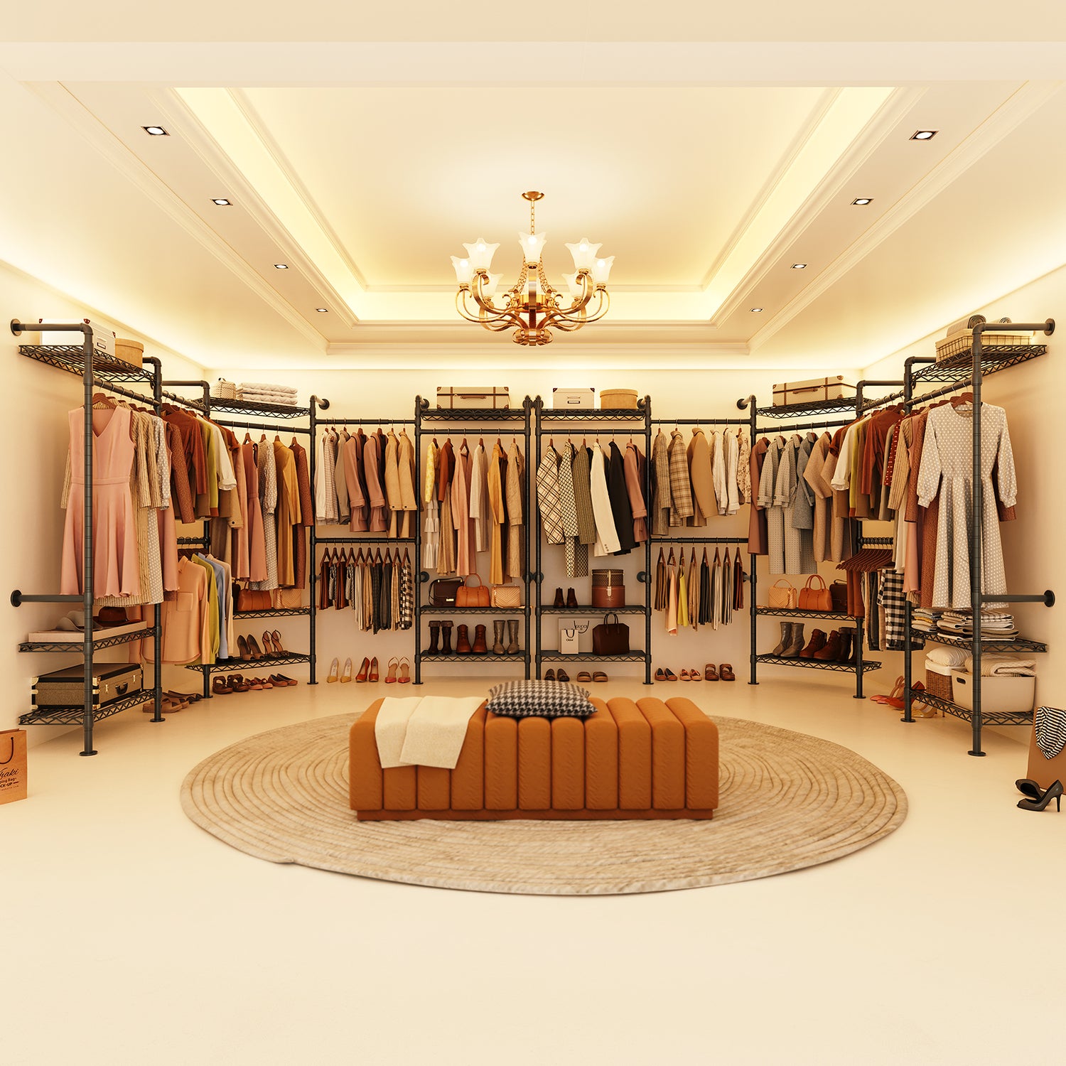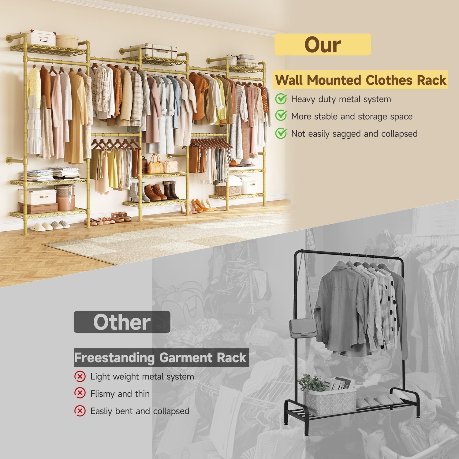 Unlike traditional closets with bulky panels, this system uses an open metal frame. It provides solid support while offering more hanging space, reducing the need to fold clothes. The open design also allows for clear visibility and easy access to your items.