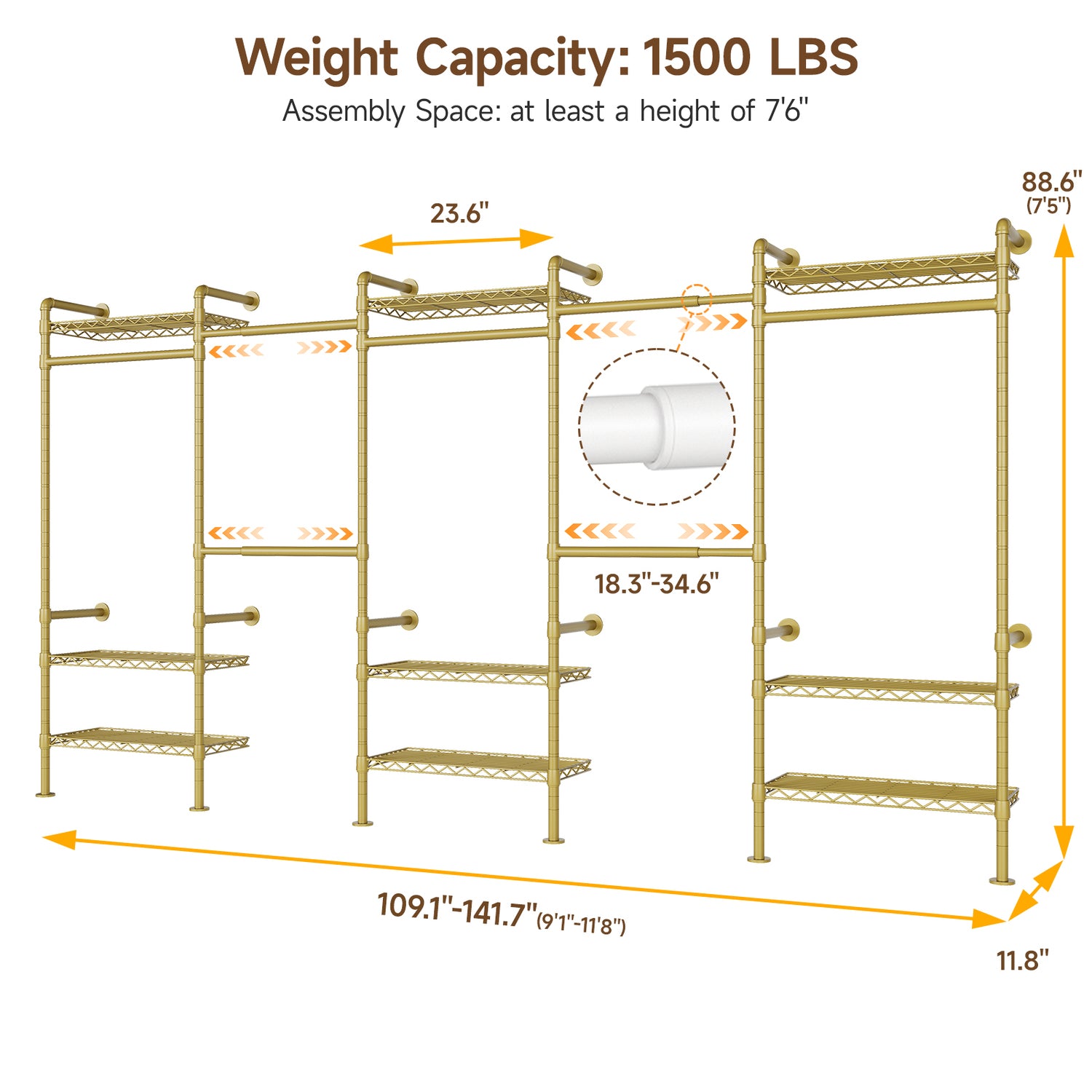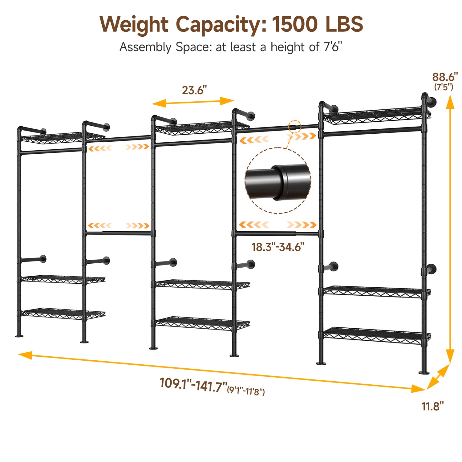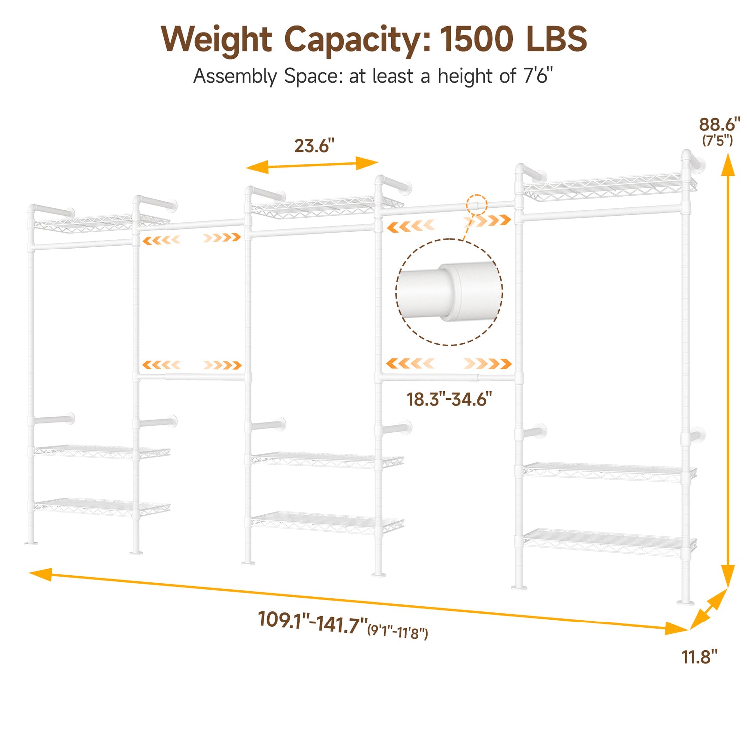 This clothing rack includes 4 adjustable hanging rods, 3 fixed rods, and 9 wire shelves. The adjustable rods extend from 18.3" to 34.6", suitable for hanging coats, shirts, dresses, and pants. The wire shelves can be used for folded clothes, shoes, bags, or other items that do not require hanging.
