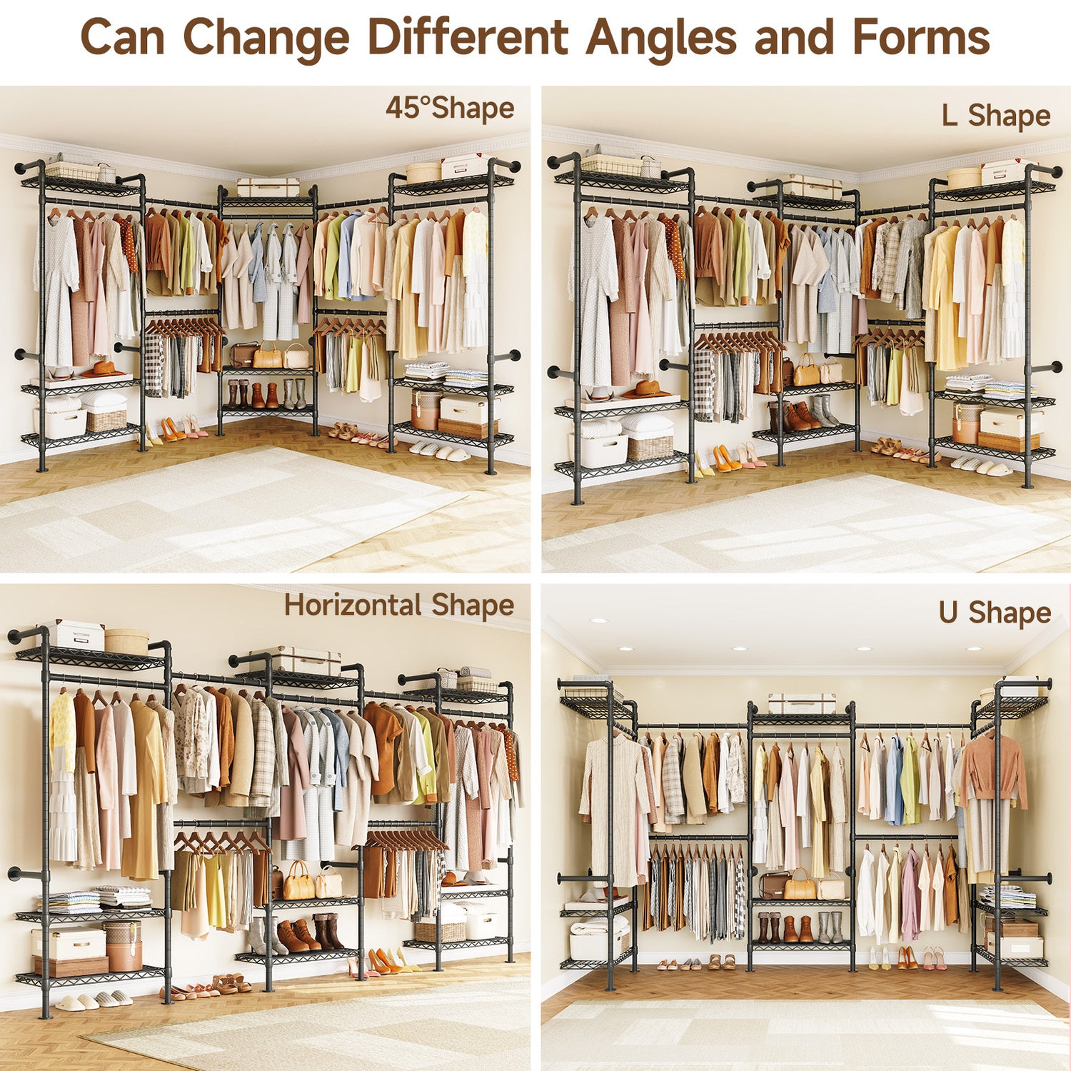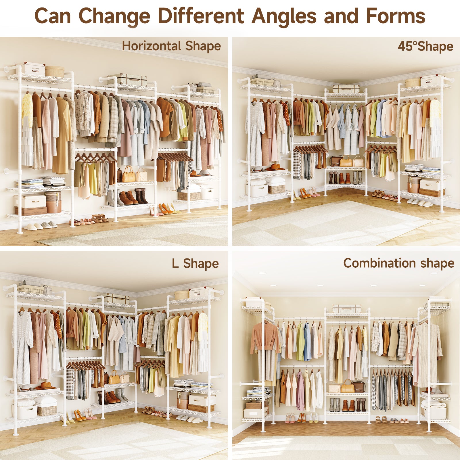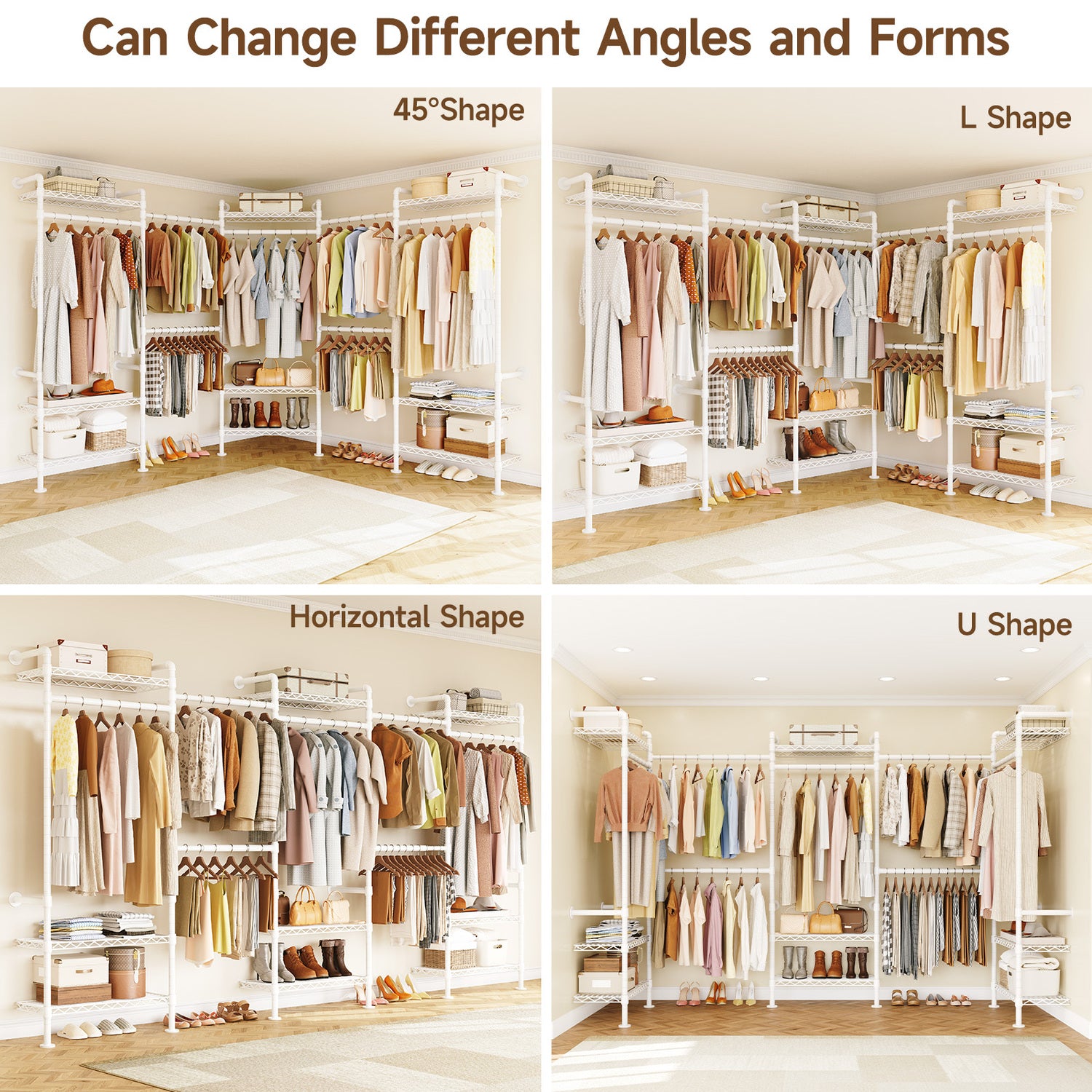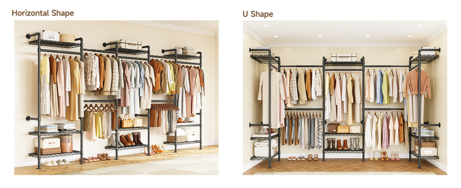 This closet system can be installed in a straight line, an L shape, or a U shape. Please select a suitable layout based on your space before installation.