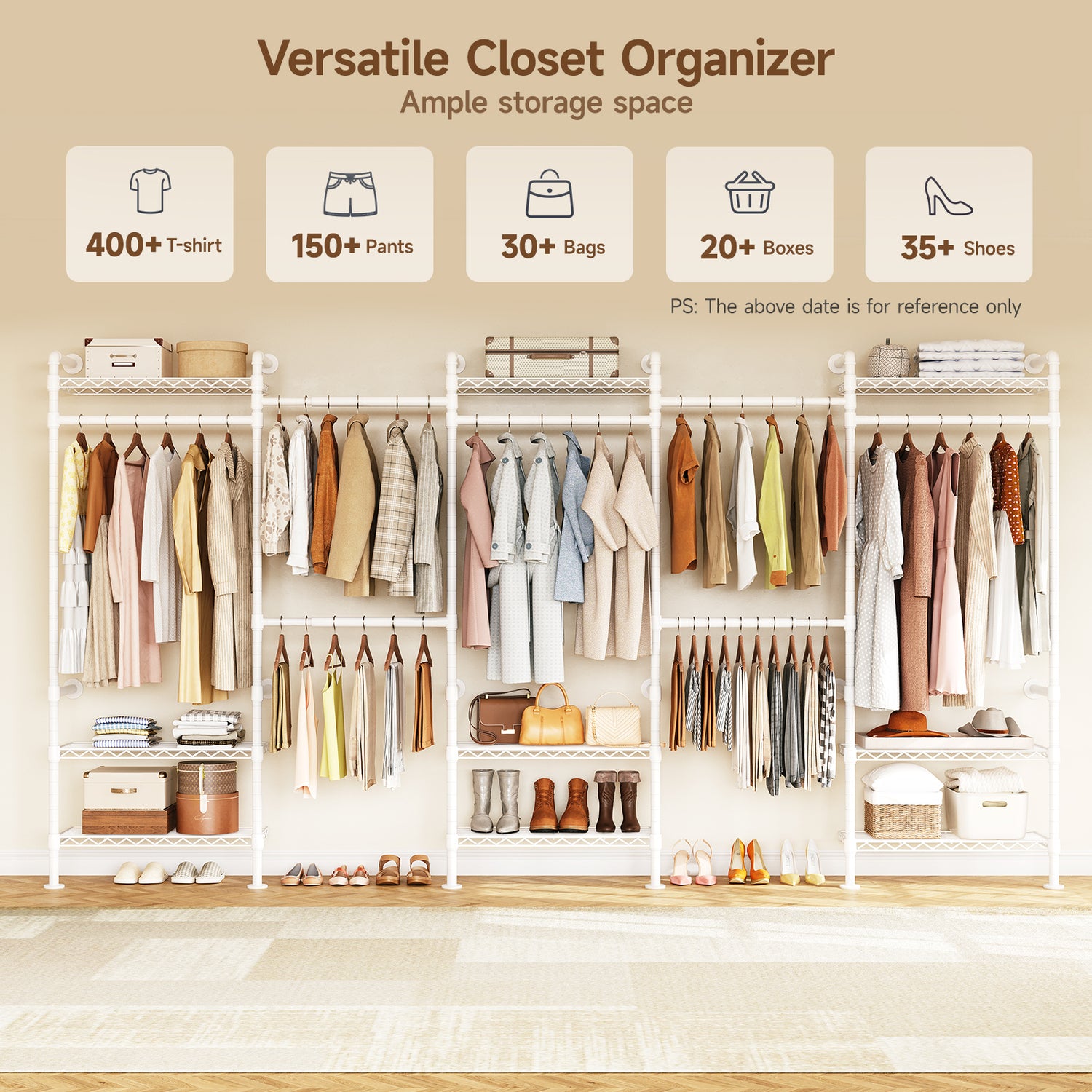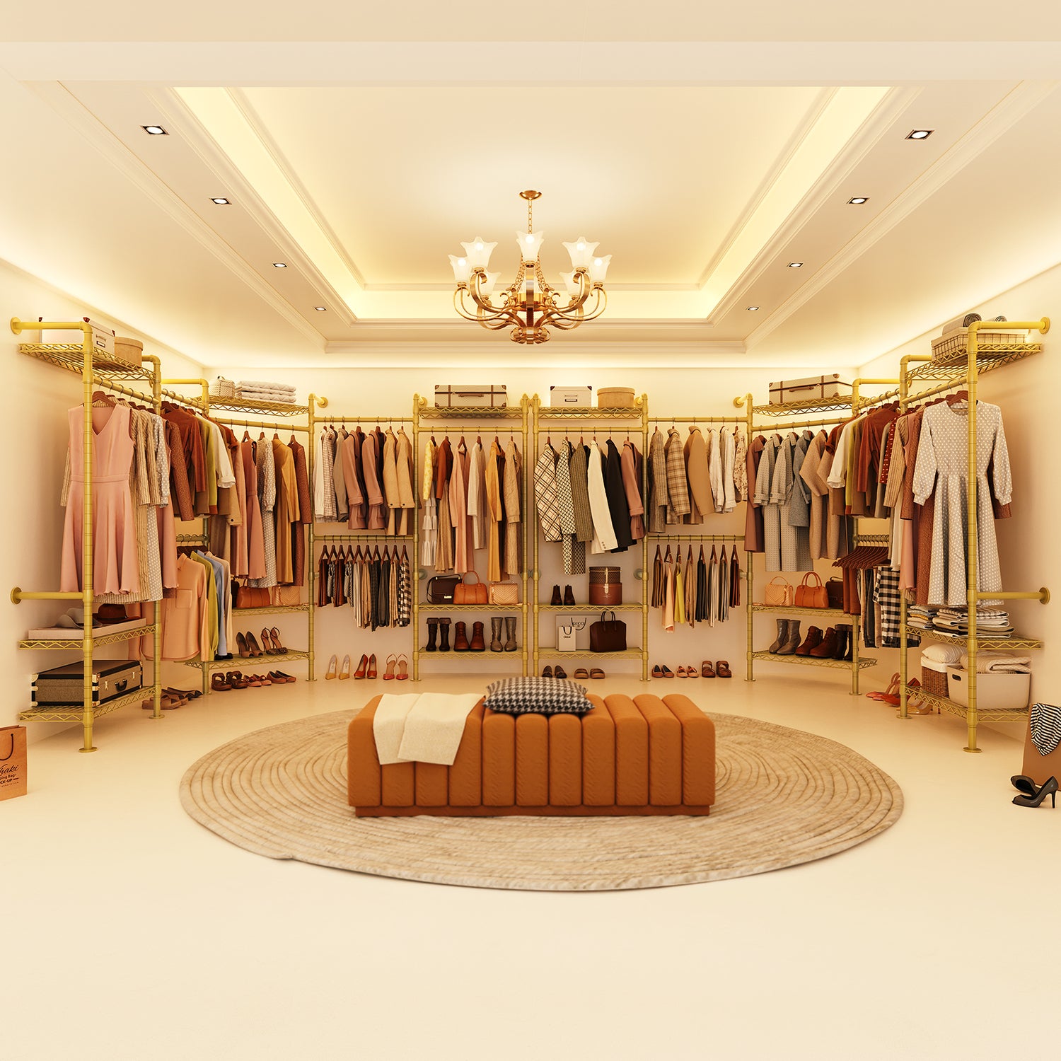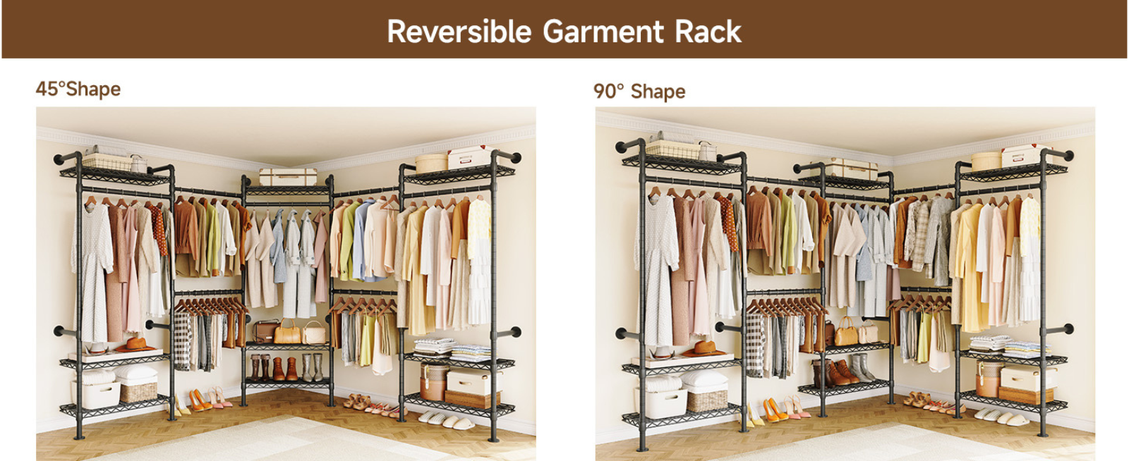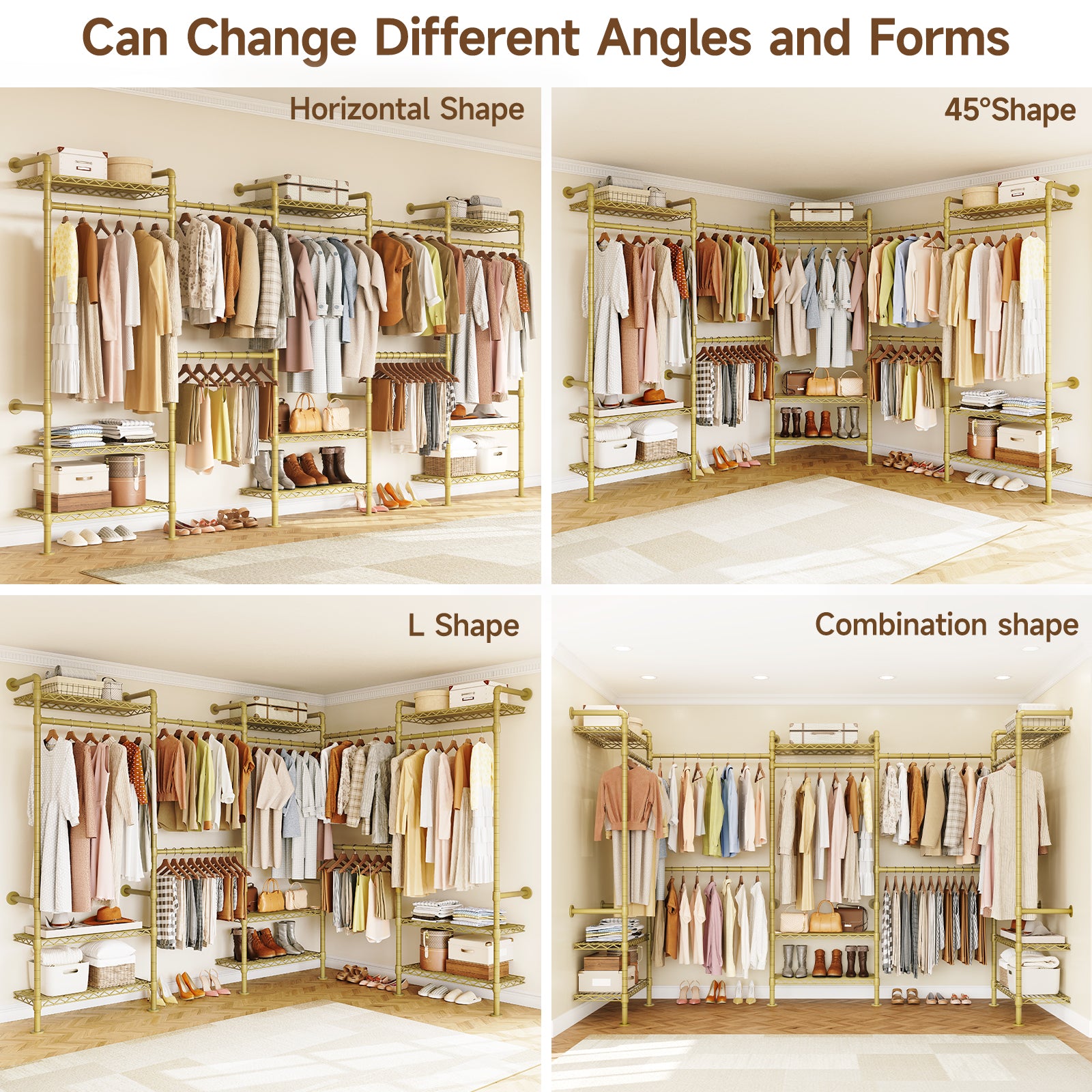 This closet system can be installed in a straight line, an L shape, or a U shape. Please select a suitable layout based on your space before installation.