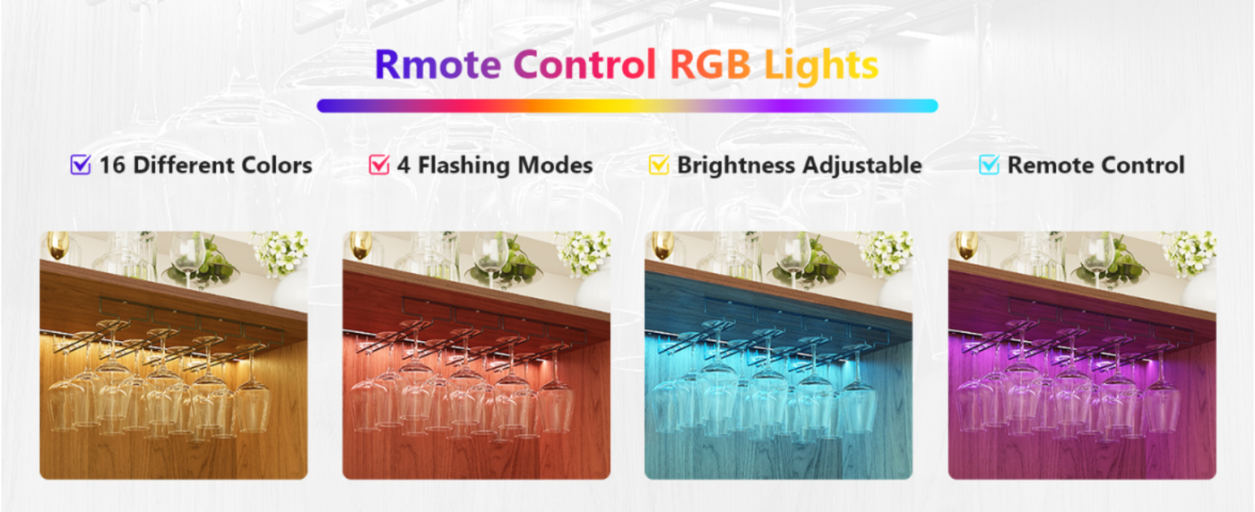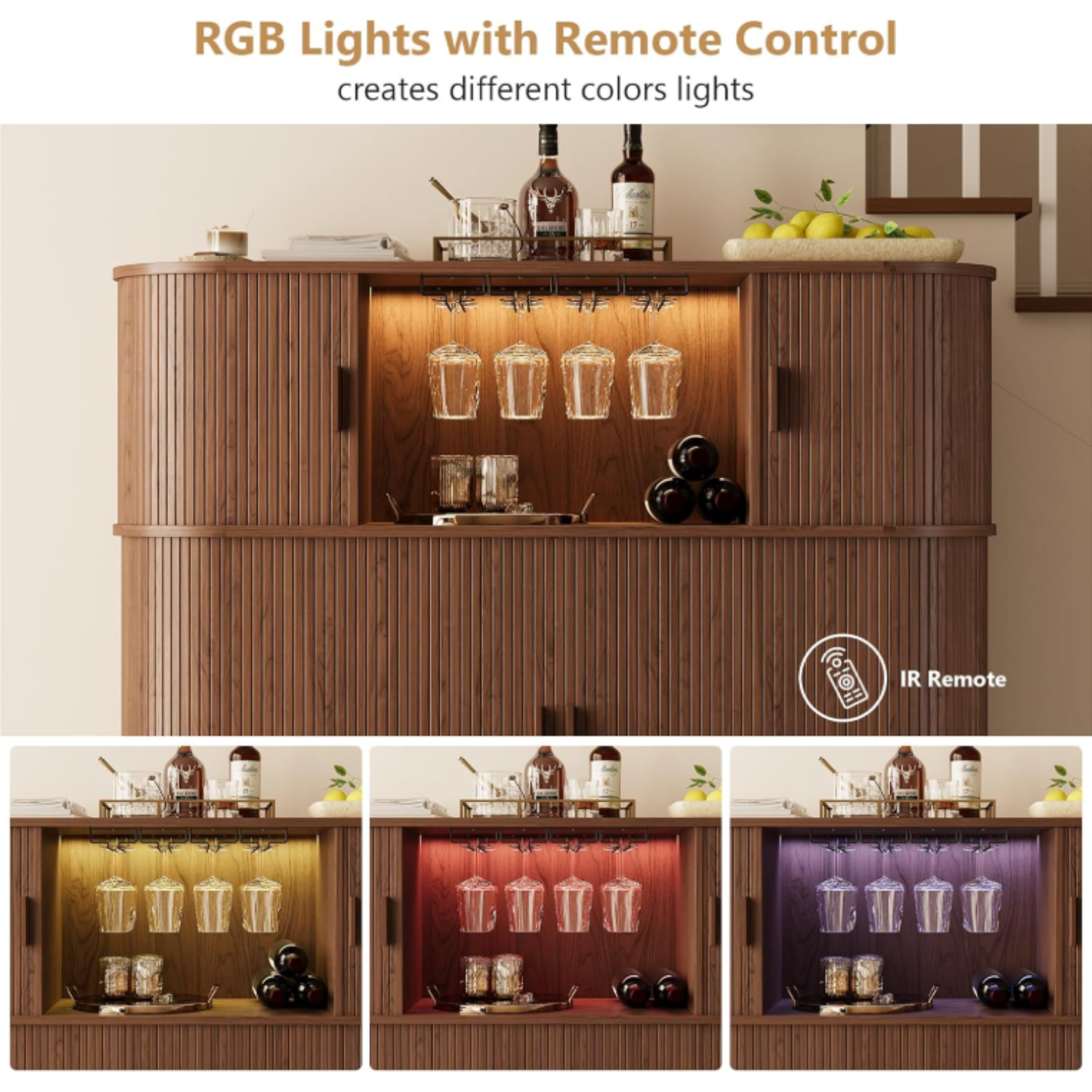 One of the handy features is the built-in power station. This coffee bar has two outlets and two USB ports, so you can plug in appliances or charge devices. There’s also RGB LED lighting you can control with a remote, letting you change the color or brightness depending on your mood or the room’s lighting.