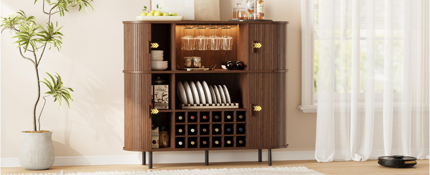 This cabinet provides both storage and serves multiple purposes. The top is wide enough to hold a coffee maker, microwave, or other small appliances. Inside, it features multiple shelves that allow you to organize bottles or kitchen items. If you don't need the wine rack, you can remove it to create a large compartment.