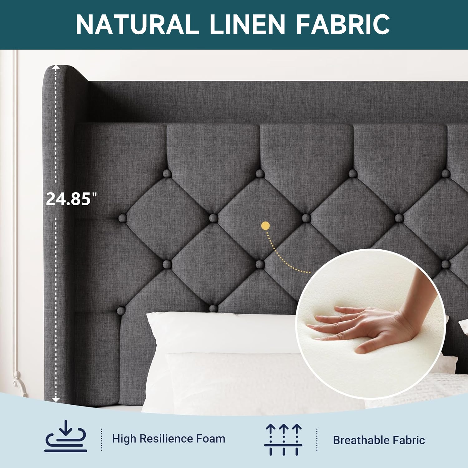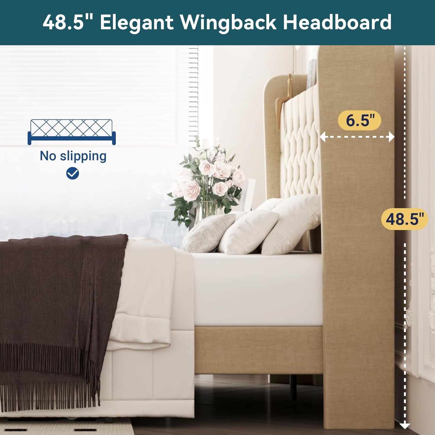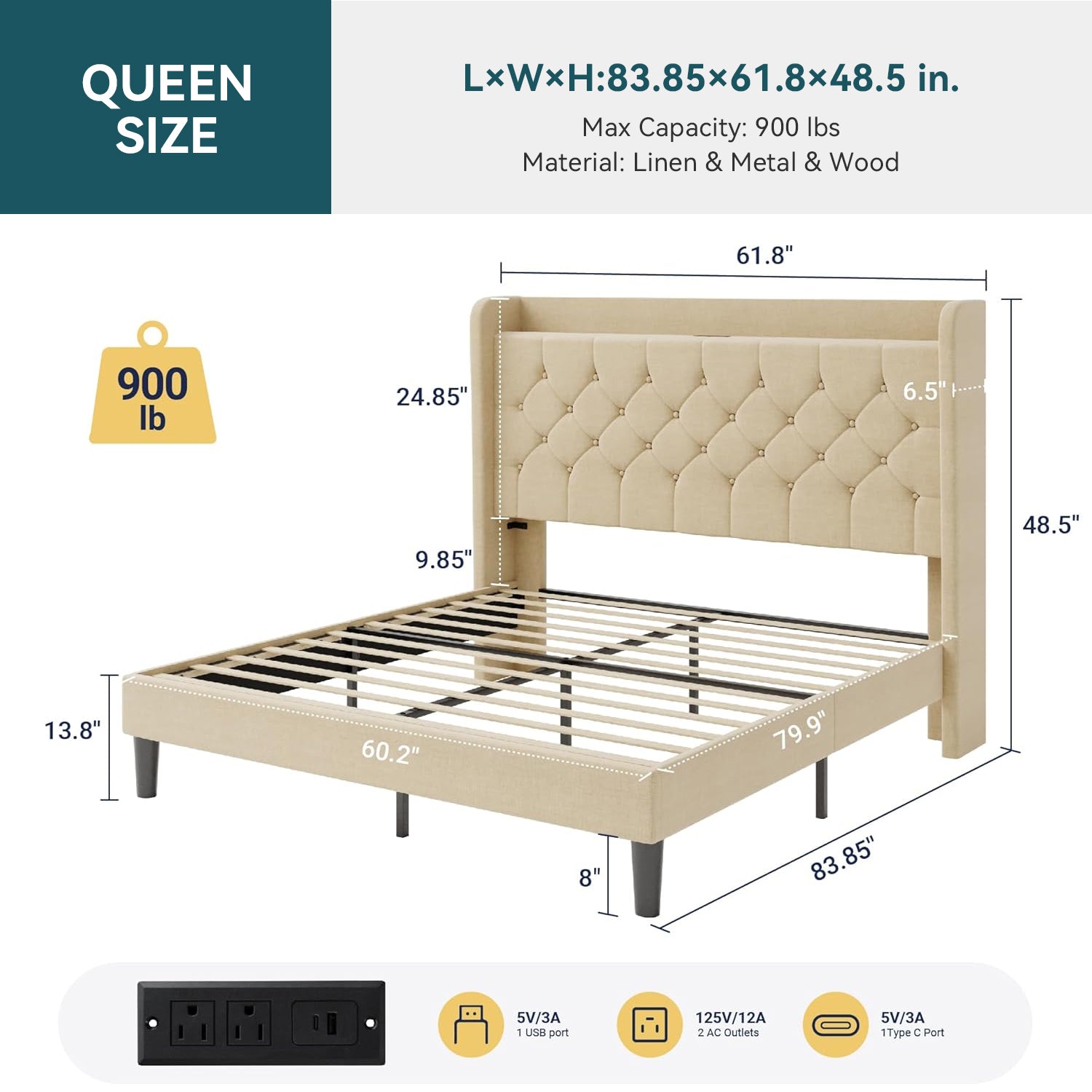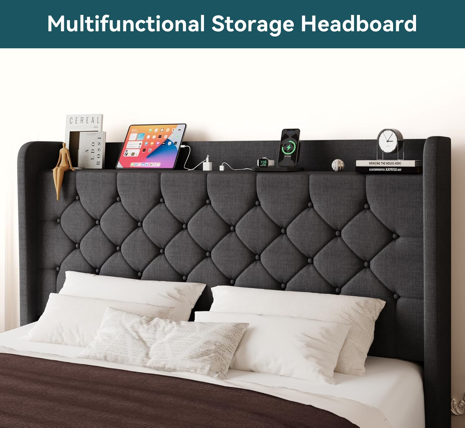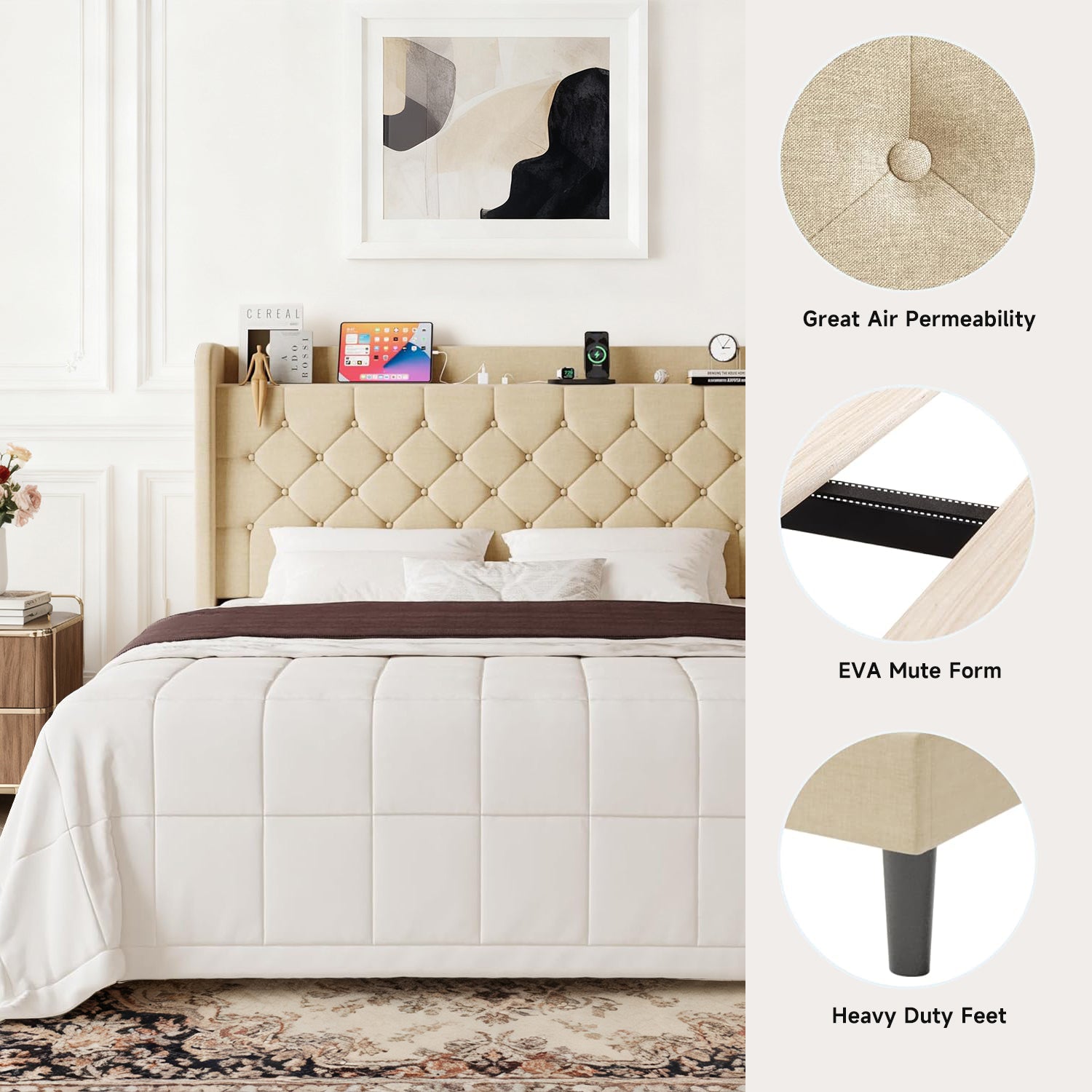 Wingback Linen Upholstered Bed Frame with Storage Headboard & Charging Station, Button Tufted Design, No Box Spring Needed