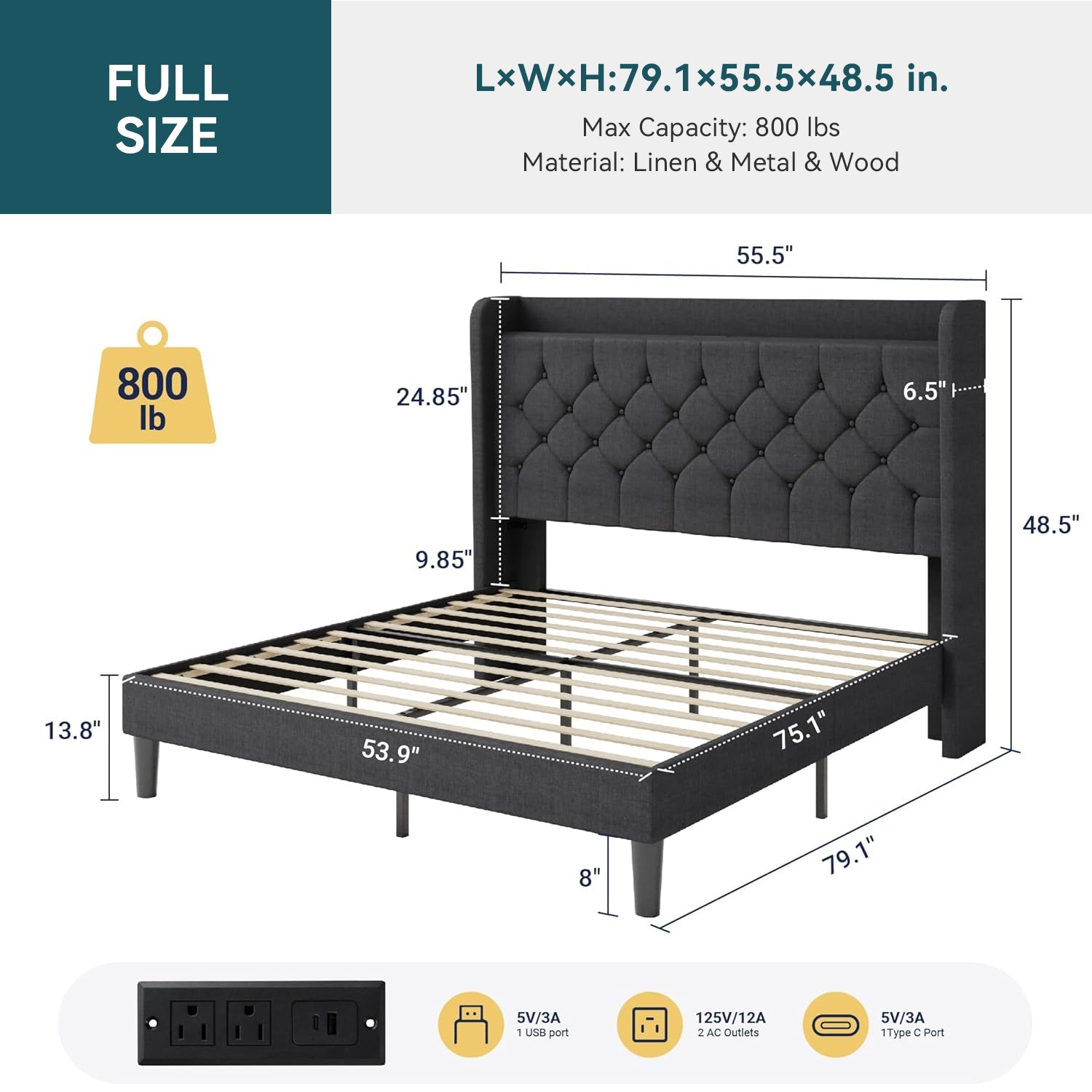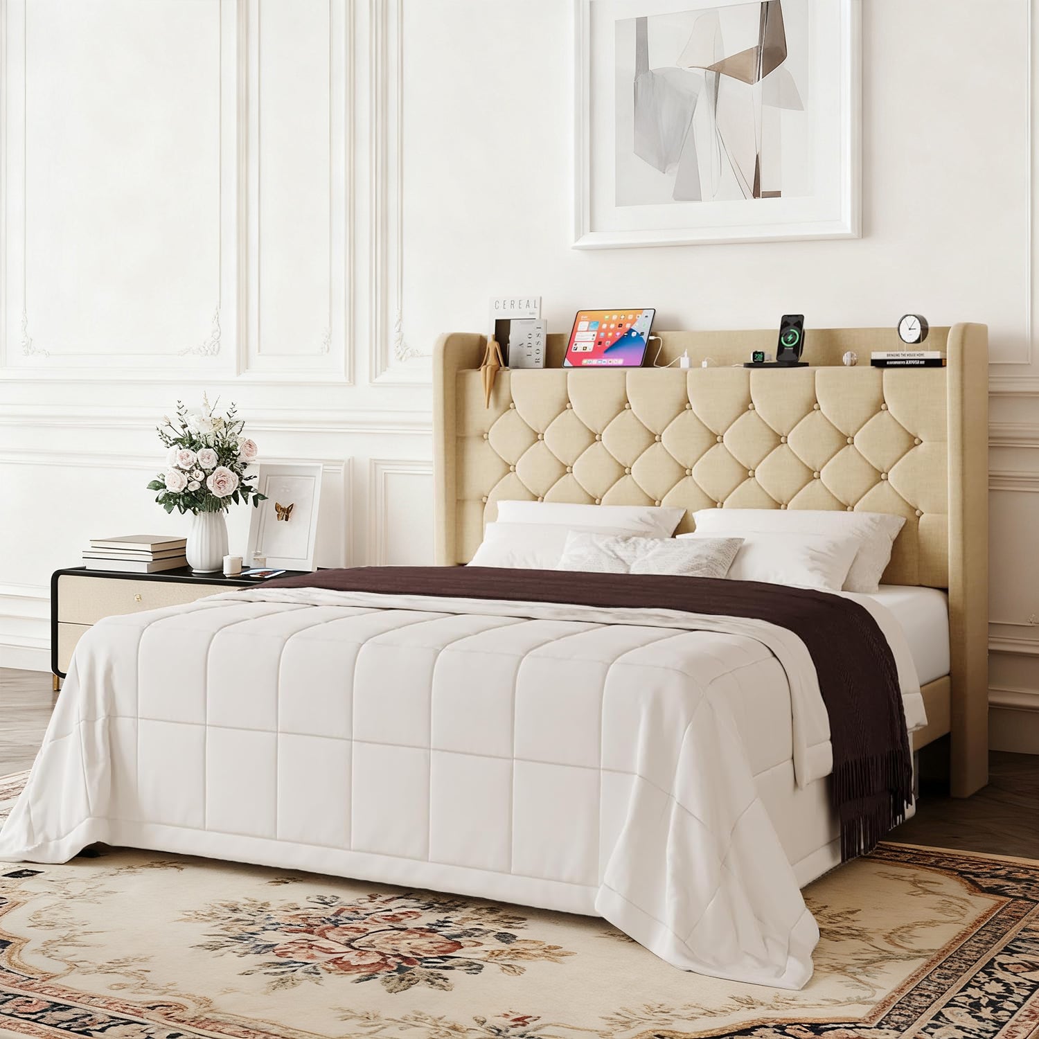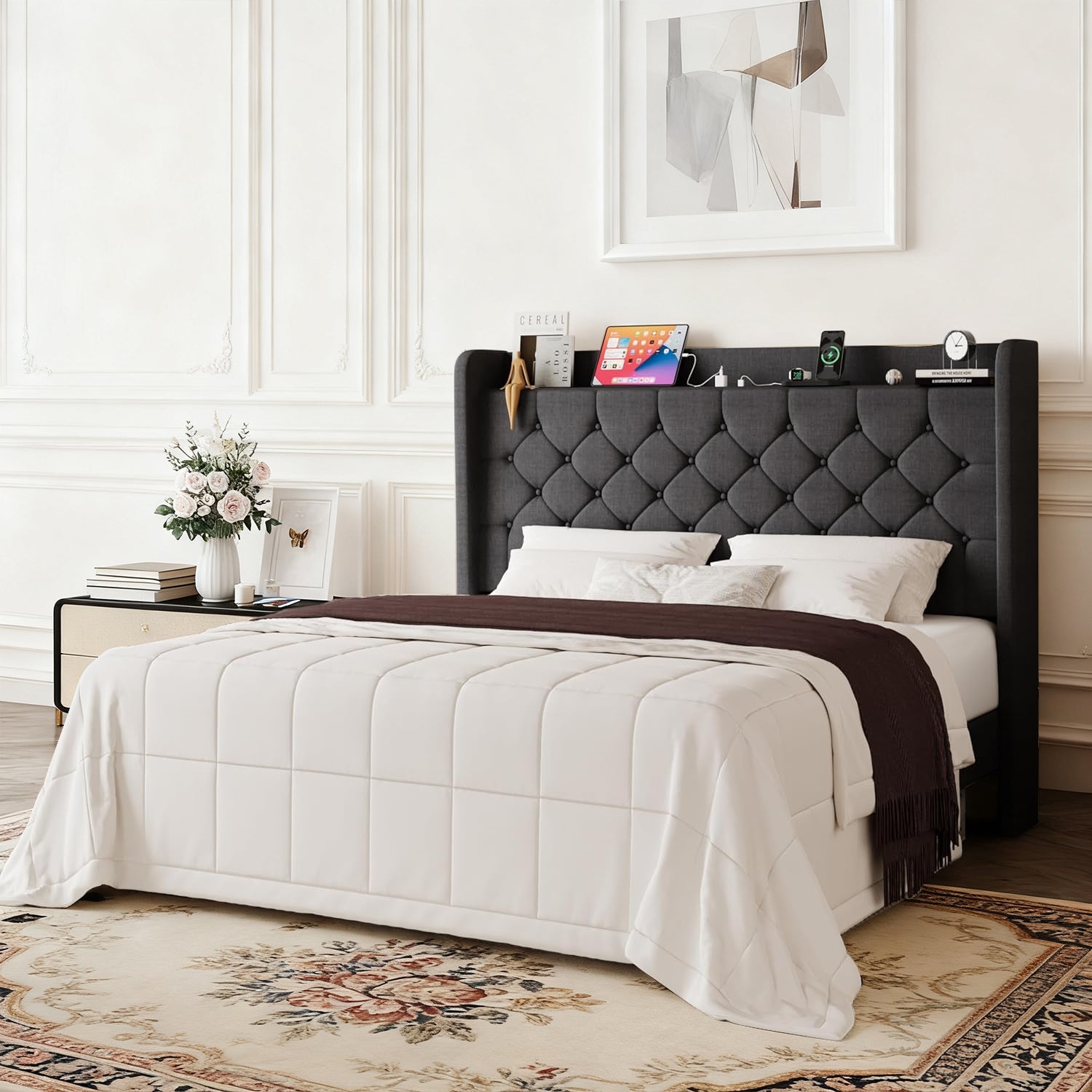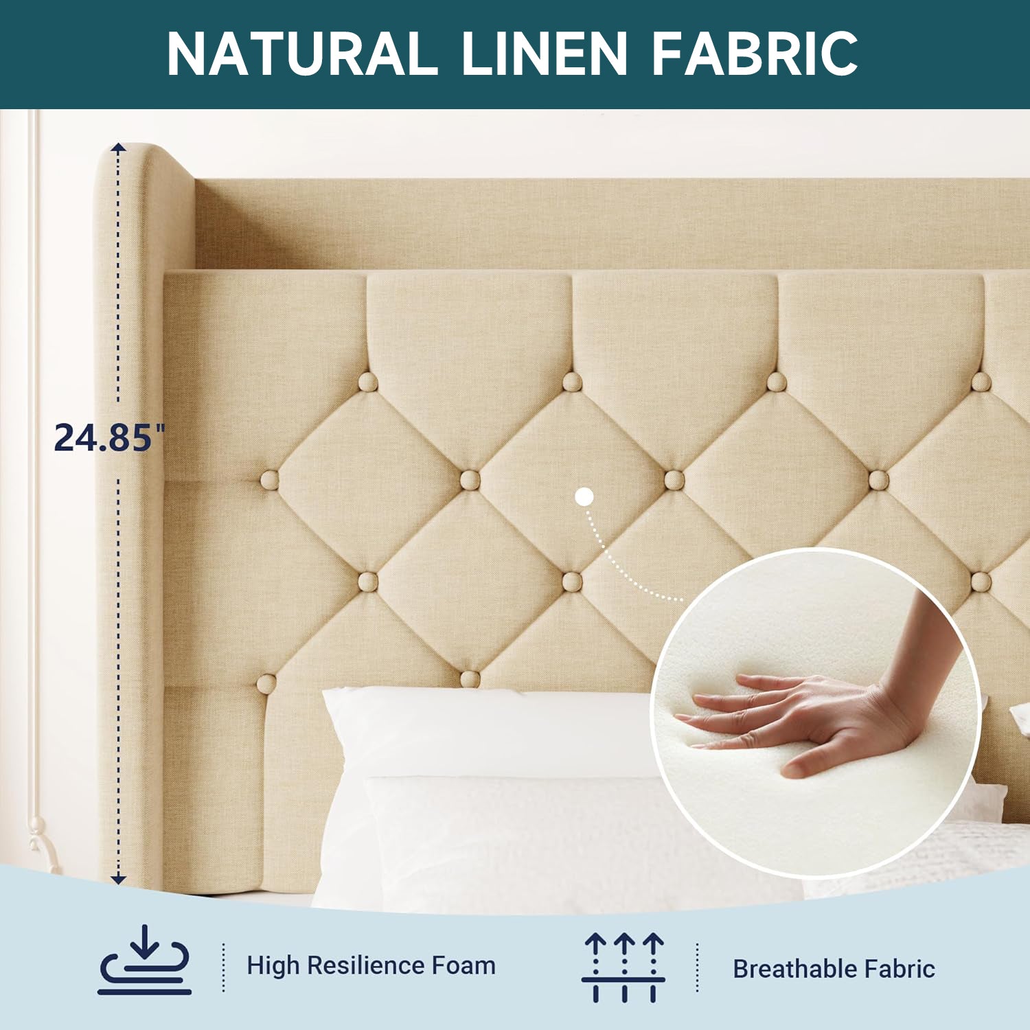 Wingback Linen Upholstered Bed Frame with Storage Headboard & Charging Station, Button Tufted Design, No Box Spring Needed