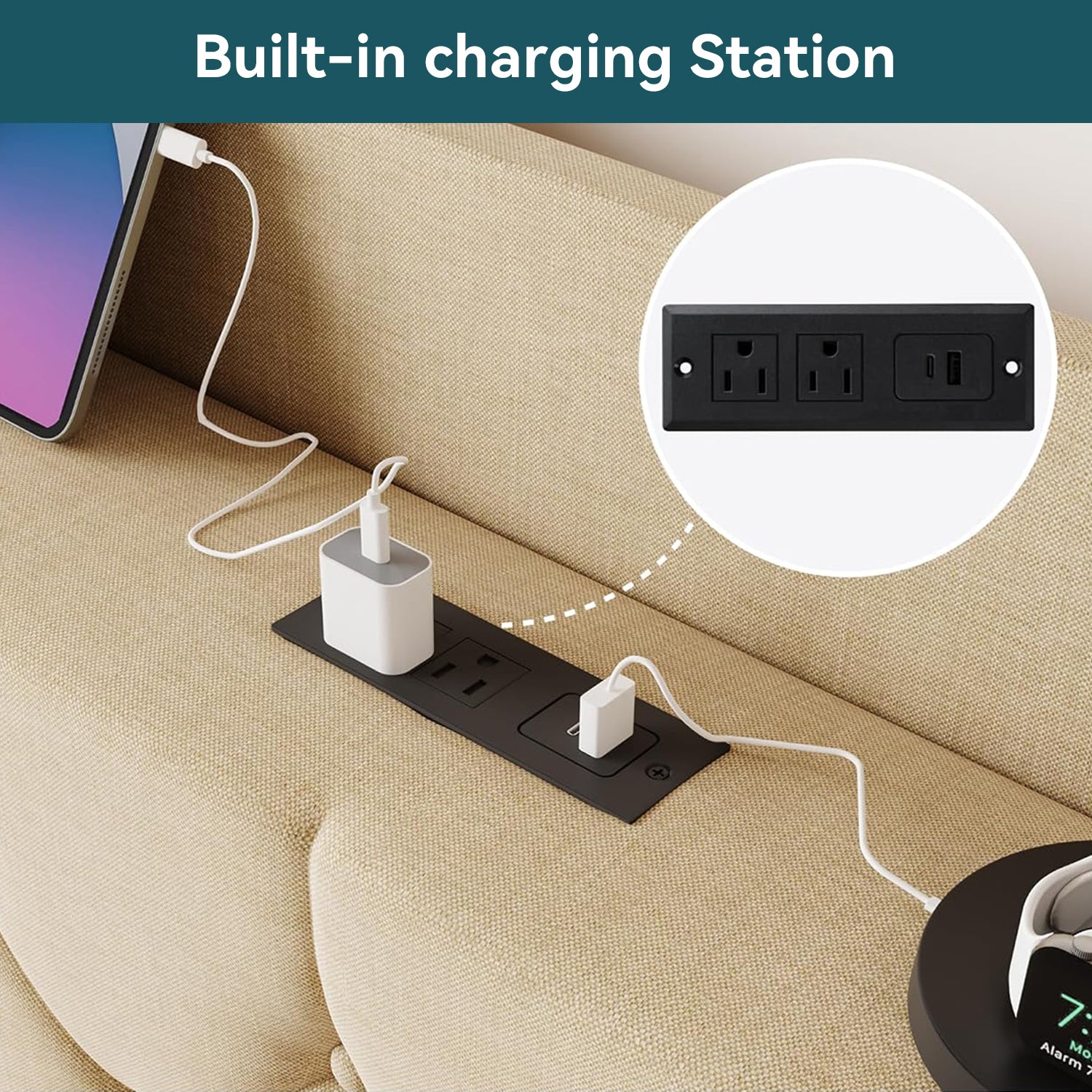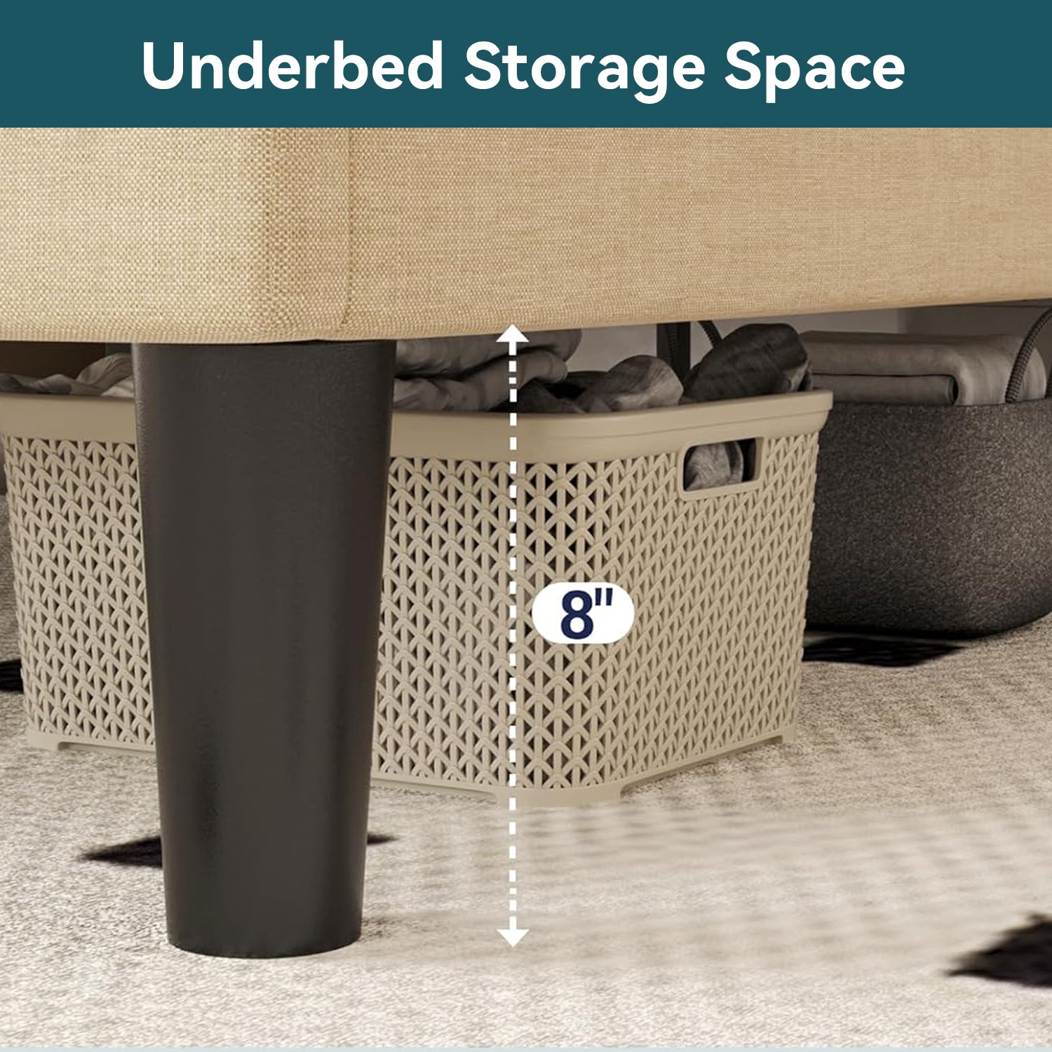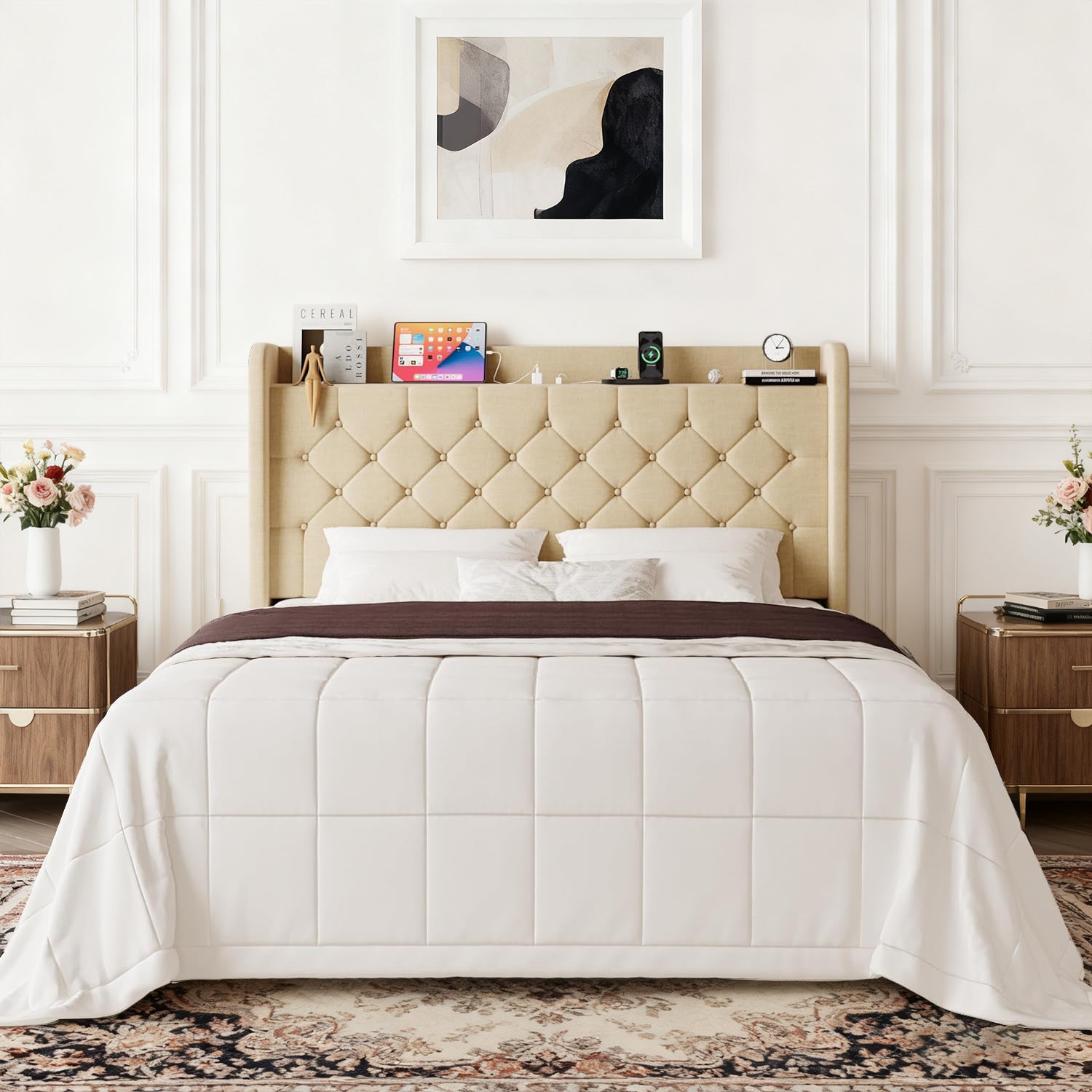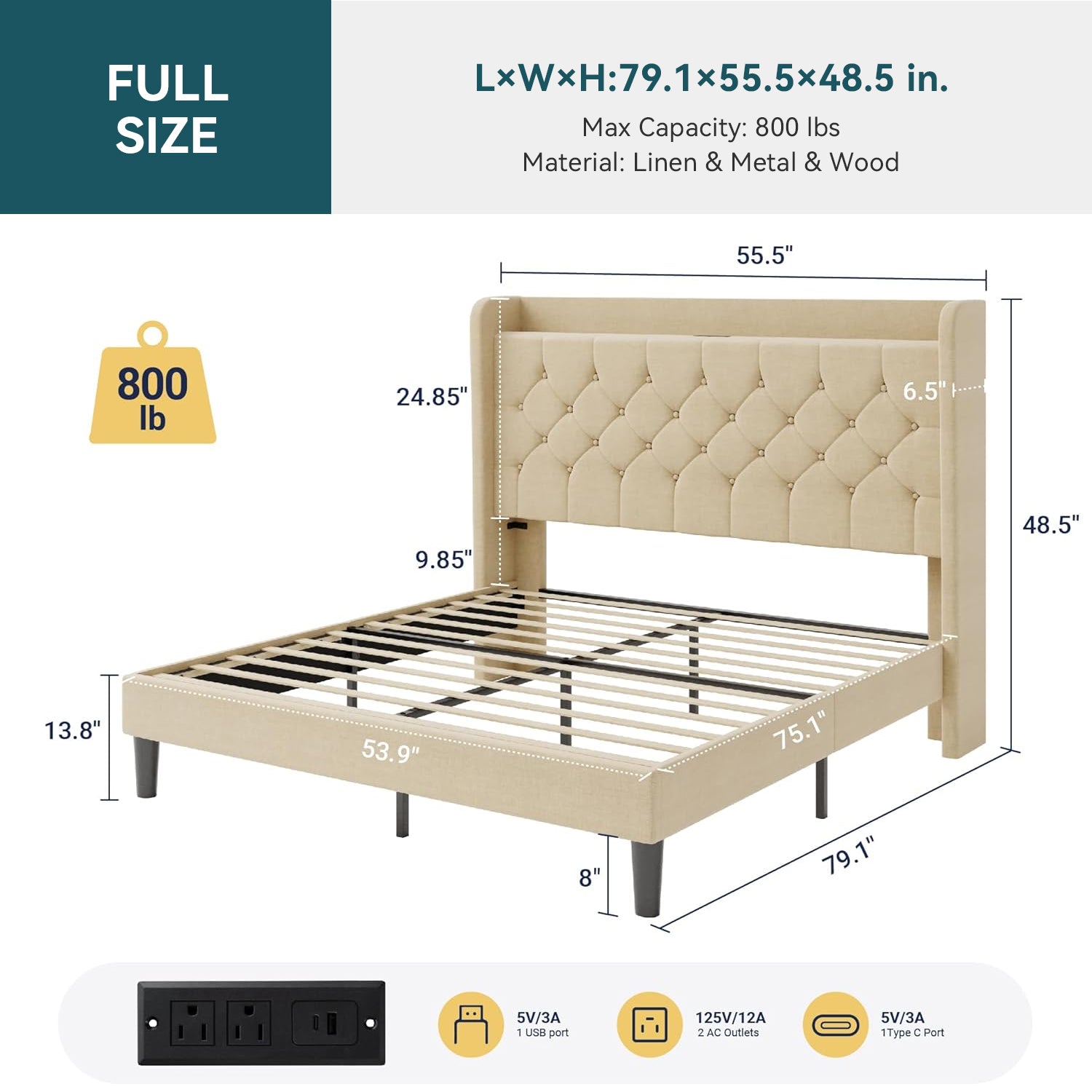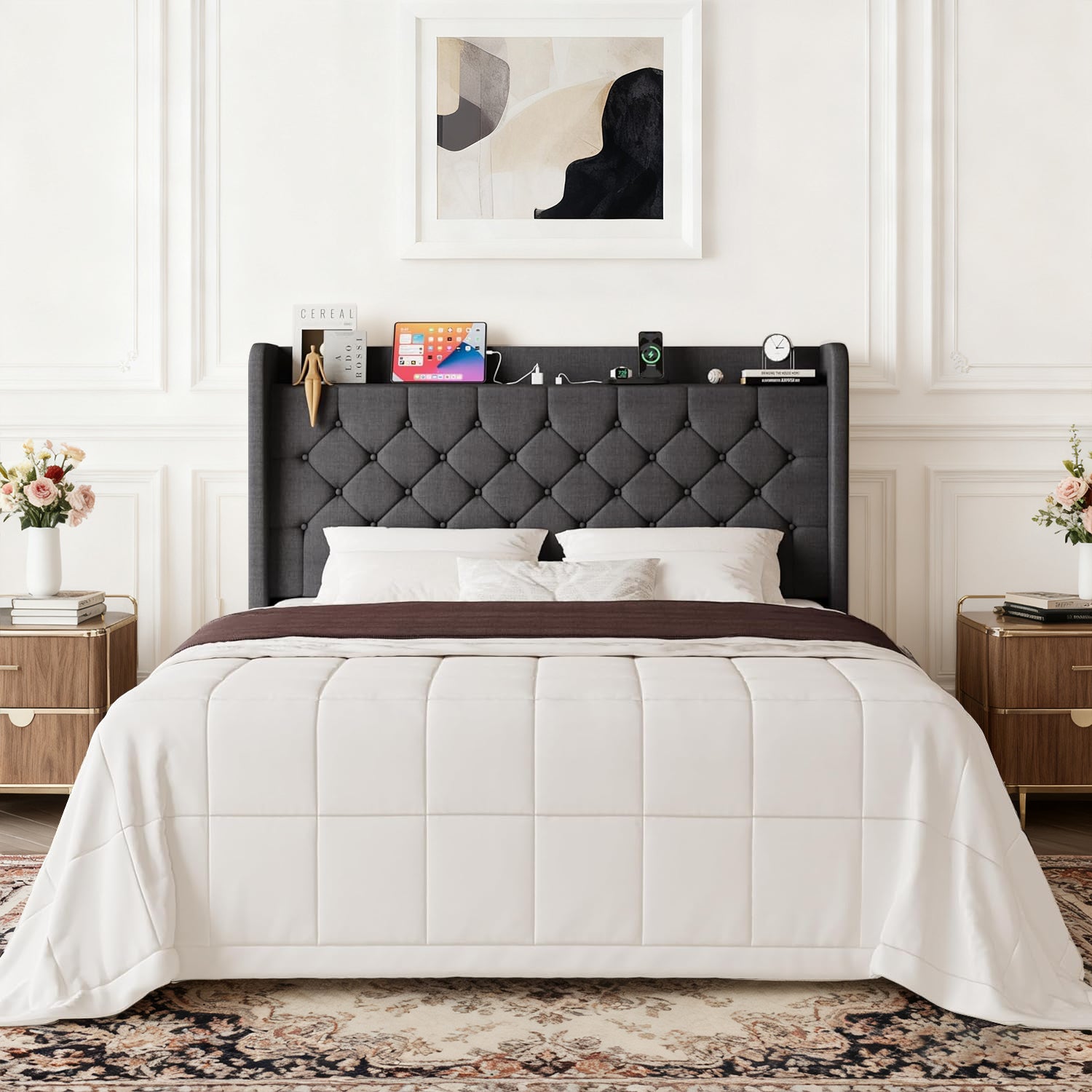 Wingback Linen Upholstered Bed Frame with Storage Headboard & Charging Station, Button Tufted Design, No Box Spring Needed