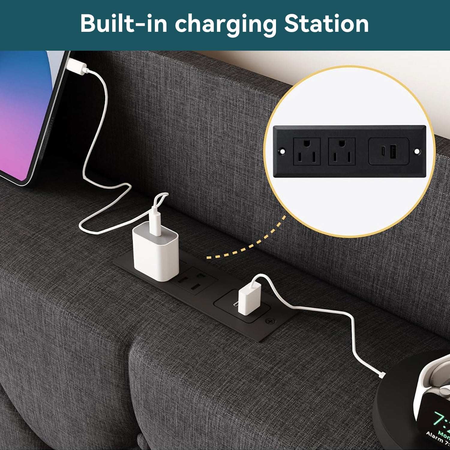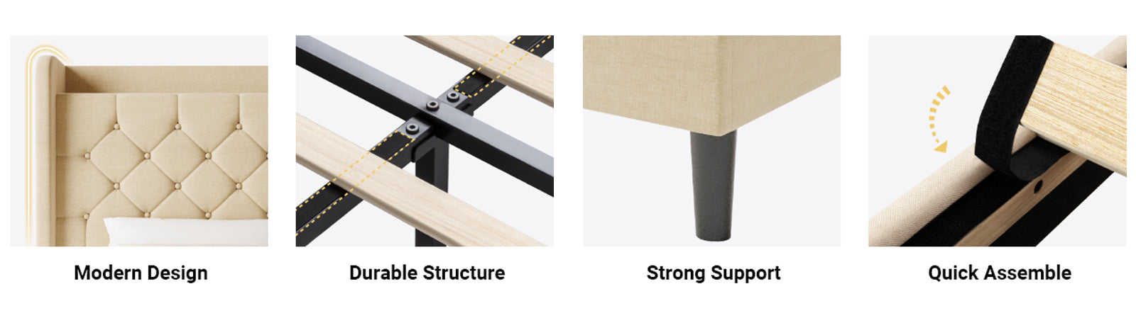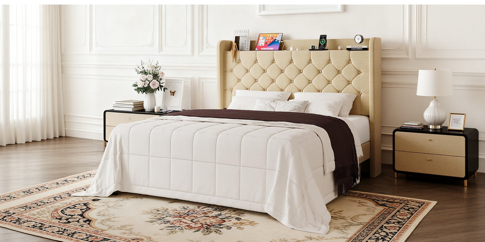 This extra-tall 48.5" velvet wingback headboard is designed for both comfort and convenience. It features a built-in storage shelf that keeps your phone, glasses, books, and nighttime essentials right within reach, while the softly padded wings add cozy support and help keep your mattress securely in place. It comes with an upgraded charging station, making bedtime routines easier than ever. With 2 standard outlets, 1 USB port, and 1 Type-C port, you can charge your phone, tablet, lamp, or smartwatch without getting out of bed—perfect for modern, connected living. The 8" under-bed storage space gives you extra room to tuck away storage boxes, seasonal items, or spare bedding. The open design allows robot vacuums and standard cleaners to glide through effortlessly, helping you maintain a clean, clutter-free bedroom. That noise-free construction is made for uninterrupted rest. EVA mute bars and a well-built metal frame work together to eliminate squeaks and movement, while the upholstered wingback headboard blends seamlessly with a wide range of bedroom styles. You’ll appreciate the durable yet easy assembly design from the very start. A reinforced metal frame with center support legs holds up to 800–1000 lbs, and clearly labeled parts with step-by-step instructions allow for a smooth setup in about 30 minutes—no stress, no guesswork.