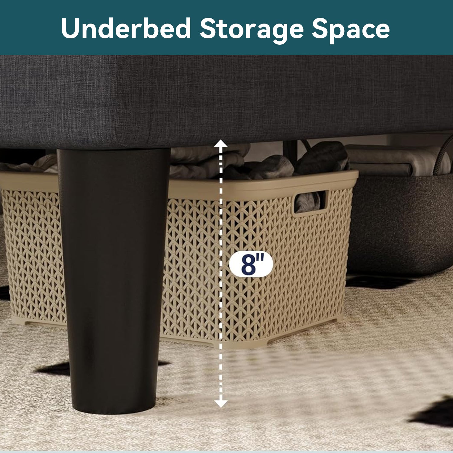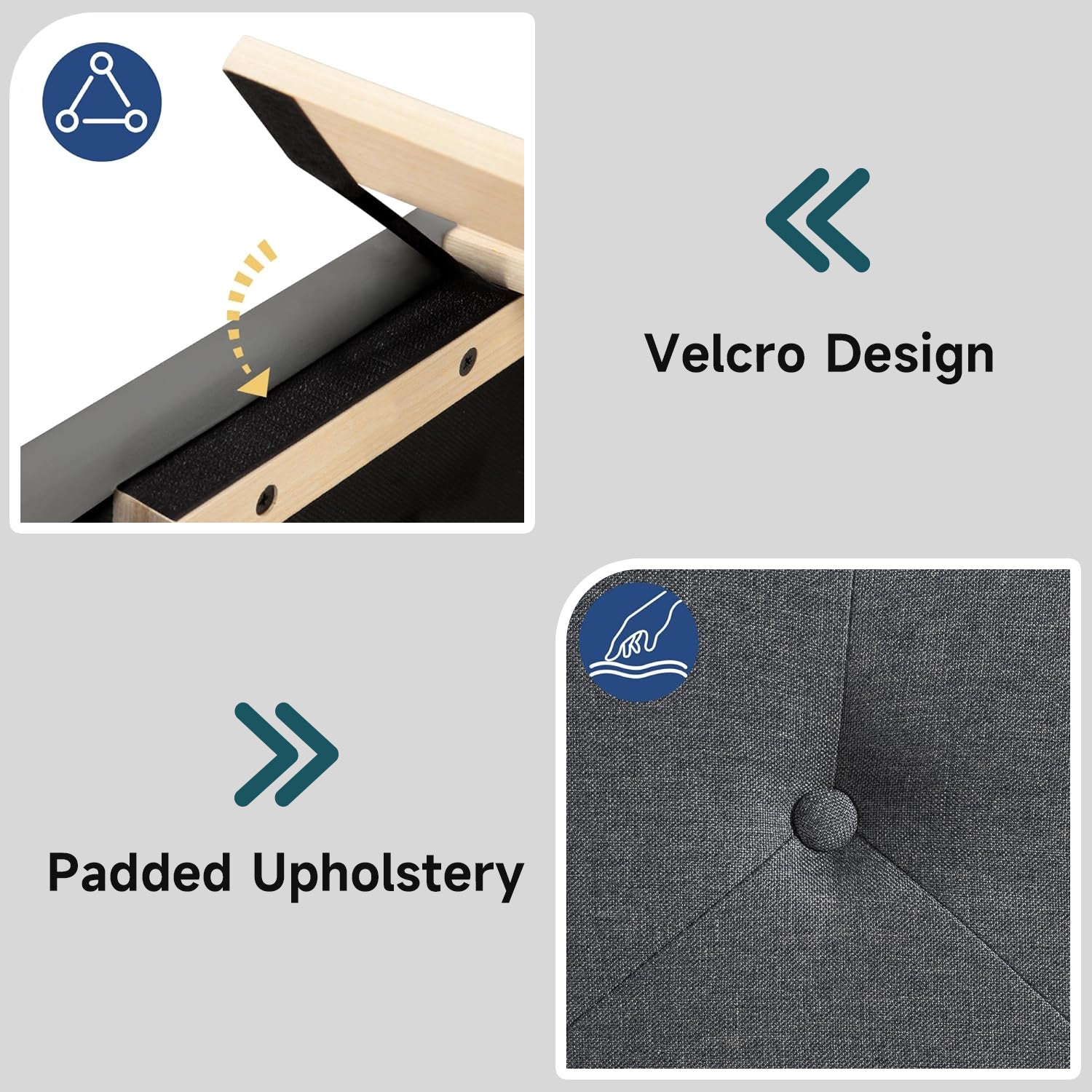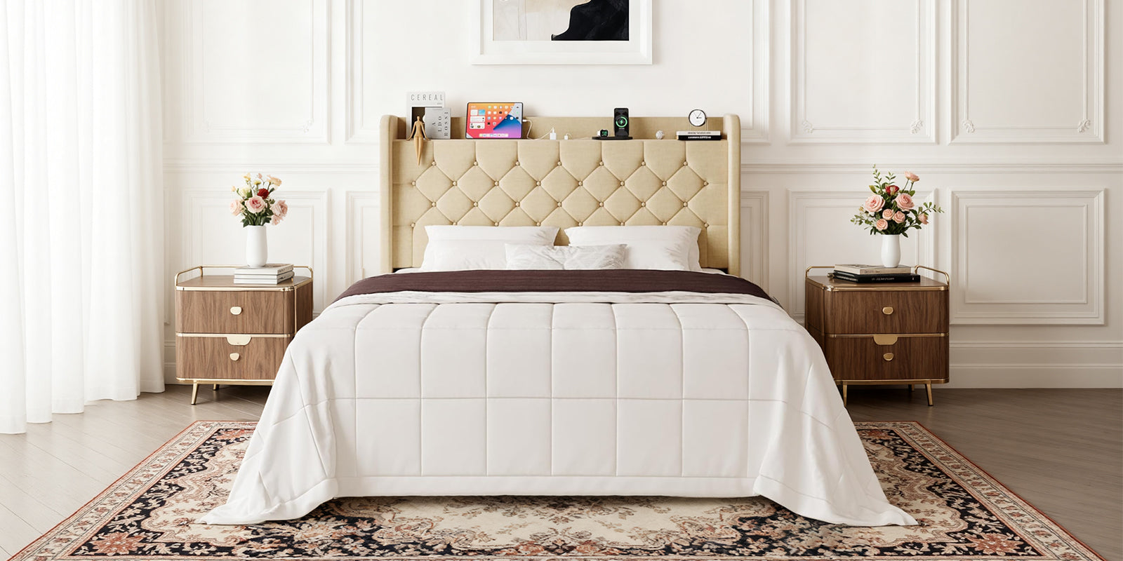This extra-tall 48.5" velvet wingback headboard is designed for both comfort and convenience. It features a built-in storage shelf that keeps your phone, glasses, books, and nighttime essentials right within reach, while the softly padded wings add cozy support and help keep your mattress securely in place. It comes with an upgraded charging station, making bedtime routines easier than ever. With 2 standard outlets, 1 USB port, and 1 Type-C port, you can charge your phone, tablet, lamp, or smartwatch without getting out of bed—perfect for modern, connected living. The 8" under-bed storage space gives you extra room to tuck away storage boxes, seasonal items, or spare bedding. The open design allows robot vacuums and standard cleaners to glide through effortlessly, helping you maintain a clean, clutter-free bedroom. That noise-free construction is made for uninterrupted rest. EVA mute bars and a well-built metal frame work together to eliminate squeaks and movement, while the upholstered wingback headboard blends seamlessly with a wide range of bedroom styles. You’ll appreciate the durable yet easy assembly design from the very start. A reinforced metal frame with center support legs holds up to 800–1000 lbs, and clearly labeled parts with step-by-step instructions allow for a smooth setup in about 30 minutes—no stress, no guesswork.