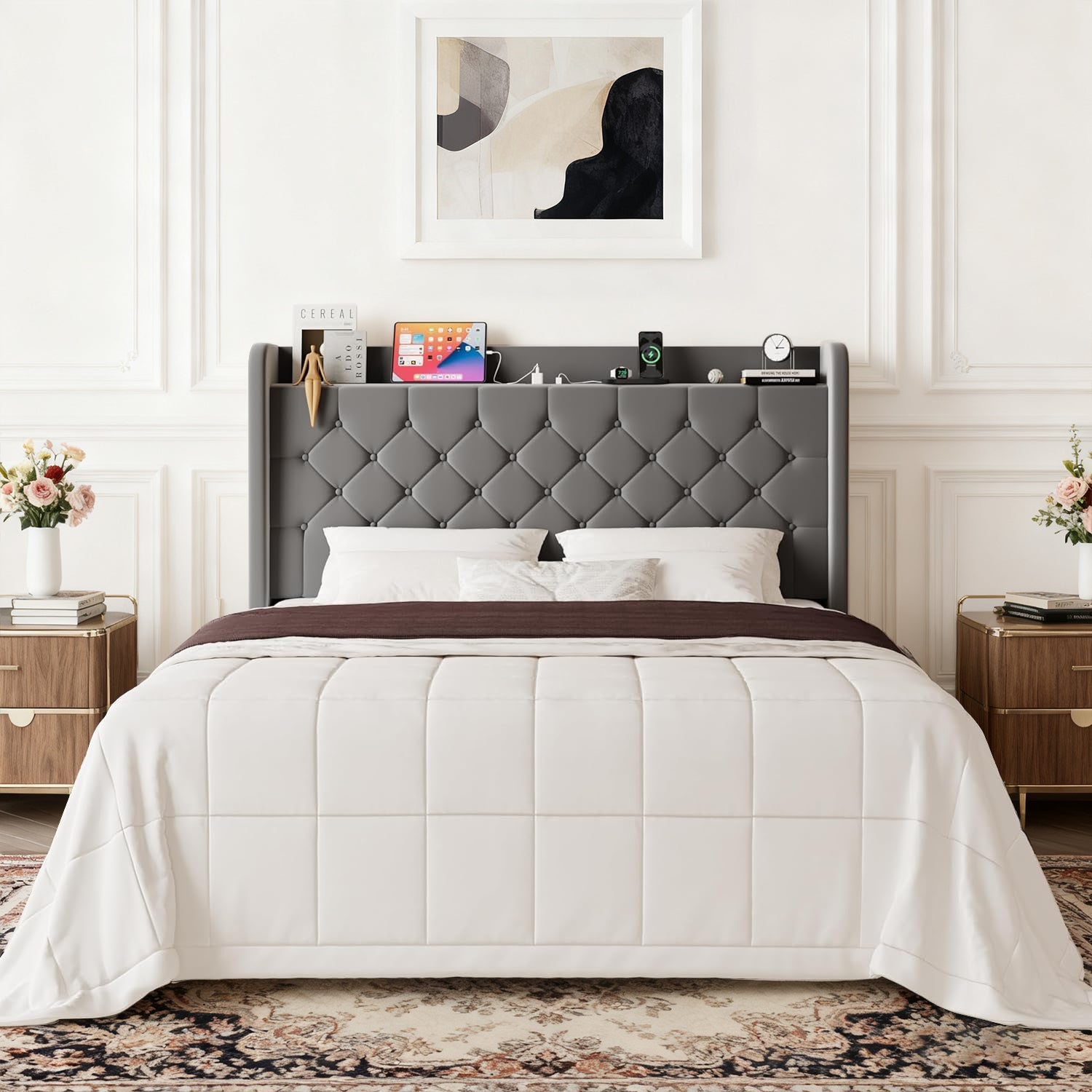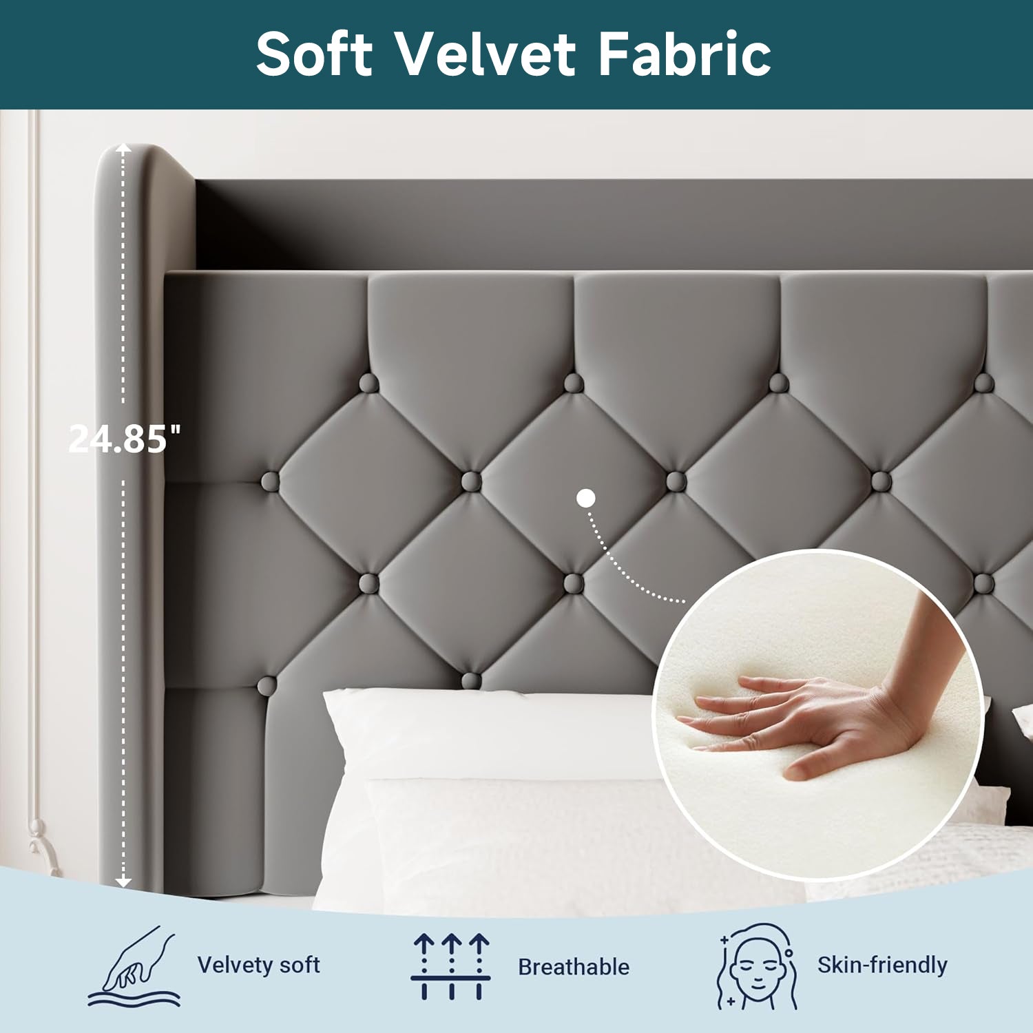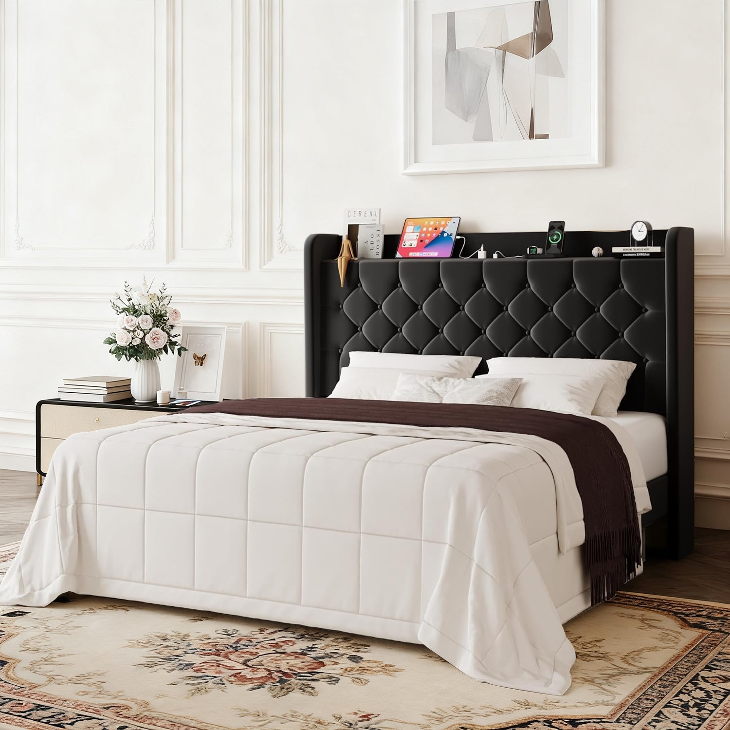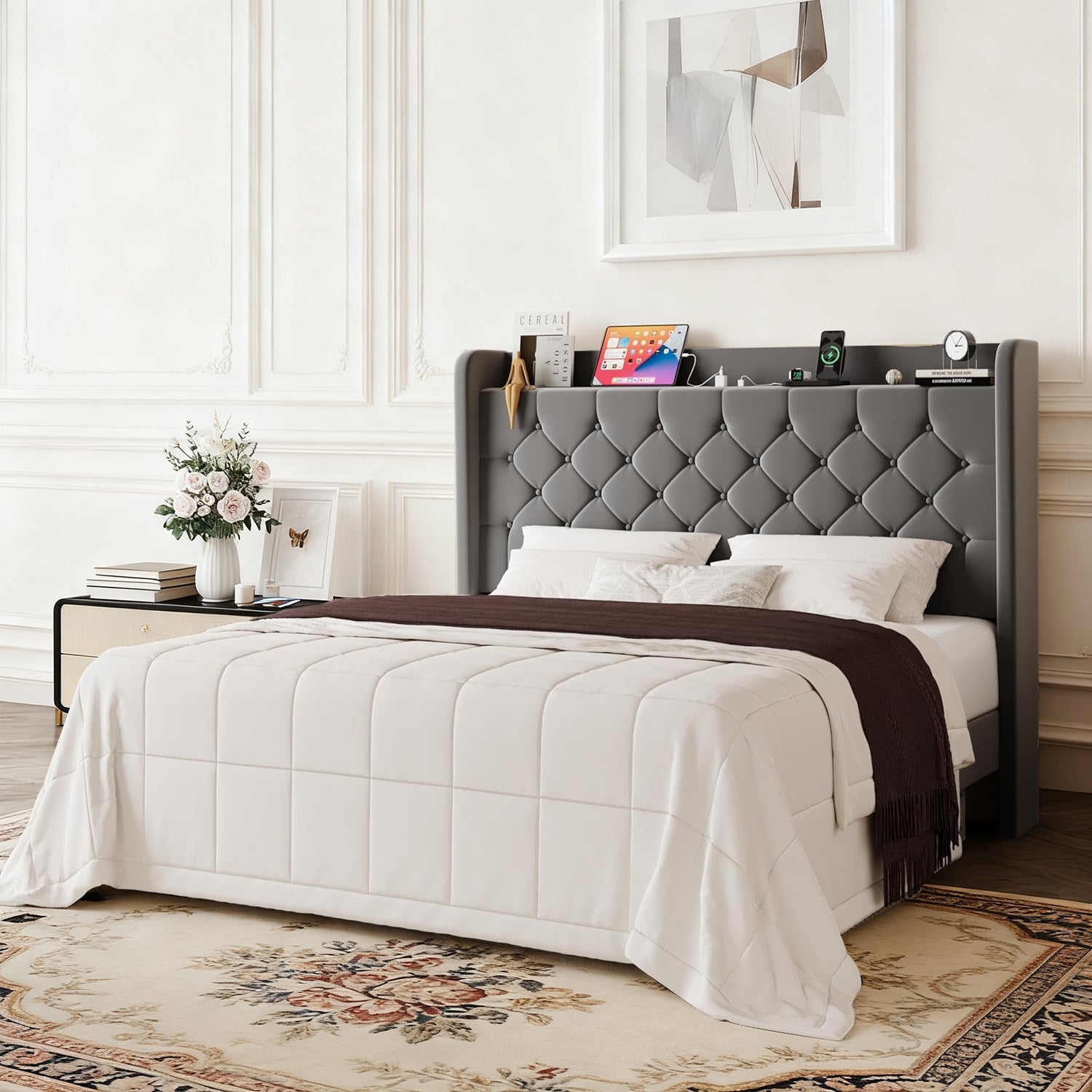 Wingback Velvet Upholstered Bed Frame with Storage Headboard, Charging Station & Button-Tufted Design