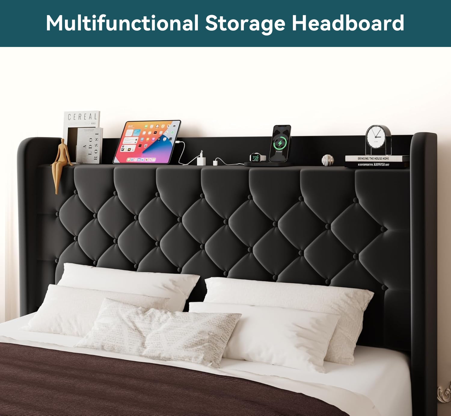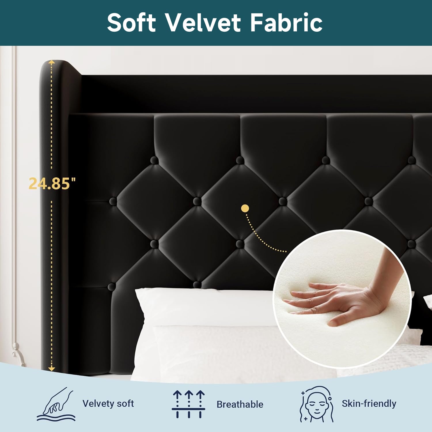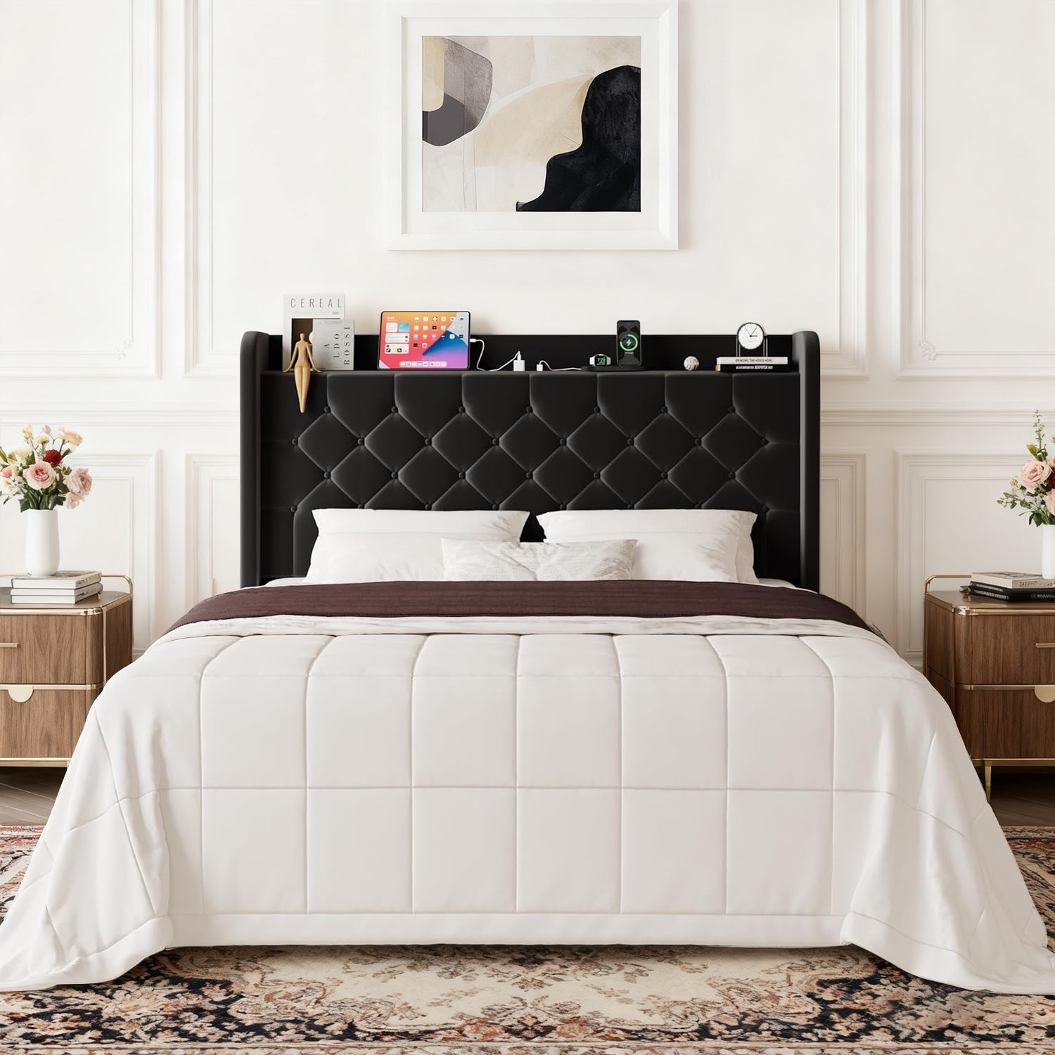 Wingback Velvet Upholstered Bed Frame with Storage Headboard, Charging Station & Button-Tufted Design